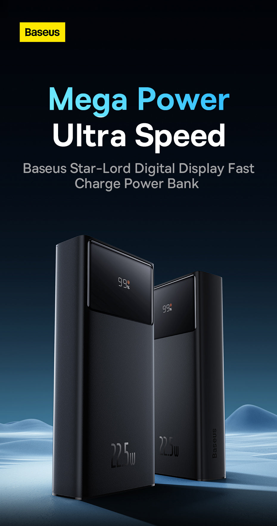 Powerbanka Baseus Star-Lord má kapacitu 30 000 mAh a výstupní výkon až 22,5 W, díky čemuž lze nabíjet až tři zařízení současně.