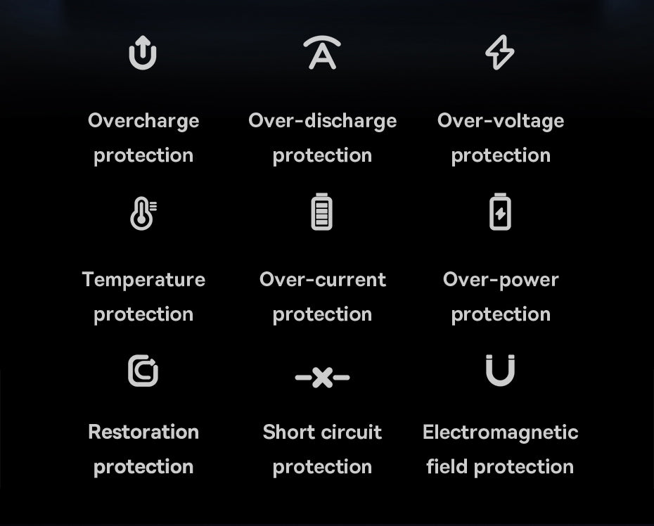 Technologie BPSII a inteligentní čip rozdělují energii a upravují výstupní napětí. LED displej zobrazuje stav nabití. Bezpečnost zajišťují víceúrovňové ochrany proti přehřátí, přepětí, zkratu a nadproudu.