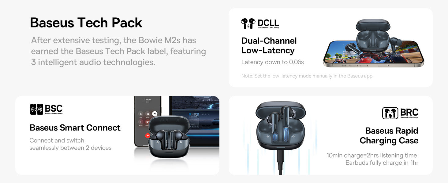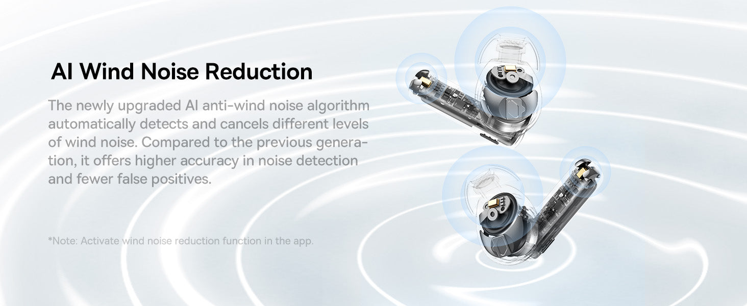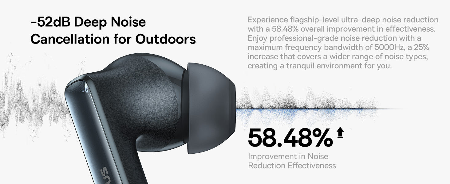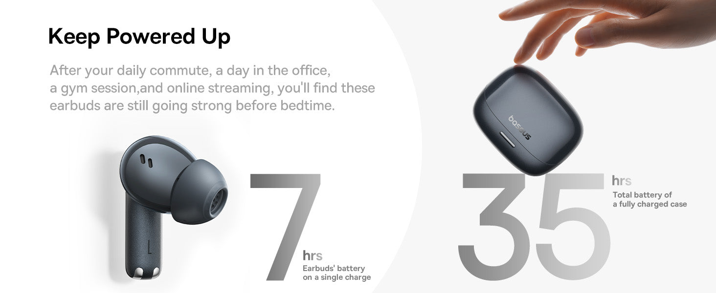 Tato bezdrátová sluchátka kombinují materiály ABS a PC pro odolnost a nízkou hmotnost. Připojení probíhá přes Bluetooth verze 5.4 s dosahem až 10 m, stabilním signálem i ve velmi dobrém pohybu. Výdrž baterie je 7 hodin na sluchátka bez ANC jako nabíjecím pouzdrem dosahuje až 30 hodin poslechu. Baterie ve sluchátkách má kapacitu 35 mAh (0,135 Wh) a nabíjecí pouzdro 400 mAh (1,52 Wh). Plné nabití trvá asi 1 hodinu. Frekvenční odezva dosahuje 20 Hz až 20 kHz, což představuje široké spektrum zvuku. Nabíjecí port je USB-C. Sluchátka jsou kompatibilní s většinou Bluetooth zařízení a vhodná pro bezdrátový poslech na cestách, při práci i v čase.