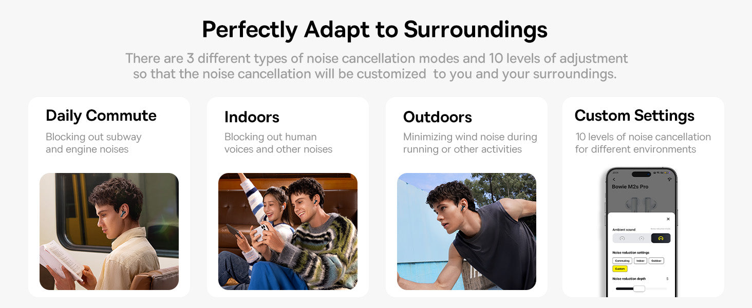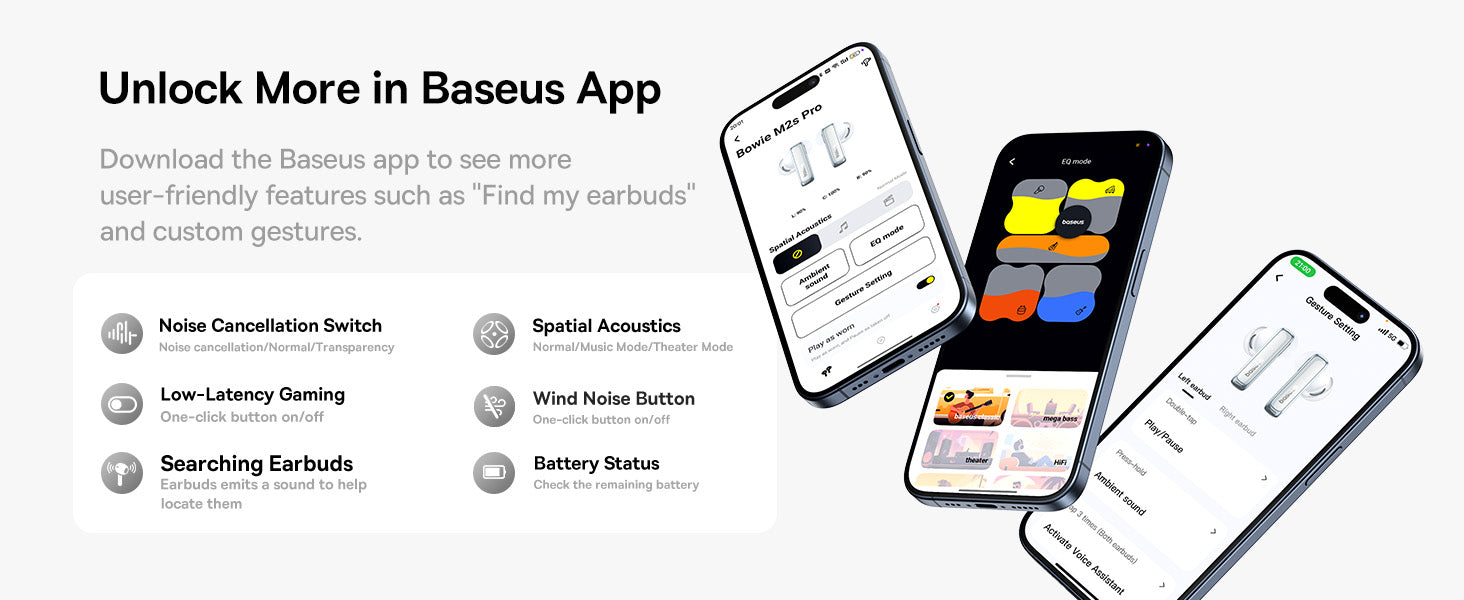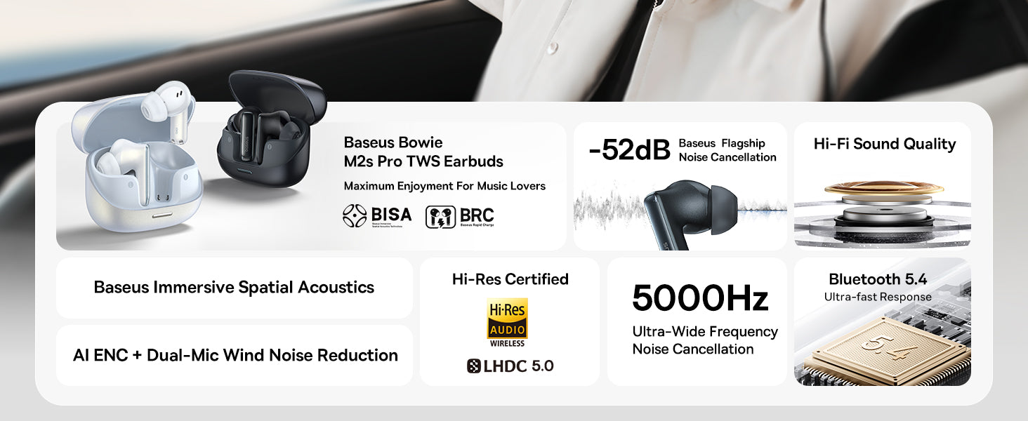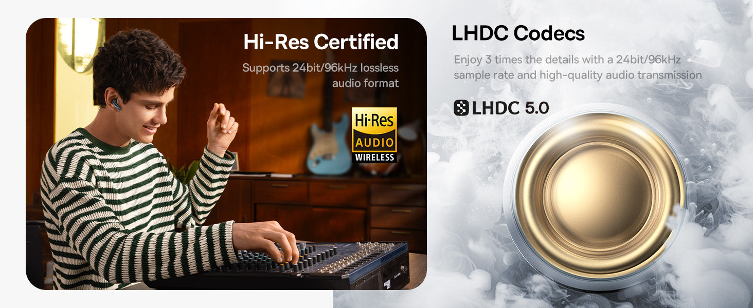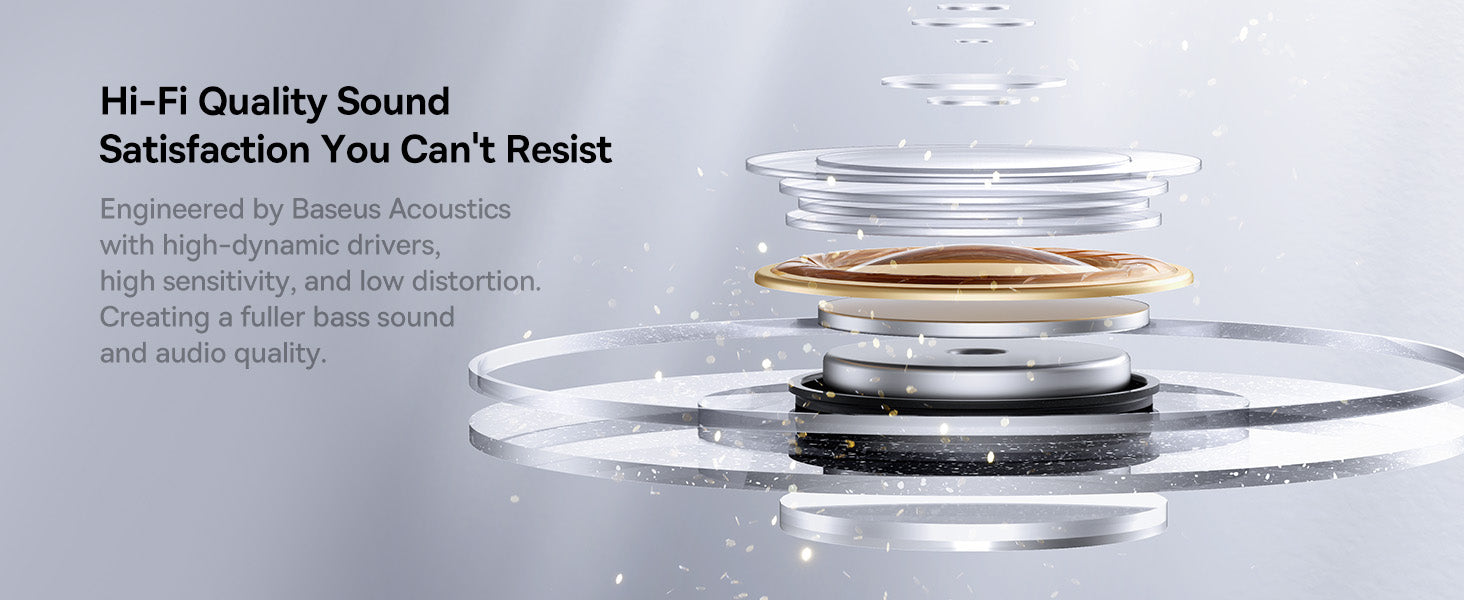 Tato bezdrátová sluchátka kombinují materiály ABS a PC pro odolnost a nízkou hmotnost. Připojení probíhá přes Bluetooth verze 5.4 s dosahem až 10 m, stabilním signálem i ve velmi dobrém pohybu. Výdrž baterie je 7 hodin na sluchátka bez ANC jako nabíjecím pouzdrem dosahuje až 30 hodin poslechu. Baterie ve sluchátkách má kapacitu 35 mAh (0,135 Wh) a nabíjecí pouzdro 400 mAh (1,52 Wh). Plné nabití trvá asi 1 hodinu. Frekvenční odezva dosahuje 20 Hz až 20 kHz, což představuje široké spektrum zvuku. Nabíjecí port je USB-C. Sluchátka jsou kompatibilní s většinou Bluetooth zařízení a vhodná pro bezdrátový poslech na cestách, při práci i v čase.
