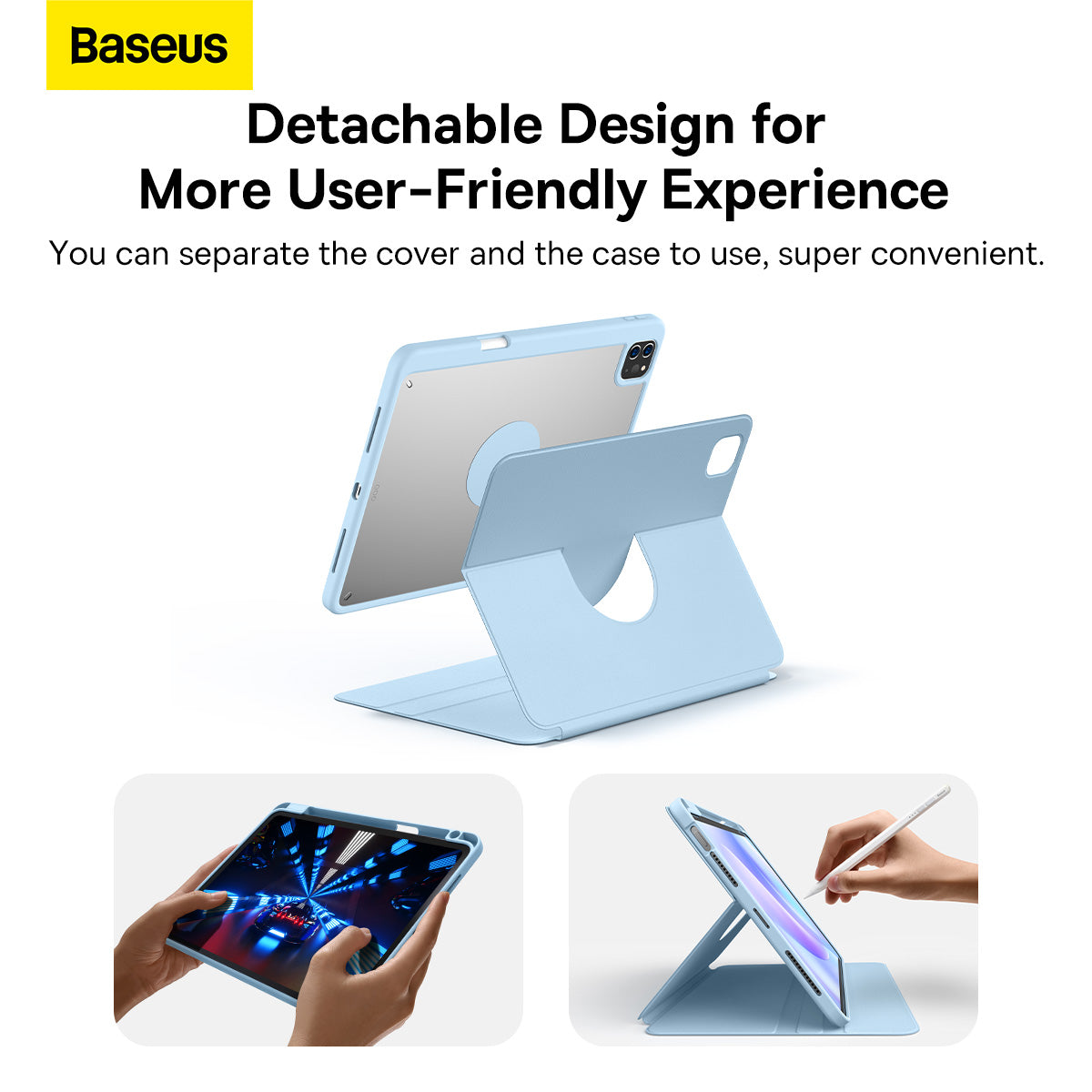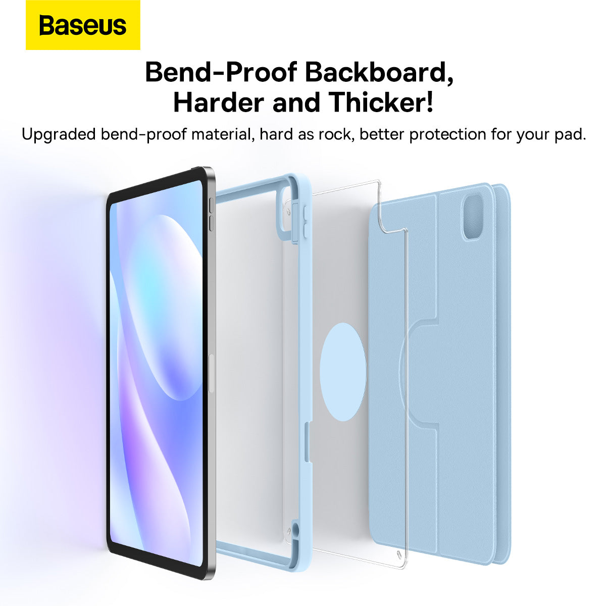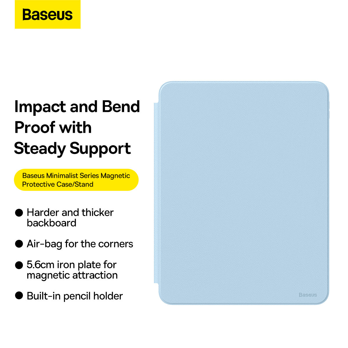 Magnetické ochranné pouzdro od značky Baseus z řady Minimalist chrání iPad před poškozením, poškrábáním a nečistotami. Je tenké a lehké, se zesílenými rohy pro lepší ochranu při pádu a magnetickým zavíráním pro snadné použití. Součástí je praktický vestavěný držák stylusu s bezdrátovým nabíjením a integrovaným stojanem pro kreslení či sledování filmů. Materiál je z PU, který je pevný a zároveň příjemný na dotek. Díky inteligentnímu designu lze pouzdro nastavit různé úhly pro pohodlí a lepší vizuální zážitek.