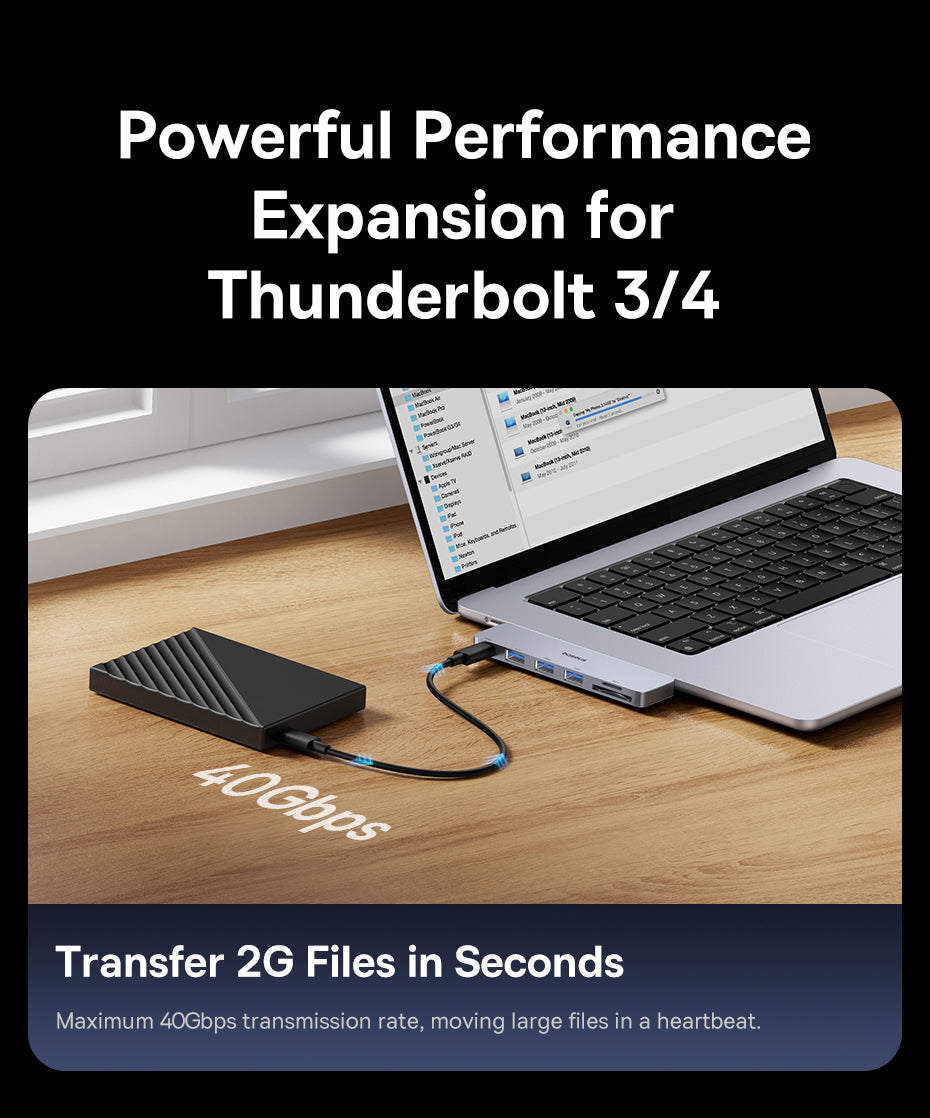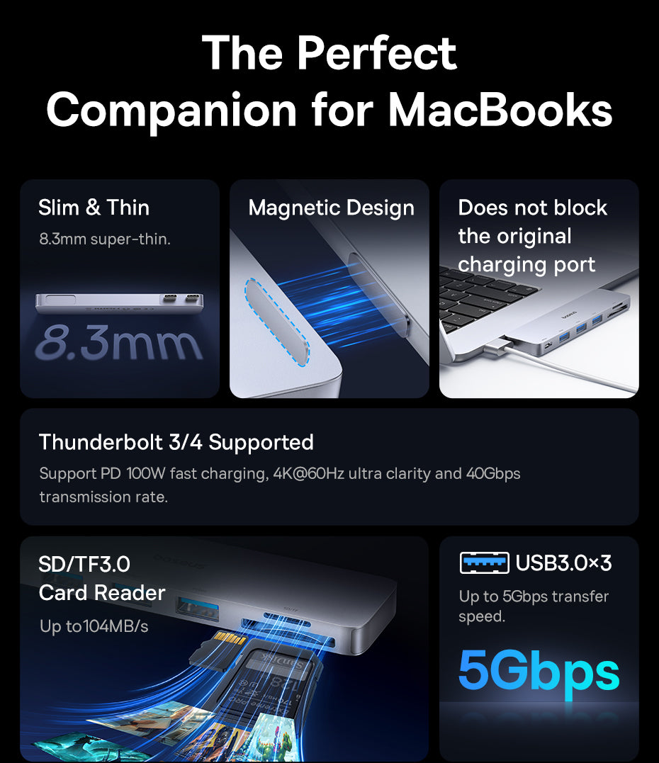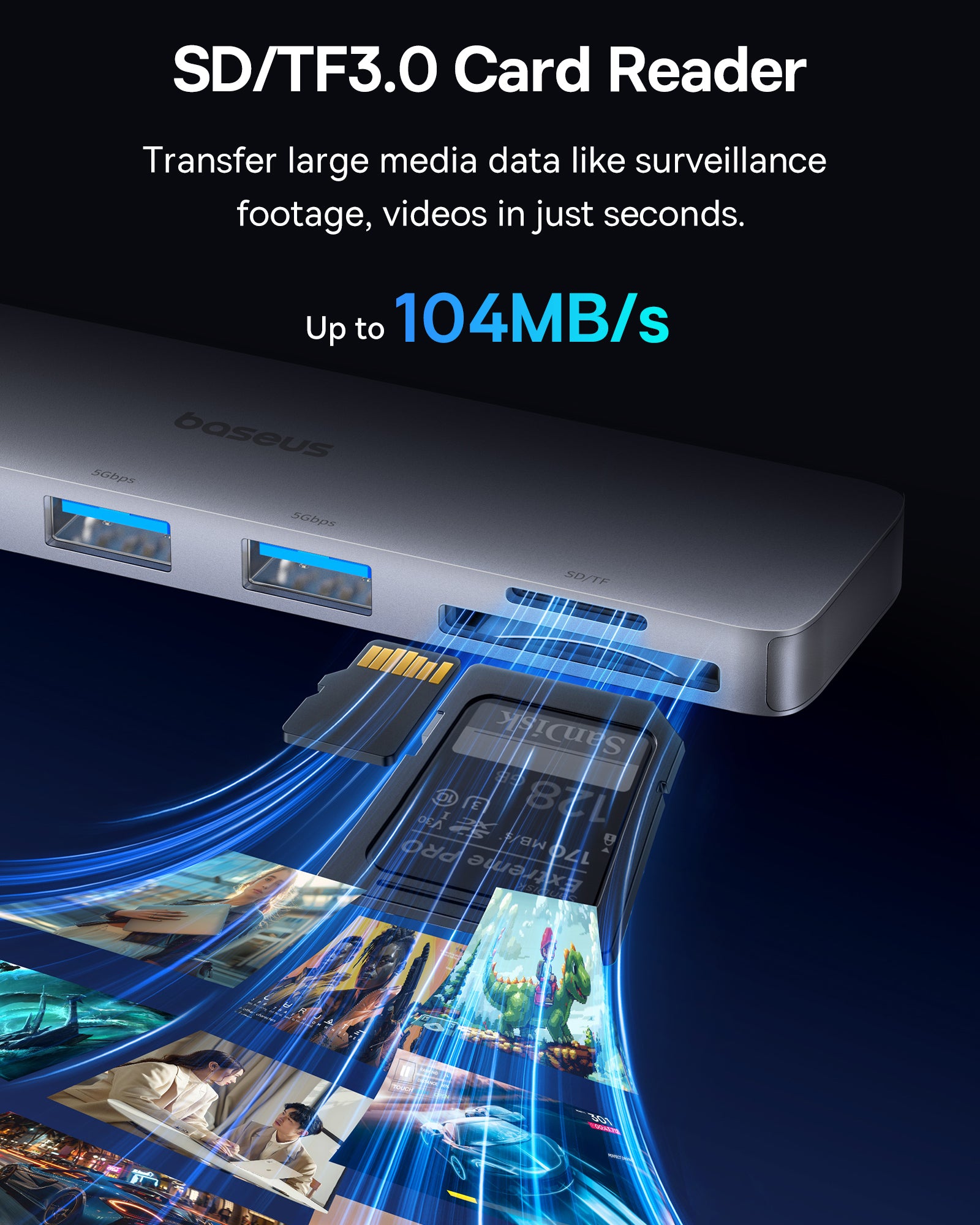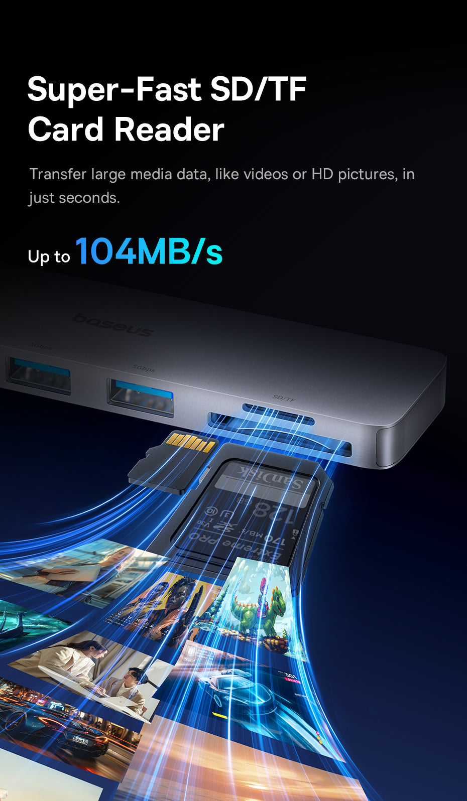 Ultra rychlý přenos až 40 Gb/s přes porty Thunderbolt 4/3 umožňuje rychlé kopírování a zobrazení ve 4K 60 Hz. Magnetické provedení chrání porty a chráněné nálepkou či zablokováním nabíjení. Tělo má jen 8,3 mm, je ultra kompaktní a snadno se vejde do notebooku i do kapsy. Rychlé čtení karet až 104 MB/s urychlí přenos velkých multimediálních souborů. Podpora 100W PD nabíjení umožní rychlé dobití notebooku. Chlazení Baseus Cooling Tech (BCT) zajišťuje stabilní provoz i při plném zatížení. Vhodné pro domácí použití s externím zdrojem energie, kde je kapacita > 10 000 mAh. Vstup: Typ-C (5V/3A; 9V/3A; 15V/3A; 20V/5A). Výstup: USB-C 40 Gb/s; USB 3.0 5 Gb/s; SD/TF 104 MB/s. Kompatibilní se systémy Windows, macOS, Linux a Windows Vista.