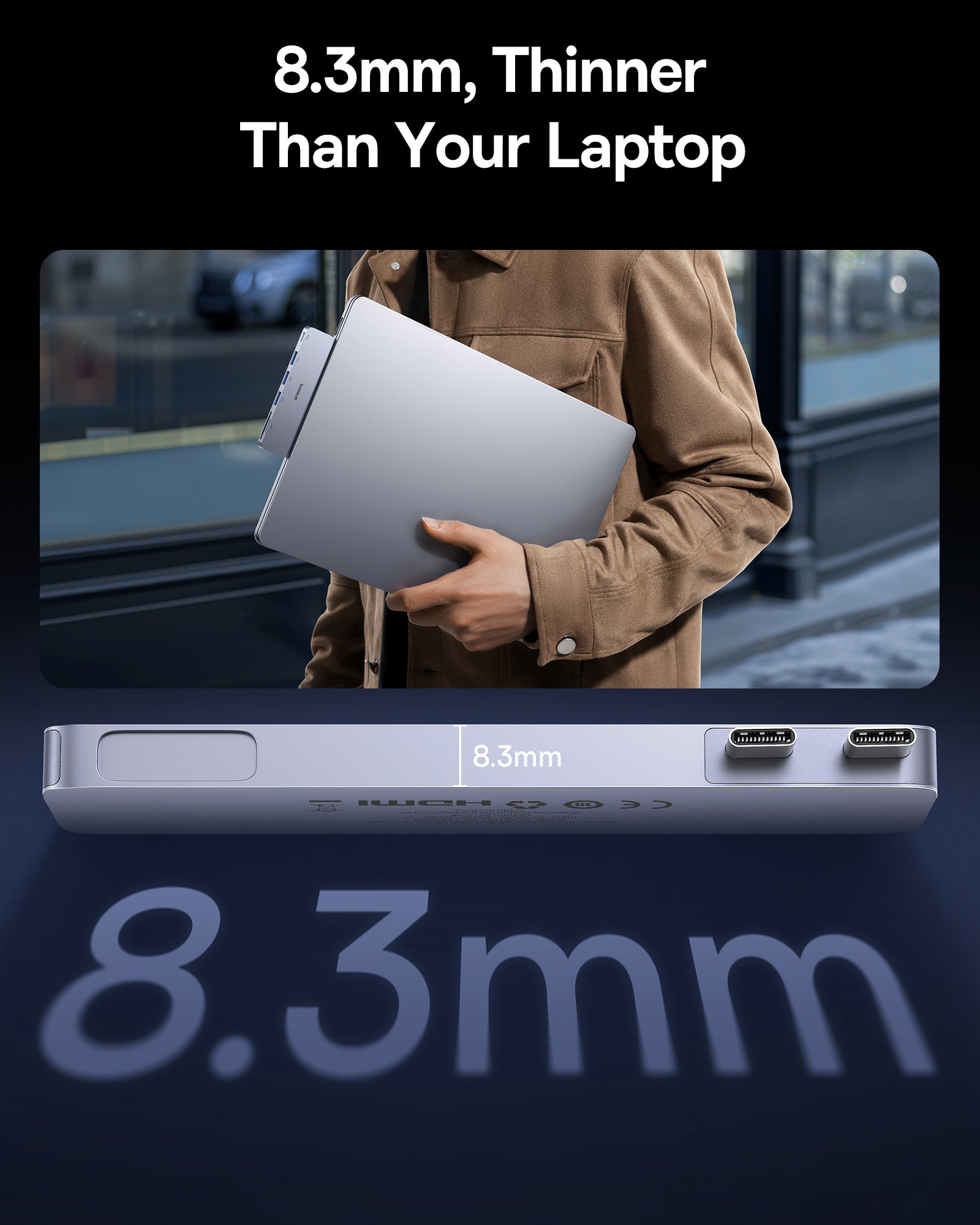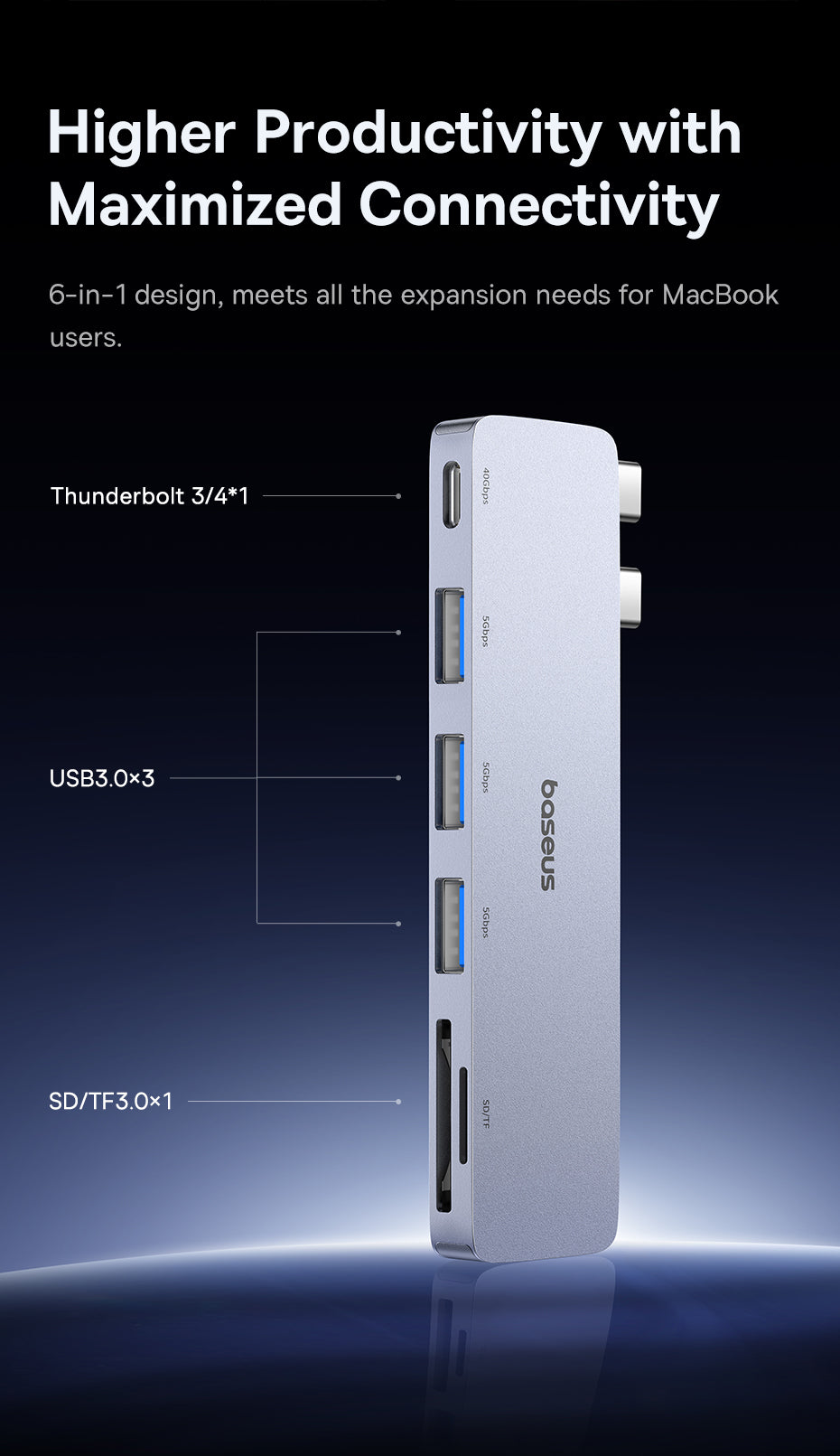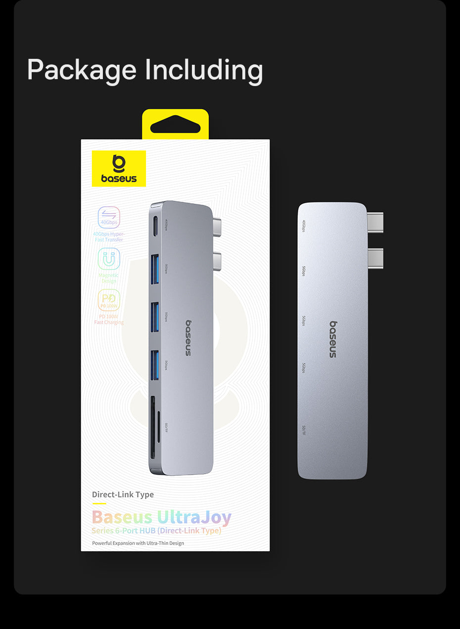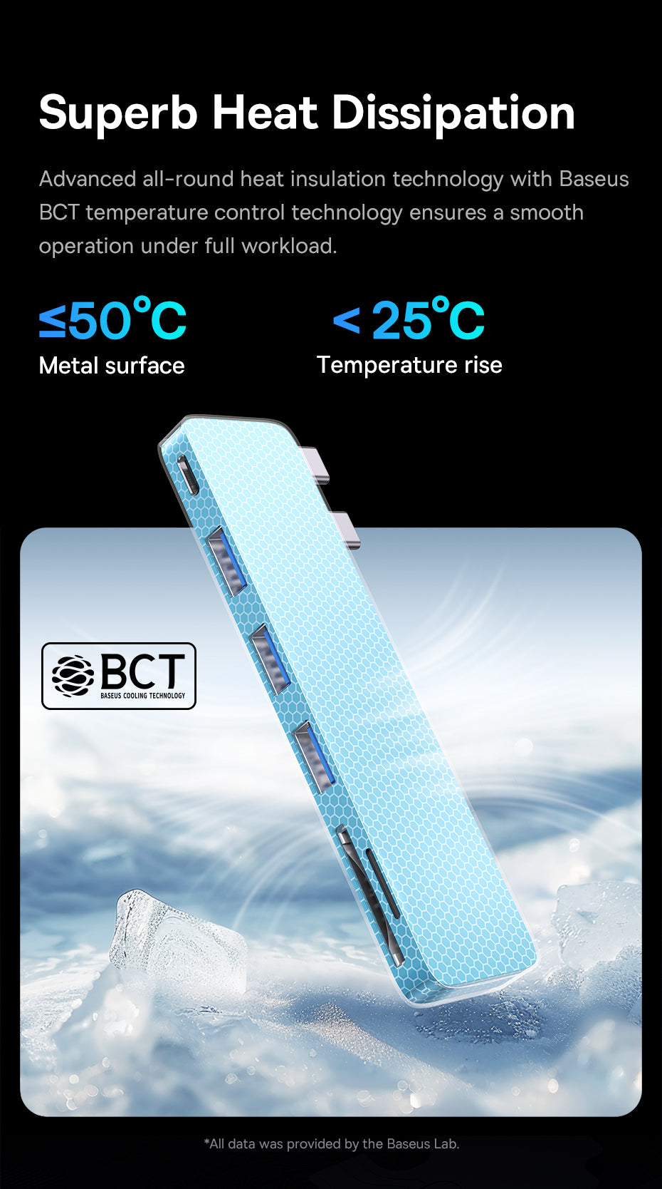 Ultra rychlý přenos až 40 Gb/s přes porty Thunderbolt 4/3 umožňuje rychlé kopírování a zobrazení ve 4K 60 Hz. Magnetické provedení chrání porty a chráněné nálepkou či zablokováním nabíjení. Tělo má jen 8,3 mm, je ultra kompaktní a snadno se vejde do notebooku i do kapsy. Rychlé čtení karet až 104 MB/s urychlí přenos velkých multimediálních souborů. Podpora 100W PD nabíjení umožní rychlé dobití notebooku. Chlazení Baseus Cooling Tech (BCT) zajišťuje stabilní provoz i při plném zatížení. Vhodné pro domácí použití s externím zdrojem energie, kde je kapacita > 10 000 mAh. Vstup: Typ-C (5V/3A; 9V/3A; 15V/3A; 20V/5A). Výstup: USB-C 40 Gb/s; USB 3.0 5 Gb/s; SD/TF 104 MB/s. Kompatibilní se systémy Windows, macOS, Linux a Windows Vista.
