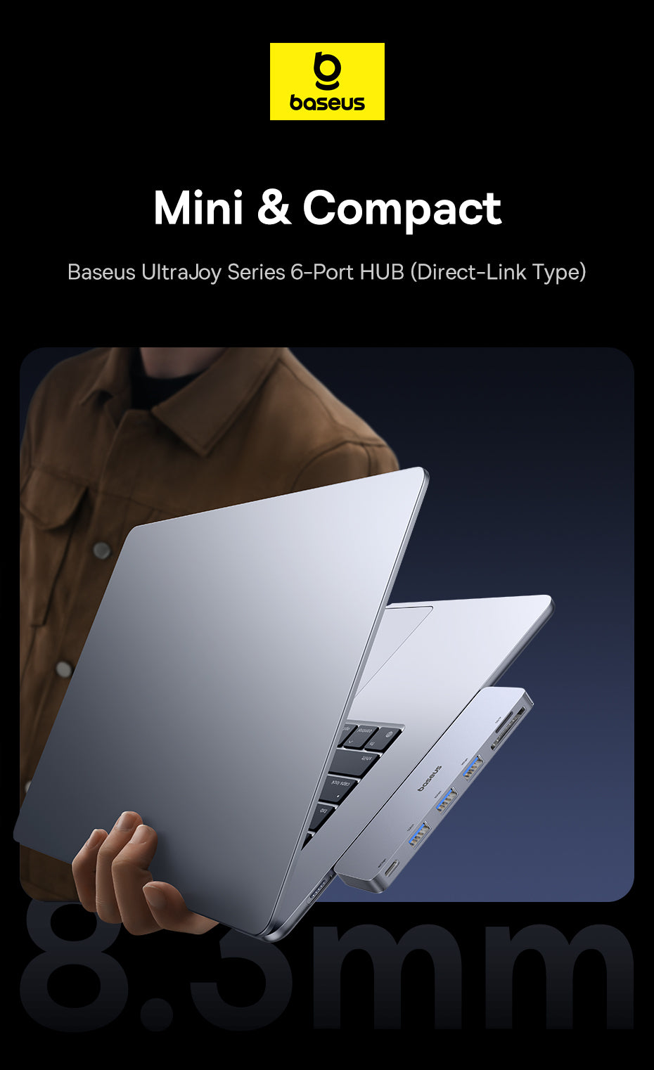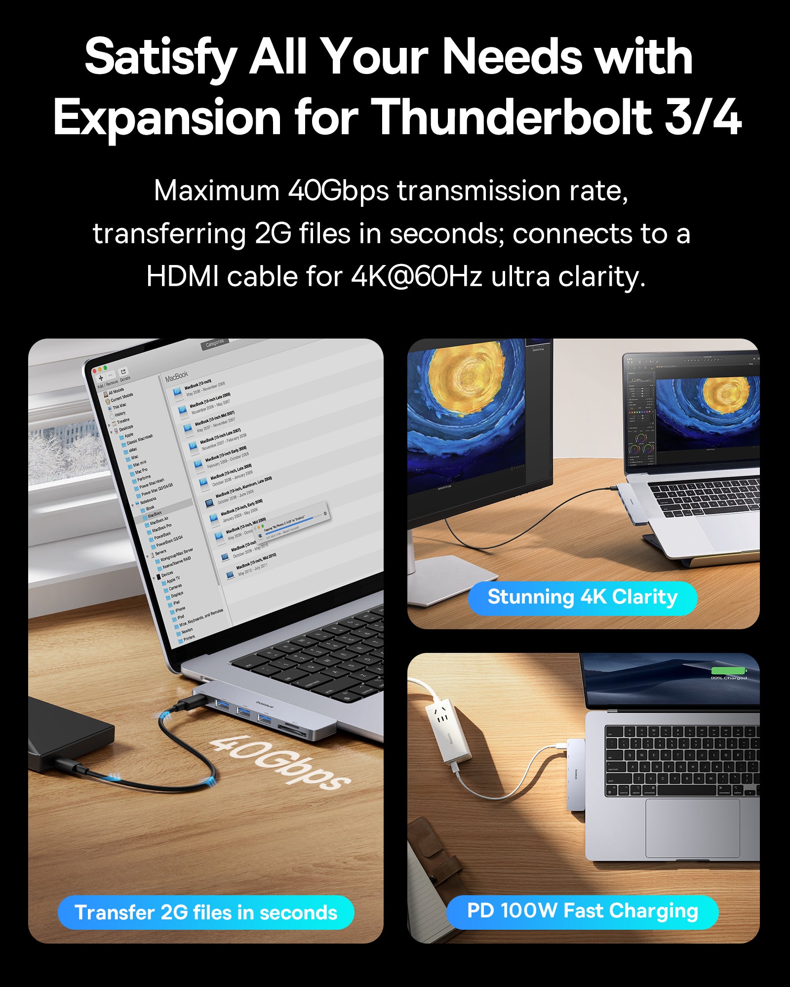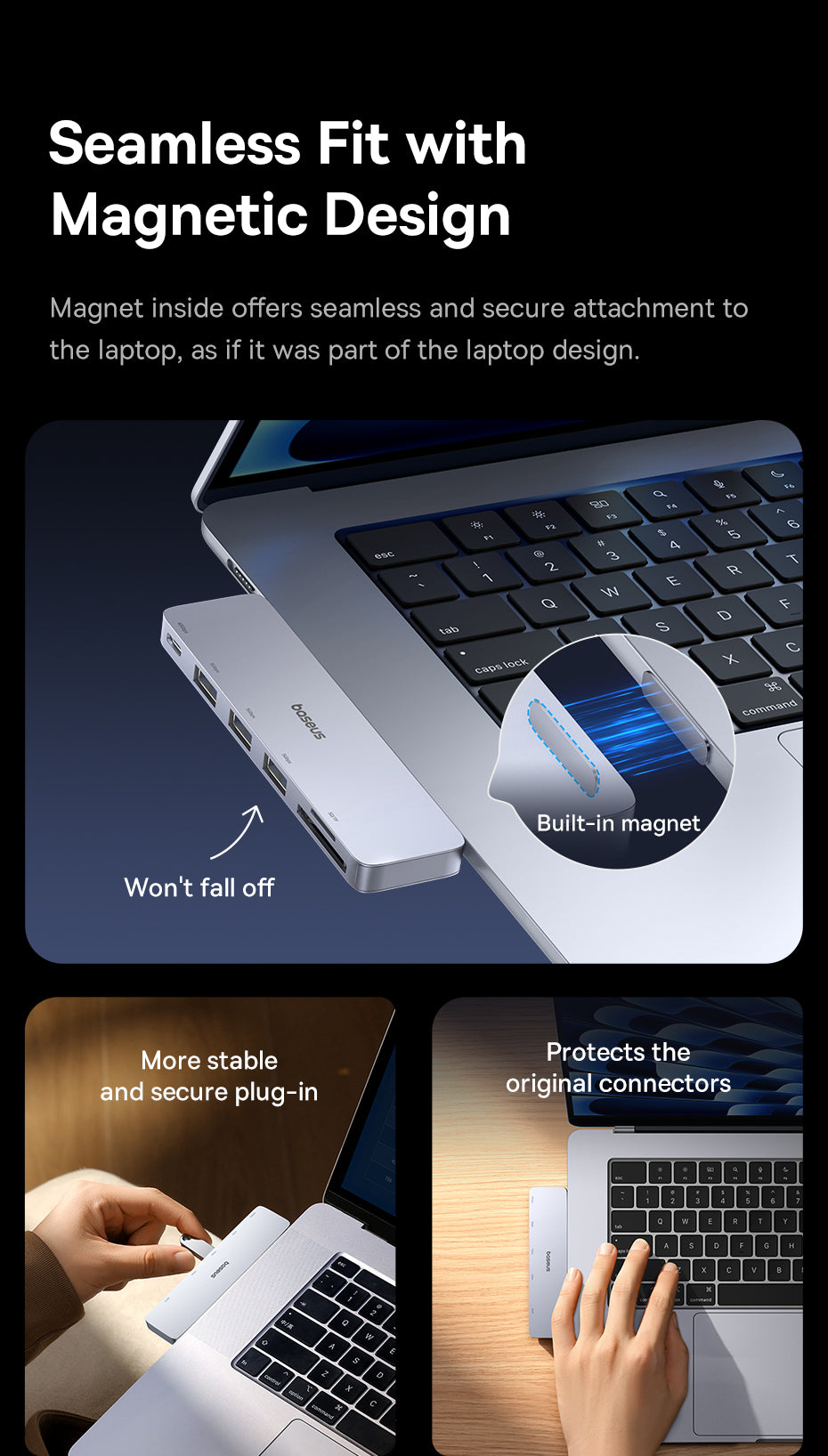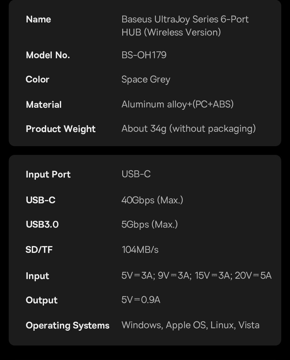 Ultra rychlý přenos až 40 Gb/s přes porty Thunderbolt 4/3 umožňuje rychlé kopírování a zobrazení ve 4K 60 Hz. Magnetické provedení chrání porty a chráněné nálepkou či zablokováním nabíjení. Tělo má jen 8,3 mm, je ultra kompaktní a snadno se vejde do notebooku i do kapsy. Rychlé čtení karet až 104 MB/s urychlí přenos velkých multimediálních souborů. Podpora 100W PD nabíjení umožní rychlé dobití notebooku. Chlazení Baseus Cooling Tech (BCT) zajišťuje stabilní provoz i při plném zatížení. Vhodné pro domácí použití s externím zdrojem energie, kde je kapacita > 10 000 mAh. Vstup: Typ-C (5V/3A; 9V/3A; 15V/3A; 20V/5A). Výstup: USB-C 40 Gb/s; USB 3.0 5 Gb/s; SD/TF 104 MB/s. Kompatibilní se systémy Windows, macOS, Linux a Windows Vista.