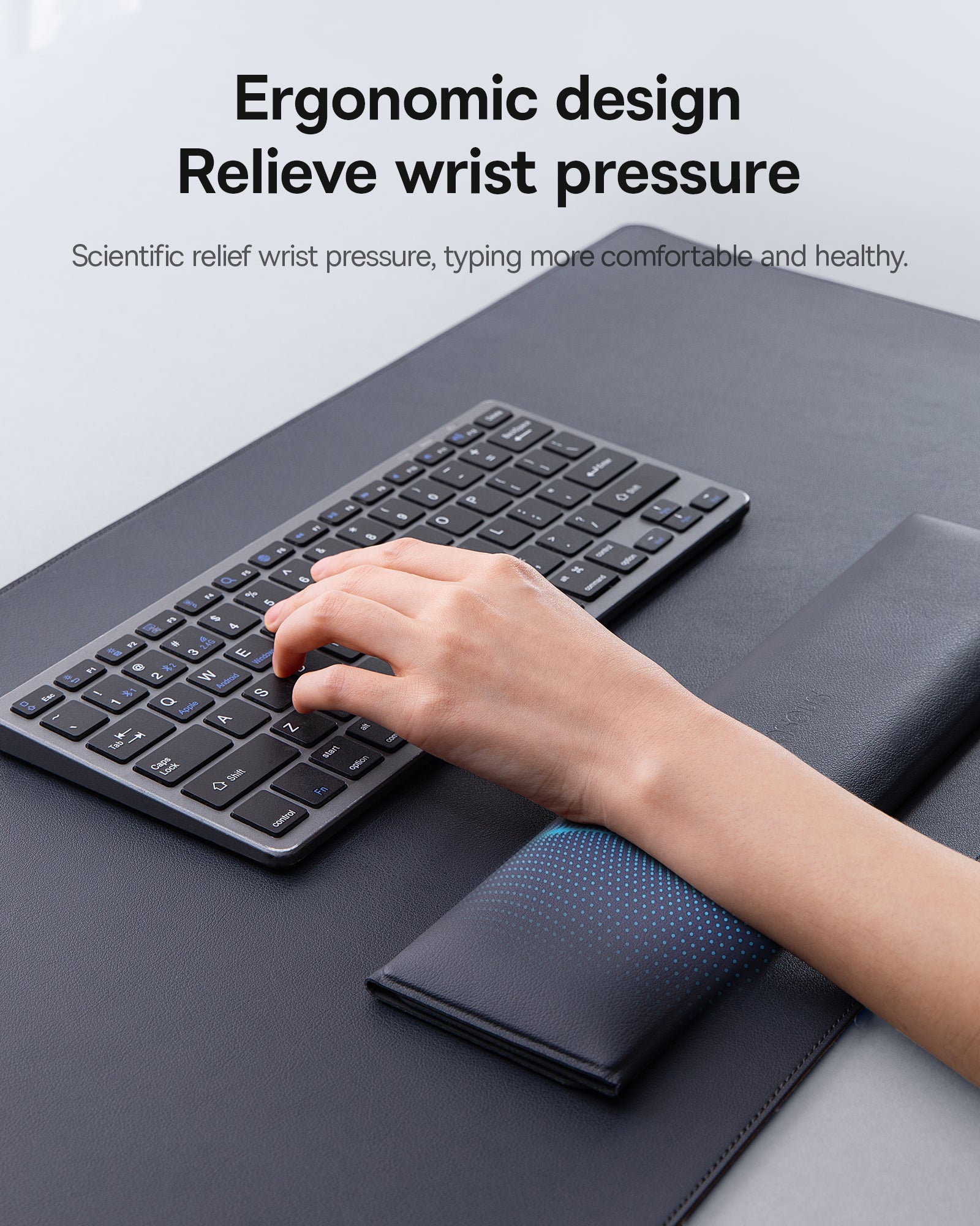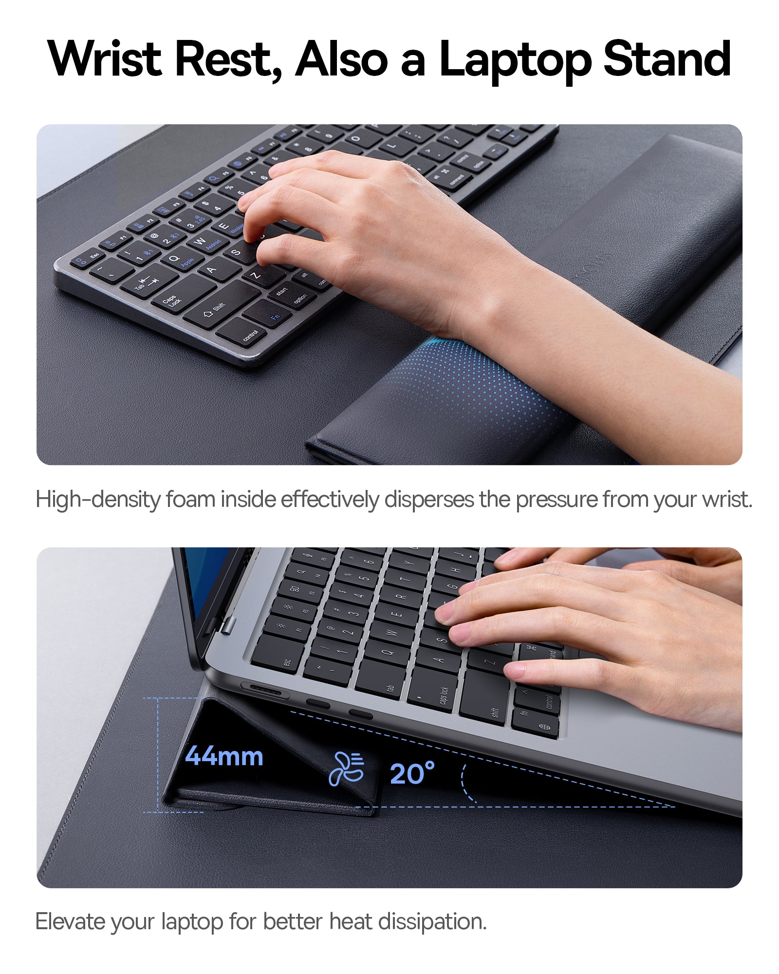 Příslušenství nabízí oporu zápěstí díky pěně s vysokou hustotou, která rozptyluje tlak a snižuje. Stojánek zvedá notebook a zlepšuje proudění vzduchu, čímž napomáhá chlazení. Okraje jsou prošité, což zvyšuje odolnost vůči opotřebení. Ideální pro uživatele, kteří hledají funkčnost a estetiku na pracovním stole.