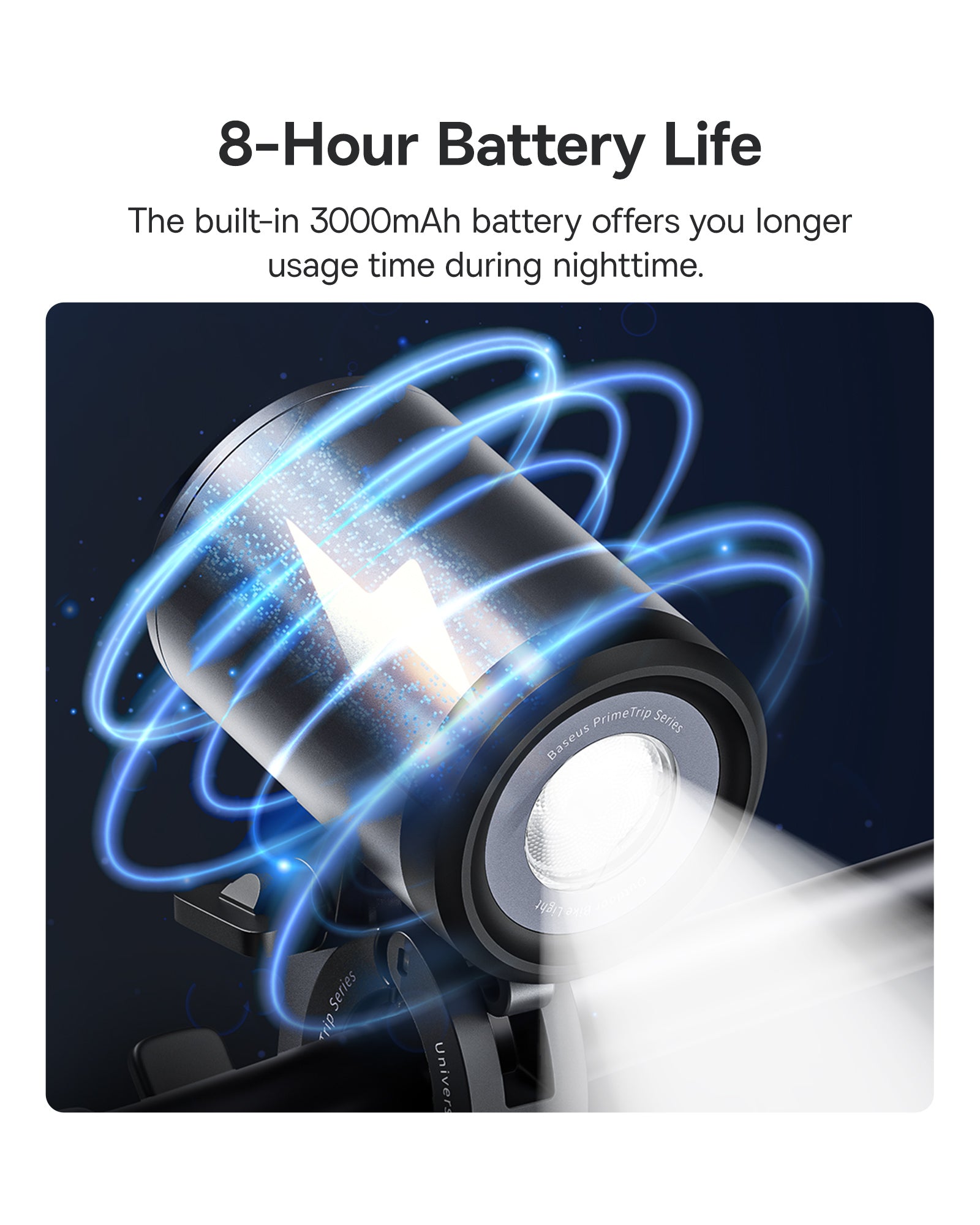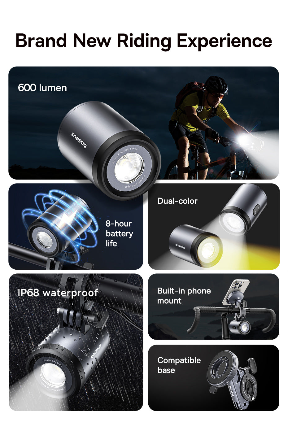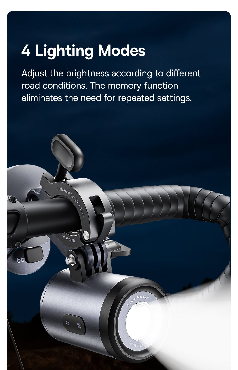 4 režimy osvětlení: vysoký, střední, nízký a SOS blikání pro různá jízdní prostředí. IP68 vodotěsnost a odolná konstrukce zajišťující ochranu v dešti a náročných podmínkách. Baterie 3000mAh poskytuje až 10 hodin výdrže; dobíjení probíhá přes USB-C pro rychlé doplnění energie. Protiskluzová a nárazuvzdorná konštrukcia udržiava telefon stabilní pro GPS navigaci a hands-free jízdu. Nastavitelný držák na řídítka je kompatibilní s různými velikostmi řídítek, což představuje montáž na různá kola.