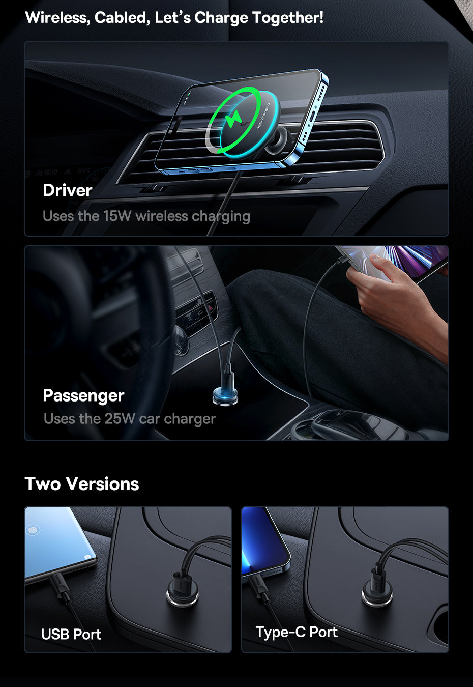 Rychlé bezdrátové nabíjení dosahují až 15 W k dispozici je USB‑C port s výstupem až 25 W, což zajistí rychlý start i při jízdě. S ochranným systémem proti přehřátí, přetížení a přepětí je zajištěna bezpečnost provozu.