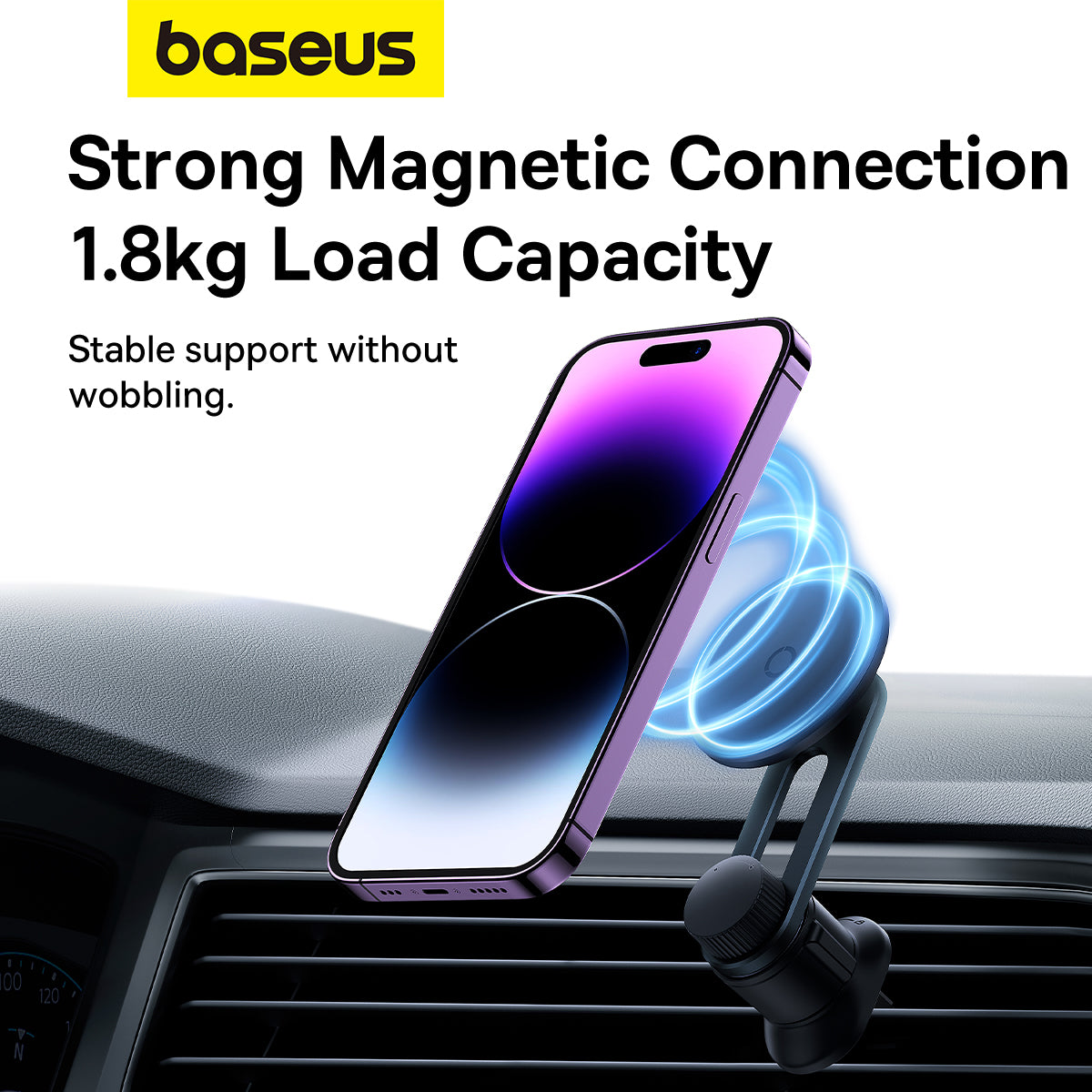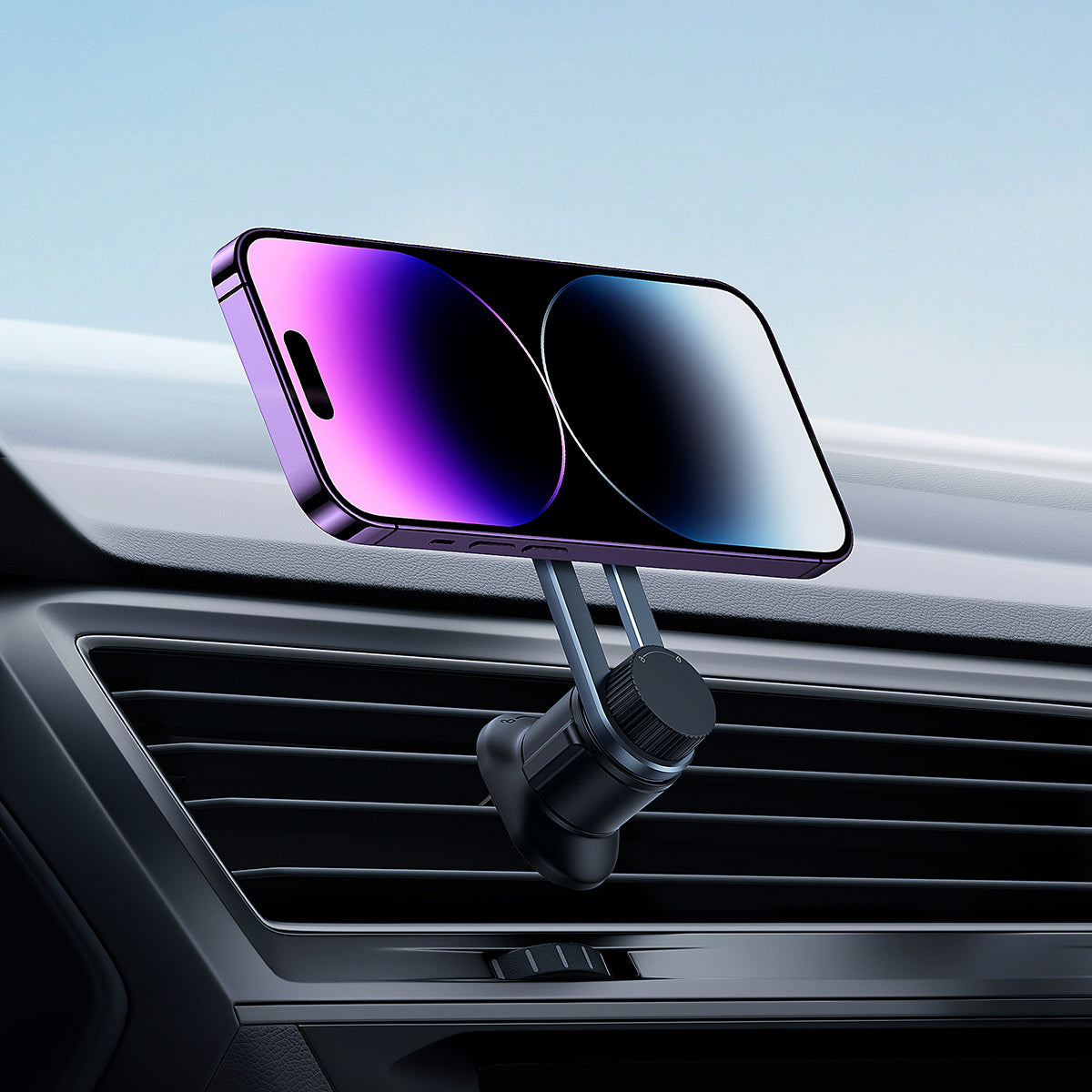 Baseus MagPro – magnetický držák telefonu do auta je robustní a široce kompatibilní. Drží telefon pevně i na nerovných silnicích díky dvouvrstvým neodymovým magnetům N52 s nosností až 1,8 kg a vylepšenému uchycení na mřížku ventilačního otvoru. Umožňuje nastavení polohy a otočení o 360°, výšku lze upravit pro pohodlné sledování navigace. Tělo je zinkové slitiny s matnou úpravou, což zajišťuje stylový vzhled a odolnost a držák nepřekáže ventilační mřížce. Kompatibilita je široká – většina chytrých telefonů; pokud má telefon zabudované magnety, stačí bez dalších dílů, v opačném případě lze použít magnetické pouzdro nebo kroužek. Silikonová podložka chrání telefon před poškrábáním. V balení najdete 2 kovové desky, instalační kartu, PE fólii a hadřík napuštěný alkoholem.