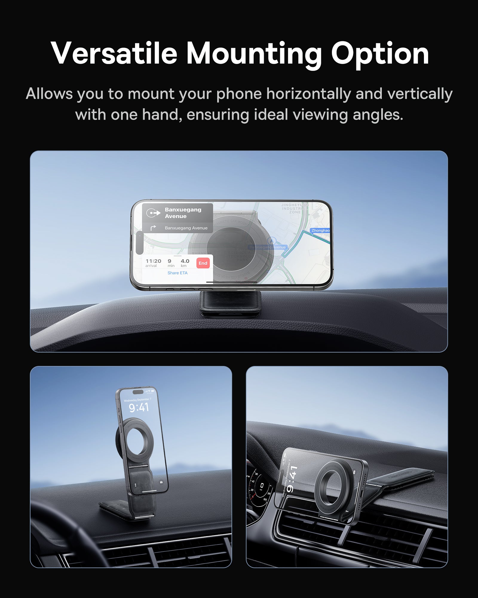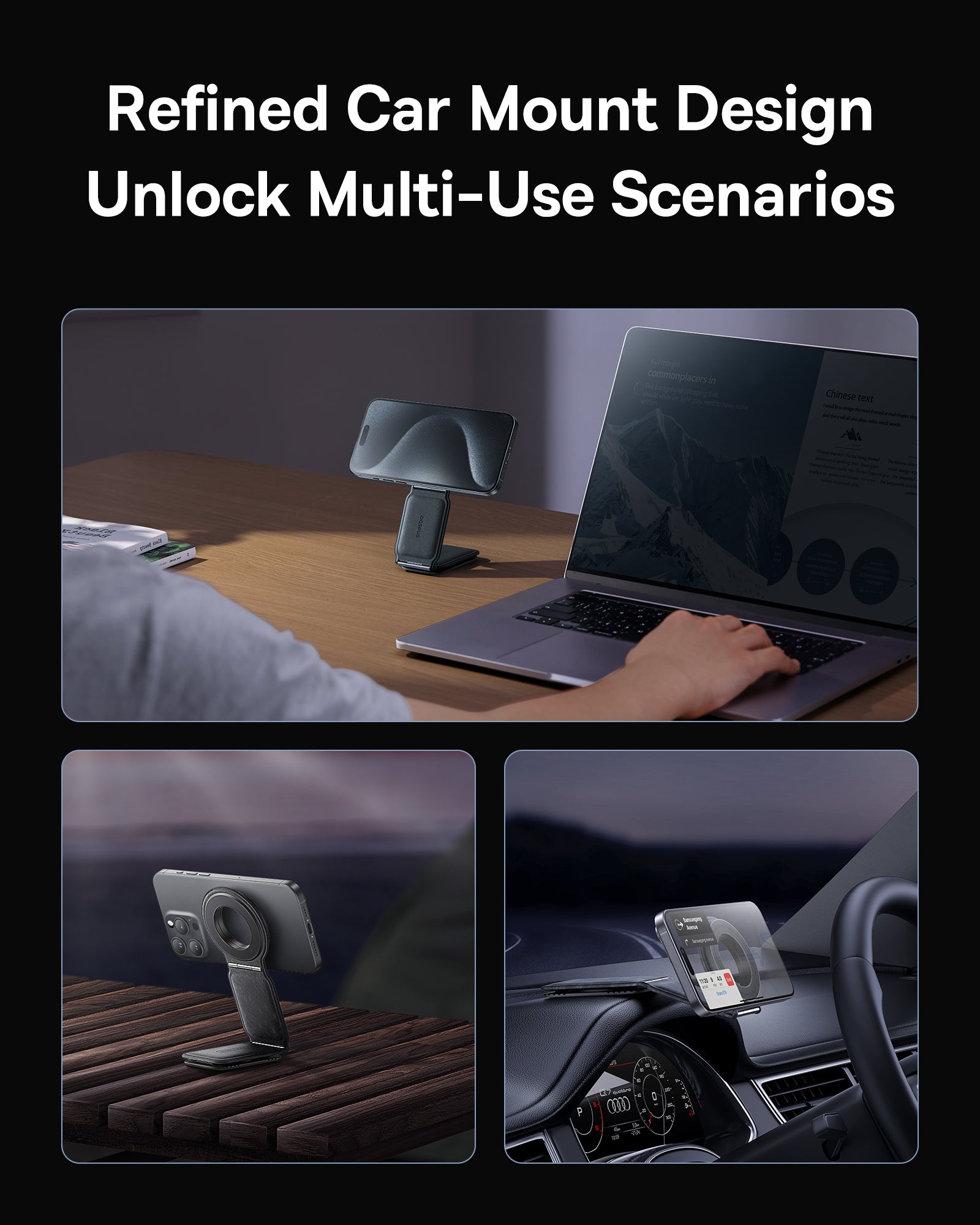 Otočný magnetický držák s 360° otočením a dvouosým skládacím designem pro flexibilní nastavení na palubních deskách automobilů, obrazovkách Tesla a stolních počítačů. Skládací design skrývá držák pro čisté prostředí.