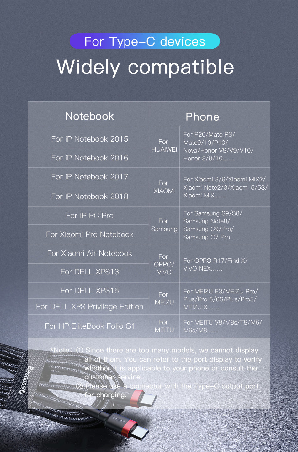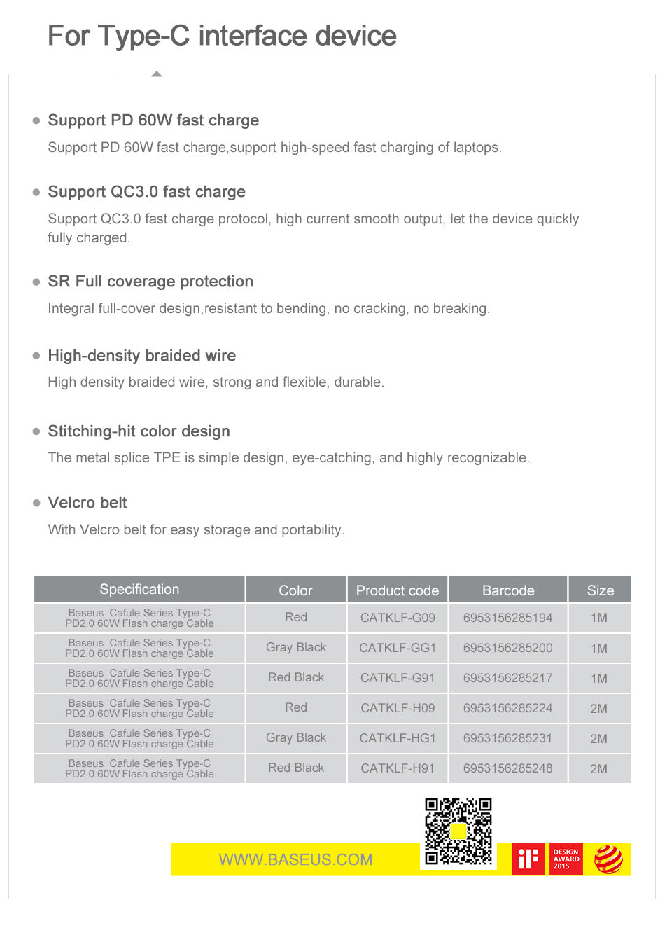Podporuje rychlé nabíjení QC 3.0 a Power Delivery; PD umožňuje nabíjet i notebooky. Součástí balení je pásek na suchý zip pro snadné přenášení a skladování. Konektory jsou odolné proti opotřebení a oxidaci. Inteligentní řízení nabíjení chrání baterie a přebíjení. Kompatibilní se zařízeními s konektorem USB-C.