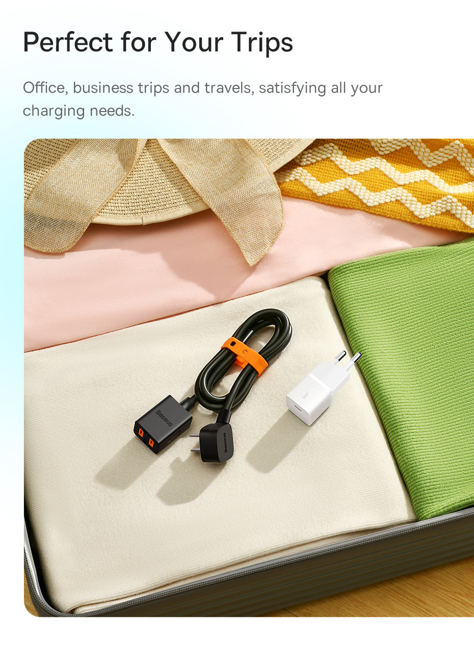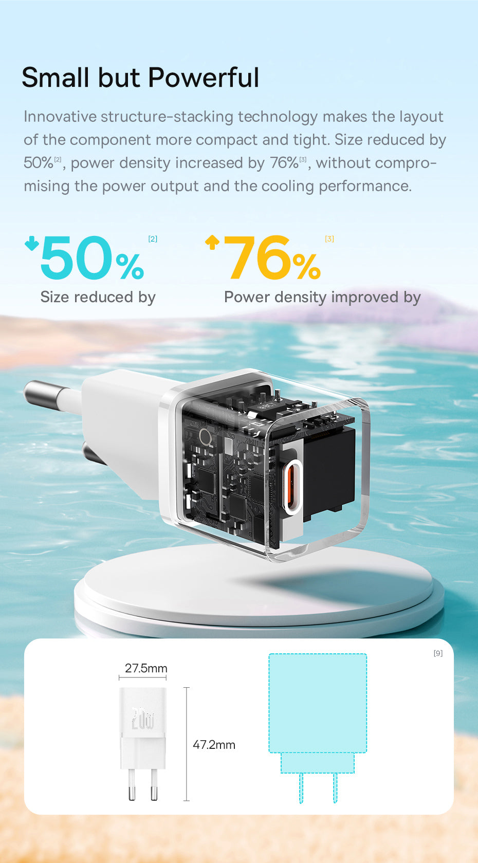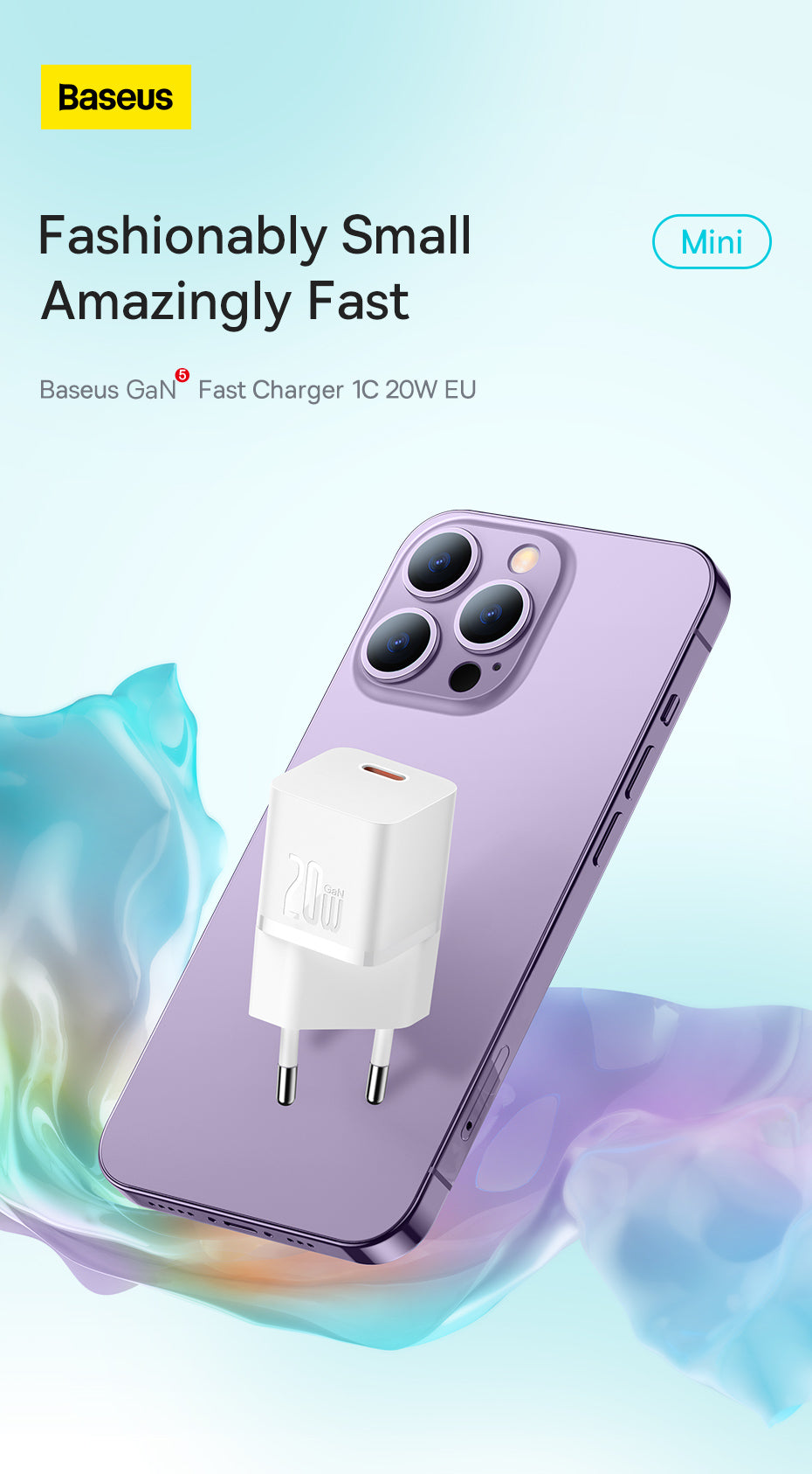 Baseus GaN5 20W mini síťová nabíječka je kompaktní, lehká a výkonná. Díky technologii GaN je až o 50 % menší než běžné nabíječky, přesto nabízí výkon 20 W. Umožňuje rychlé nabití až 50 % kapacity telefonu za přibližně 26 minut. Nabíječka využívá inteligentní řízení teploty BCT a snižuje teplotu až o 10 % ve srovnání s klasickými nabíječkami, což zvyšuje bezpečnost při nabíjení. Funkce pro noční nabíjení znovu nabíjení a automaticky převede nabíjení do záložního režimu, aby nedošlo k přebíjení. Disponuje ochrannými prvky proti nadměrnému výkonu, přepětí a rušení je vhodné pro bezpečné a efektivní nabíjení. Vstup AC 100-240 V ~ 50/60 Hz, výstup typu C 5 V/3 A a 9 V/2,22 A. Rozměry 47,2 × 27,5 mm, hmotnost 37 g, materiál PC, barva černá. Model CCGN050101, výrobce Baseus.