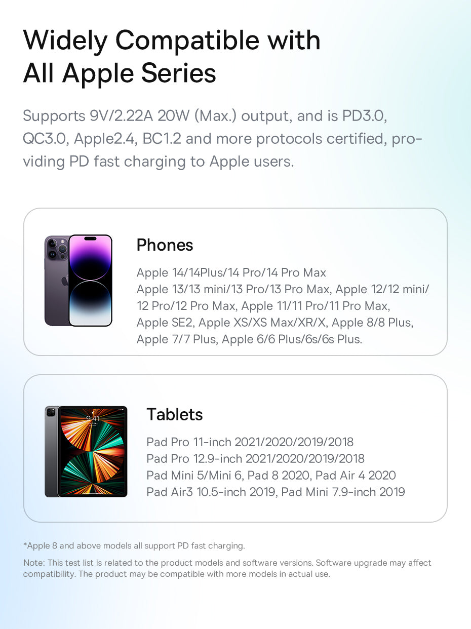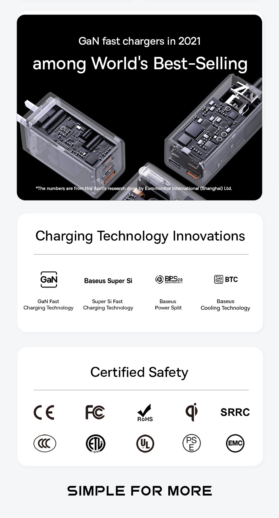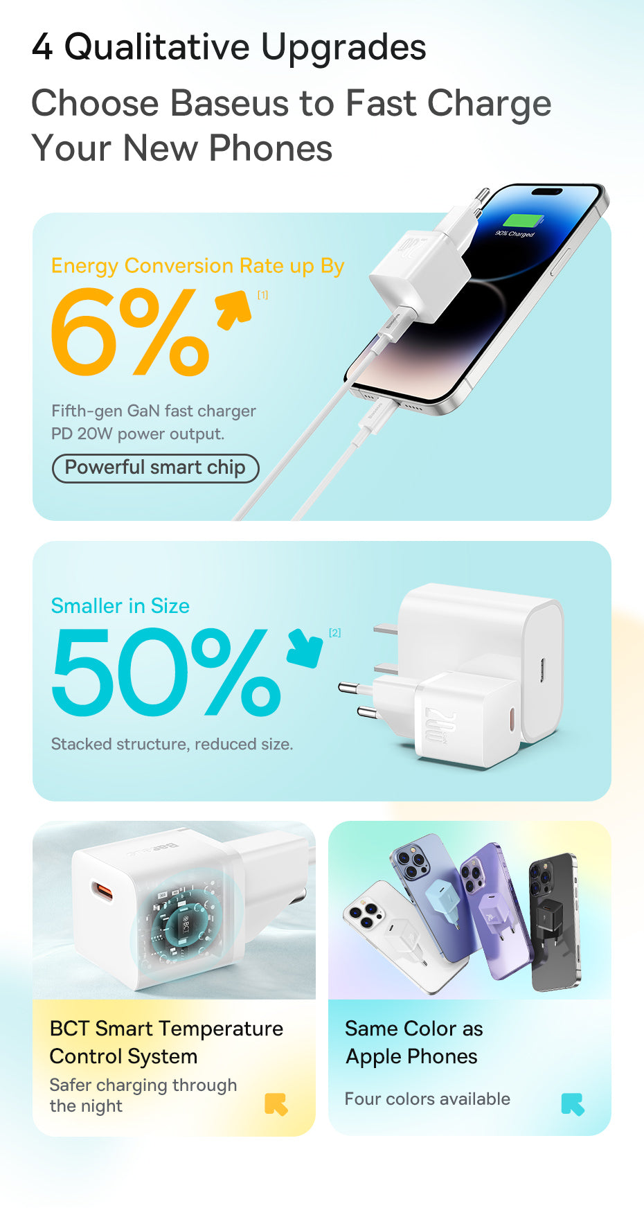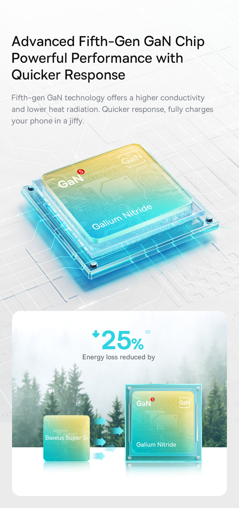 Baseus GaN5 20W mini síťová nabíječka je kompaktní, lehká a výkonná. Díky technologii GaN je až o 50 % menší než běžné nabíječky, přesto nabízí výkon 20 W. Umožňuje rychlé nabití až 50 % kapacity telefonu za přibližně 26 minut. Nabíječka využívá inteligentní řízení teploty BCT a snižuje teplotu až o 10 % ve srovnání s klasickými nabíječkami, což zvyšuje bezpečnost při nabíjení. Funkce pro noční nabíjení znovu nabíjení a automaticky převede nabíjení do záložního režimu, aby nedošlo k přebíjení. Disponuje ochrannými prvky proti nadměrnému výkonu, přepětí a rušení je vhodné pro bezpečné a efektivní nabíjení. Vstup AC 100-240 V ~ 50/60 Hz, výstup typu C 5 V/3 A a 9 V/2,22 A. Rozměry 47,2 × 27,5 mm, hmotnost 37 g, materiál PC, barva černá. Model CCGN050101, výrobce Baseus.