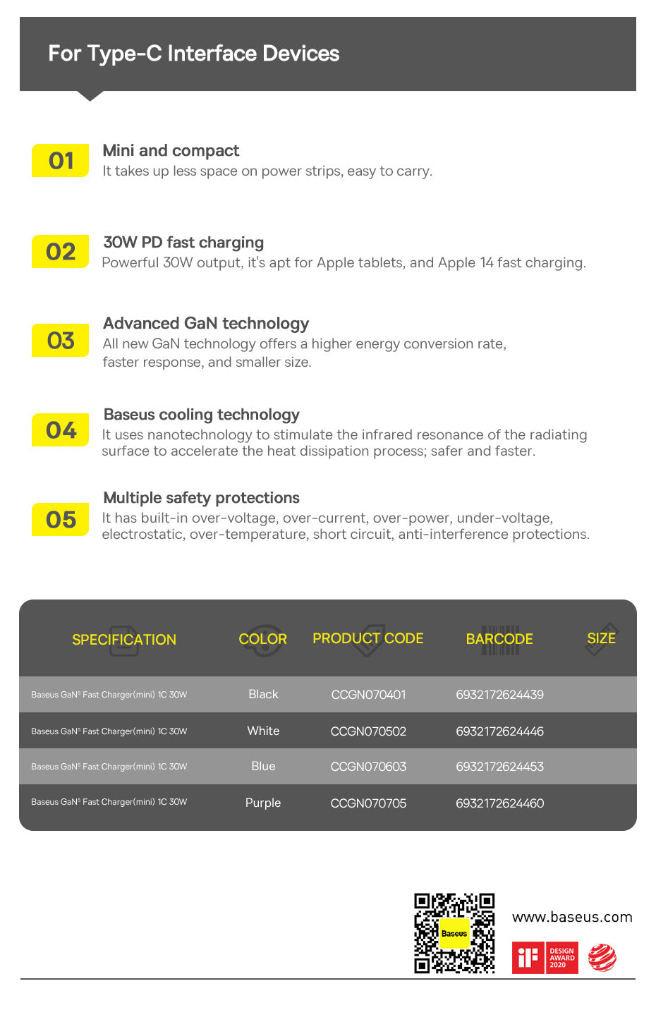 Rozměry 34 × 28 mm, hmotnost 41 g. Vstup AC 100–240 V ~ 50/60 Hz; výstup Type-C 5 V/3 A, 9 V/3 A, 12 V/2 A, 15 V/2 A, 20 V/1,5 A.