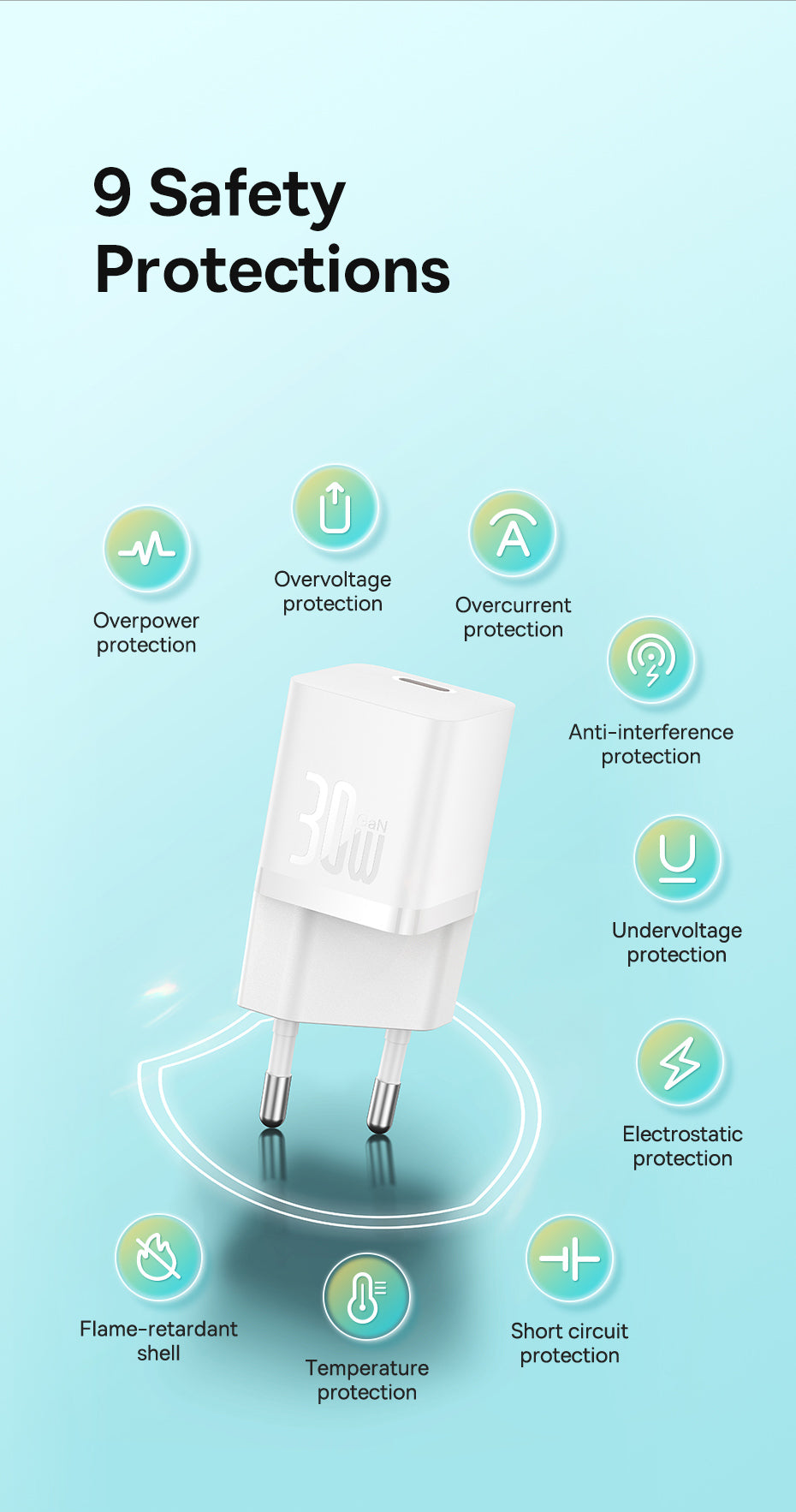 Baseus GaN5 30W mini síťová nabíječka (bílá) je kompaktním řešením pro rychlé a bezpečné nabíjení na cestách. Díky technologii GaN nabízí plný výkon 30 W v extrémně malém balení. Telefon lze nabít až na 57 % za 30 minut. Inteligentní řízení teploty BCT snižuje teplotu až o 10 % ve srovnání s běžnými nabíječkami a chrání připojená zařízení. Nabíječka rozpoznává přehrávanou energii av noci automaticky přepne na záložní režim, aby došlo k přebíjení. Disponuje vícestupňovou ochranou proti nadměrnému výkonu, přepětí a rušení, což zaručuje stabilní a bezpečné nabíjení. Rozměry 34 × 28 mm, hmotnost 41 g, materiál PC.