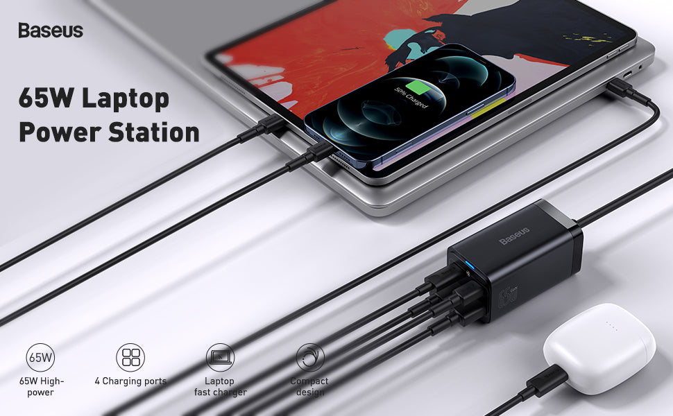 Baseus GaN3 Pro 65W je kompaktní nabíječka určená pro rychlé nabíjení více současně. Technologie GaN3 umožňuje až 65 W výkonu ve velmi malém provedení, přičemž je o přibližně 30 % menší než tradiční 65W nabíječky.