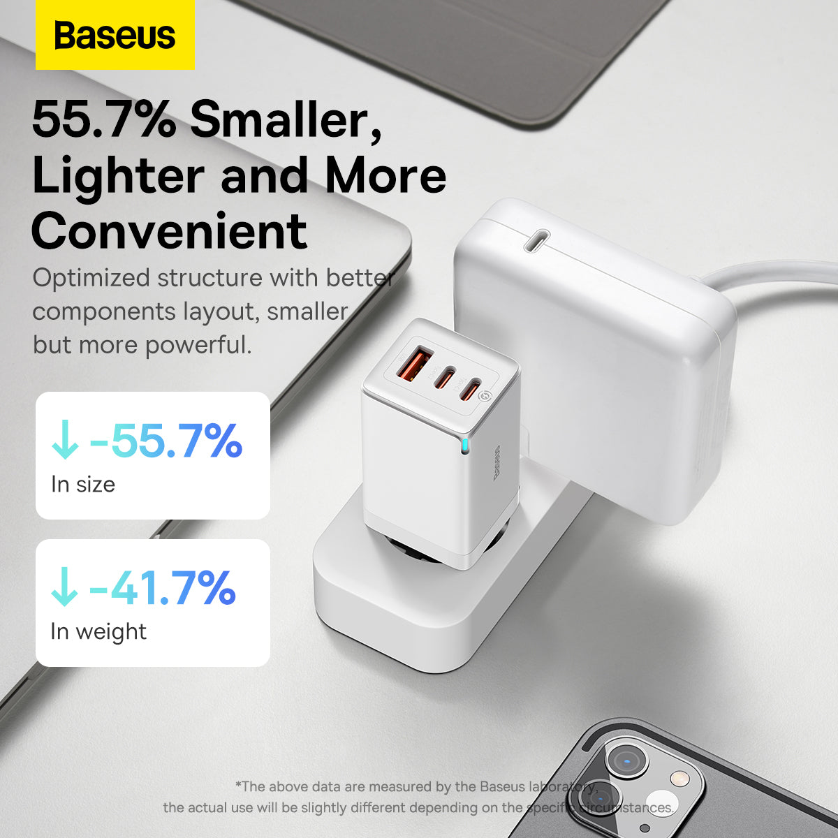Baseus GaN5 Pro je kompaktní síťová nabíječka s 2× USB‑C a 1× USB portem, ideální na cesty i do letadla. Rozměry 98 × 36,3 × 32 mm a hmotnost 120,8 g zajišťují nízkou hmotnost a skladnost. Přijímá vstup 100–240 V a podporuje rychlé nabíjení PD3.0, QC3.0, SCP, AFC a PPS. Maximální výkon dosahuje až 65 W z USB‑C1 a USB‑C2; možné je i současné nabíjení až 3 zařízení s inteligentním rozdělením energie (BPS II).