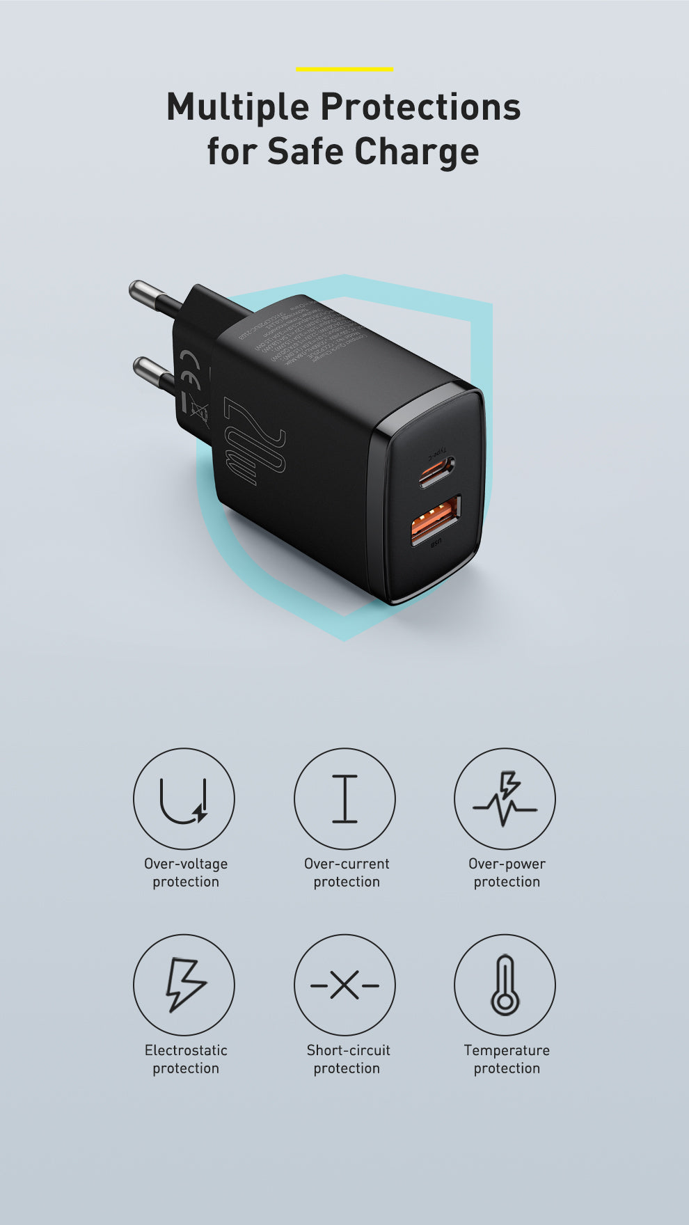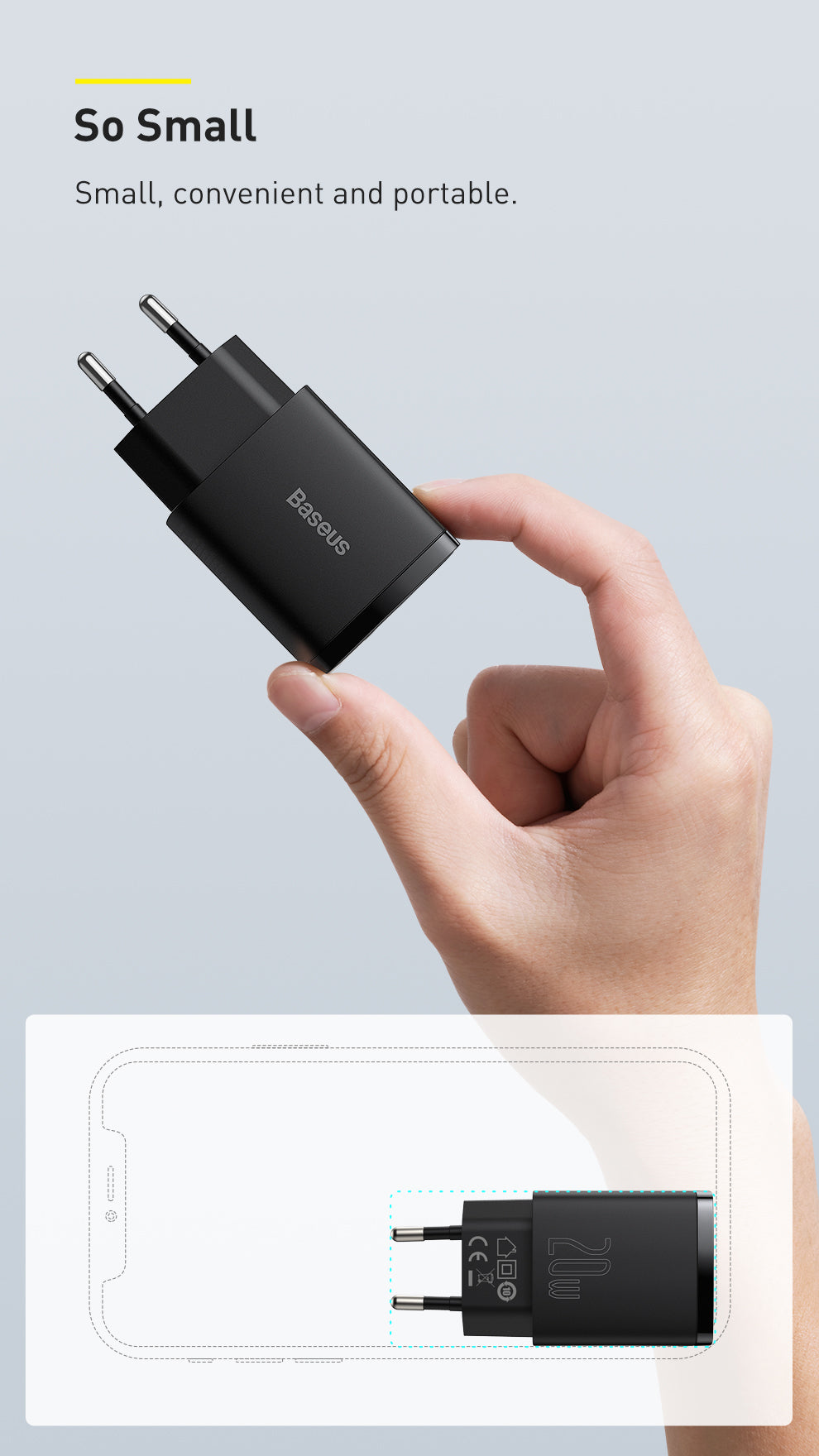 Kompaktní rozměry 28 × 40 × 83 mm a hmotnost 53 gz je praktické řešení pro domácnost i na cesty. Kryt z ohnivzdorných materiálů a víceúrovňová ochrana poskytují bezpečné nabíjení.