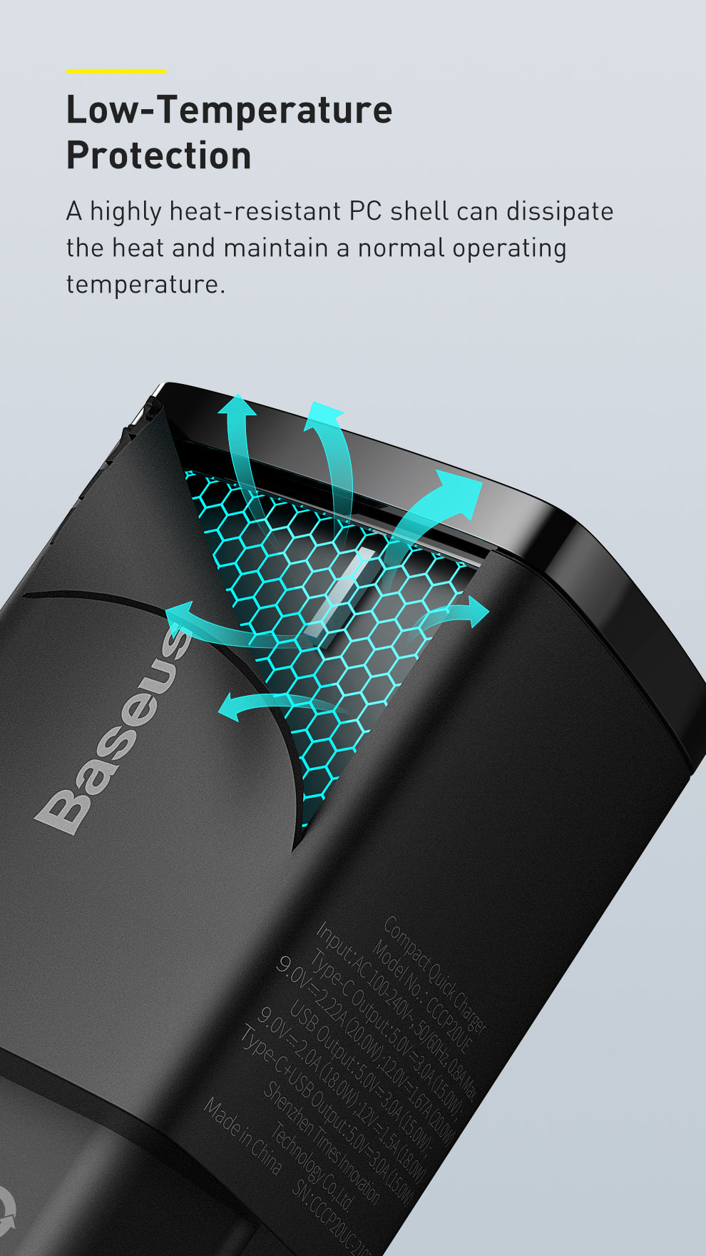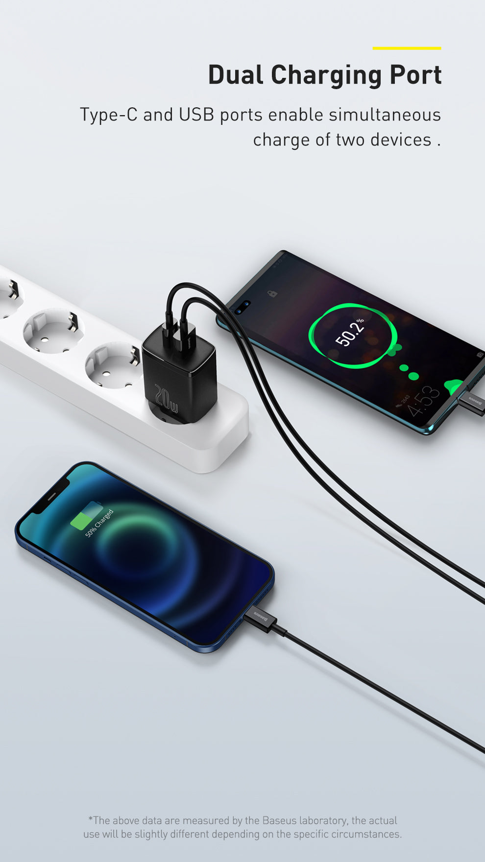 Kompaktní rychlonabíječka U+C 20W je síťová nabíječka s porty USB-C a USB-A, která podporuje rychlé nabíjení Power Delivery, Quick Charge 3.0, Samsung AFC a Huawei FCP.