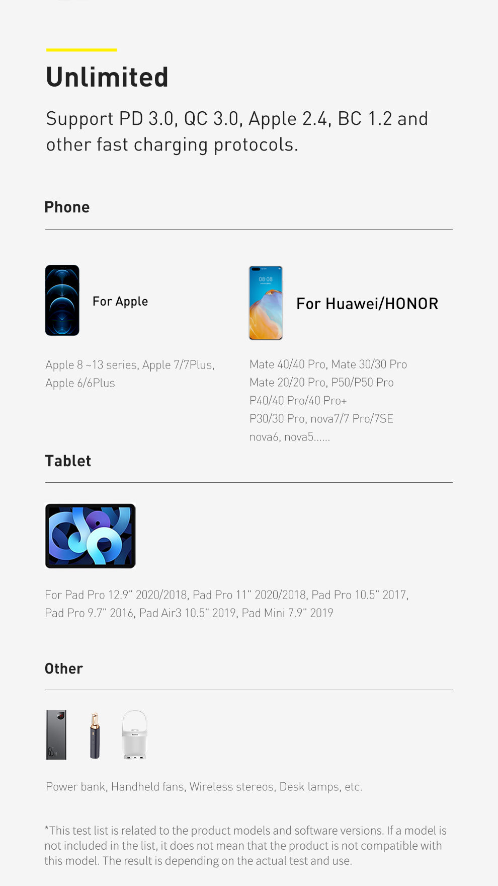 Přijímá napájení 100–240 V, 50/60 Hz, takže je použitelné po celém světě; poznámka: rychlé nabíjení na dvou portech současně není podporováno. Je schválena certifikace RoHS, CE, FCC a CCC.