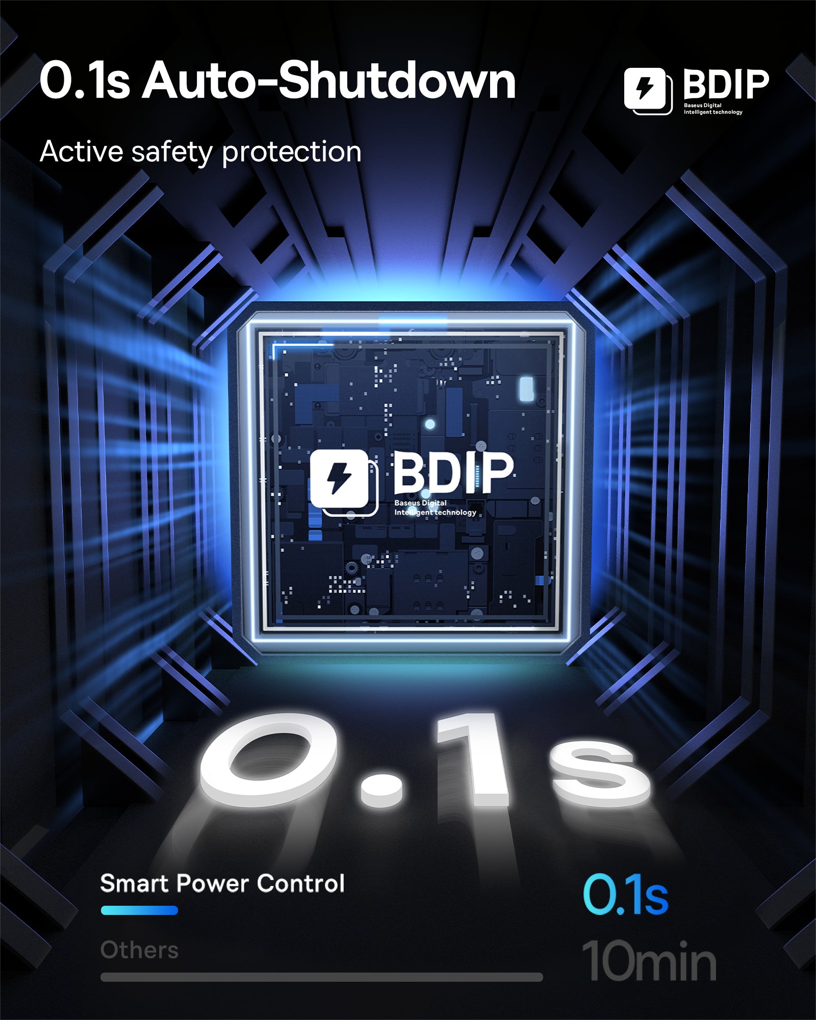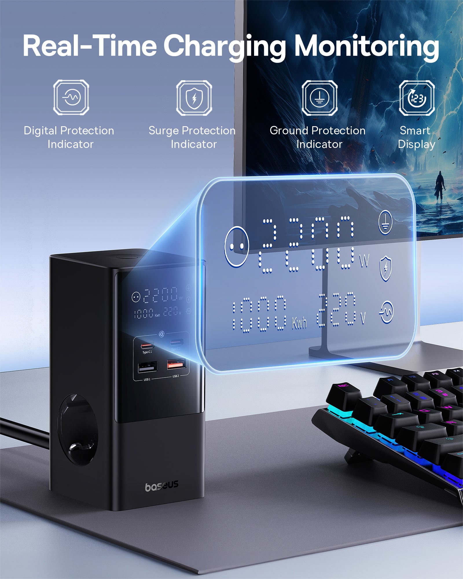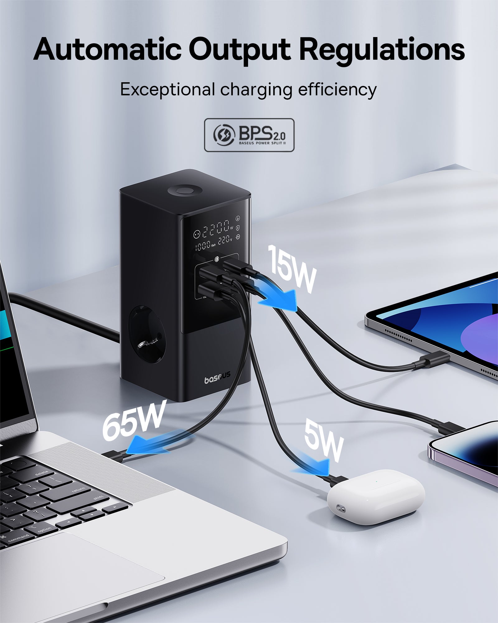 Kompaktní a výkonná síťová nabíječka Baseus umožňuje dobíjení více zařízení najednou. Celkový výkon dosahuje 100 W a čtyři výstupní porty (2× USB-A, 2× USB-C) pokrývají nabíjení telefonů, tabletů i menších notebooků. GaN technologie zvyšuje účinnost, snižuje vytápění a mění rozměry. Na těle je LED digitální displej, který zobrazuje aktuální napětí a proud pro lepší přehled o nabíjení. Podpora rychlého nabíjení Power Delivery USB-C zajišťuje kompatibilitu se širokým spektrem zařízení. Konstrukce z PC materiálu zajišťuje dlouhou životnost a odolnost, zároveň přepěťová ochrana chrání připojená zařízení před výkyvy napětí. Určeno pro síťové použití – vhodné pro notebooky, mobily a tablety. Nabíječka je navržena pro bezpečné a rychlé nabíjení. Balení obsahuje kabel o délce 1,5 m.