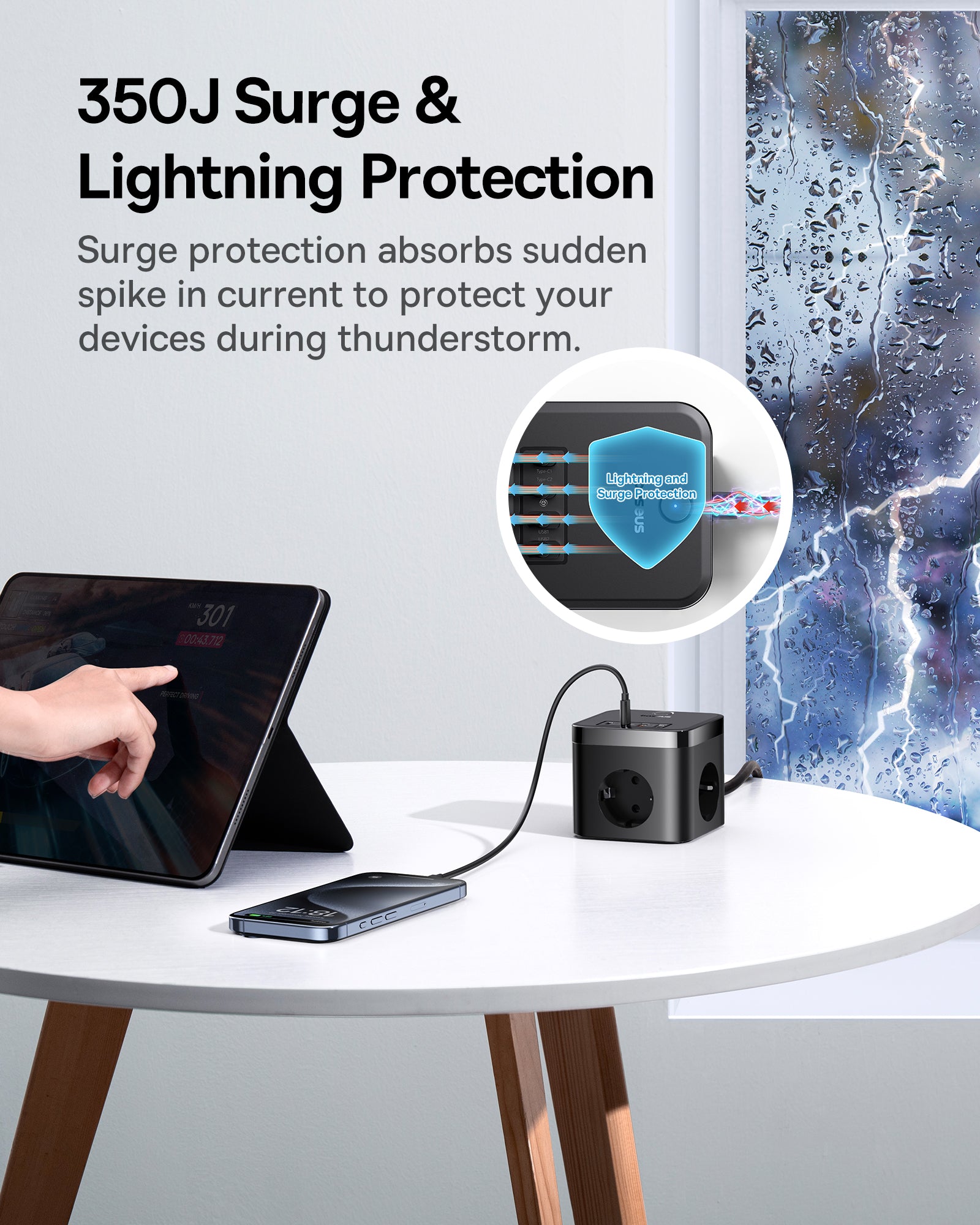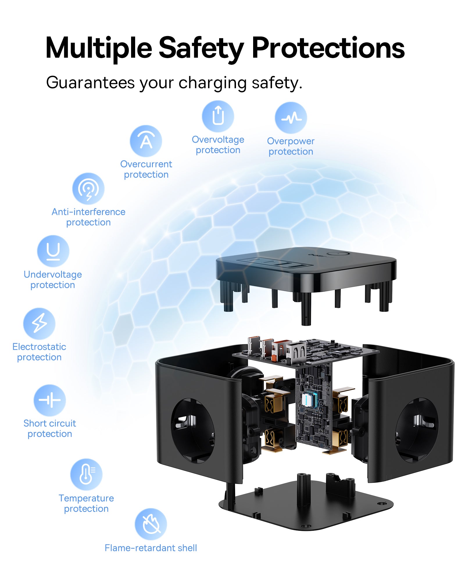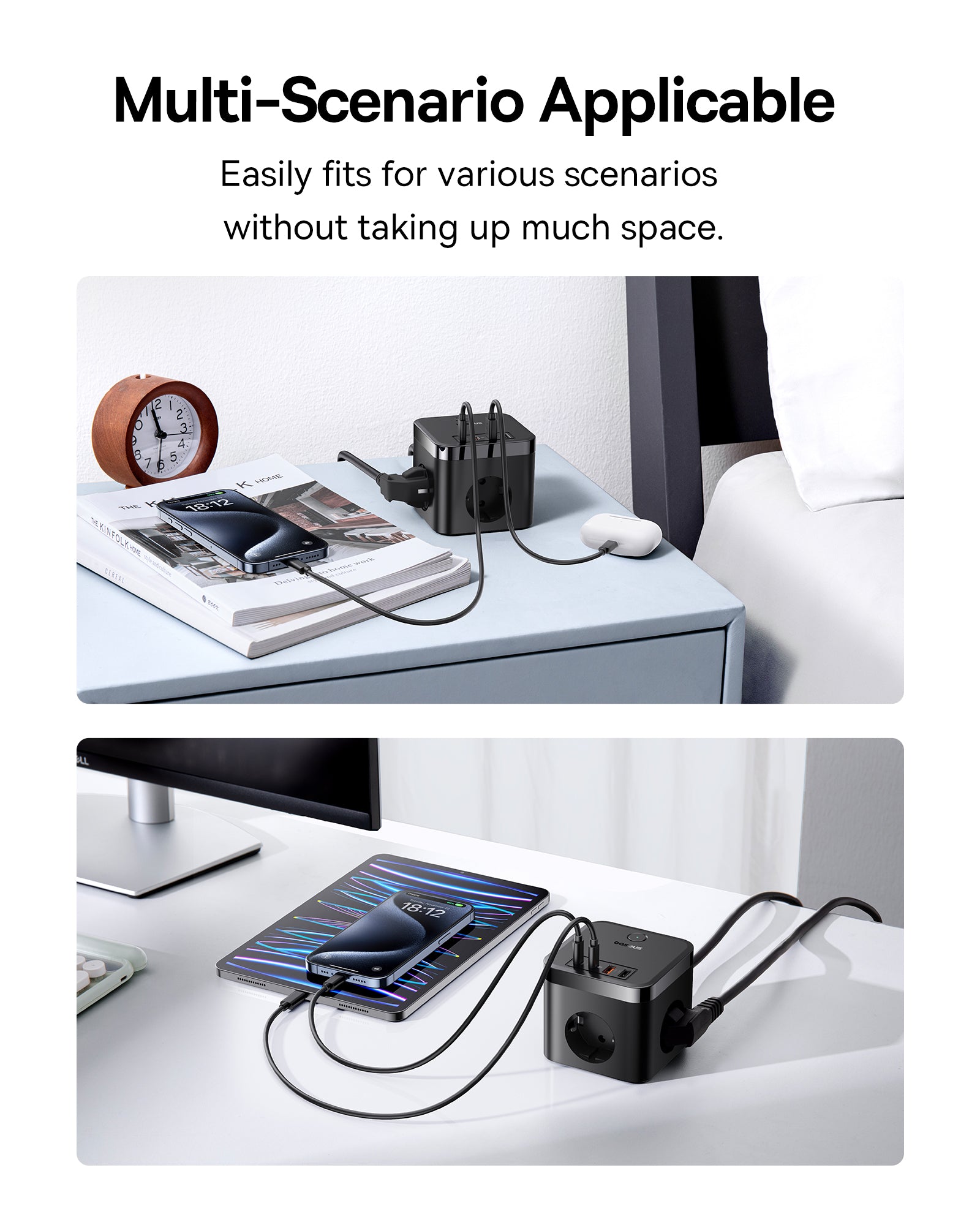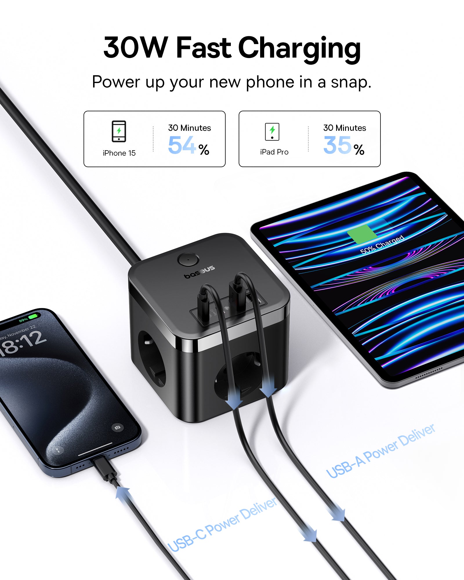 Baseus PowerCombo Cube je kompaktní prodlužovací kabel navržený pro efektivní a bezpečné napájení více zařízení najednou. Disponuje 3 AC zásuvkami , 2 USB-C a 2 USB-A porty , takže lze současně nabíjet až sedm zařízení. Celkový výkon činí 30 W a technologie GaN6 zajišťuje rychlé nabíjení a nízké zahřívání pro různá zařízení, od smartphonů a tabletů po notebooky. Bezpečnost je prioritou: 350 J přepěťová ochrana a dodatečné vrstvy ochrany proti zkratu, přehřátí a přetížení. Rozměry 86 × 86 × 76 mm a hmotnost ≈ 494 g , 1,5 m dlouhý kabel poskytuje flexibilitu umístění. Design je moderní a kompaktní, ideální na stůl či do cestovní tašky. To vše z PowerCombo Cube dělá spolehlivé řešení pro napájení domácnosti i kanceláře bez kompromisů v estetice ani výkonu.