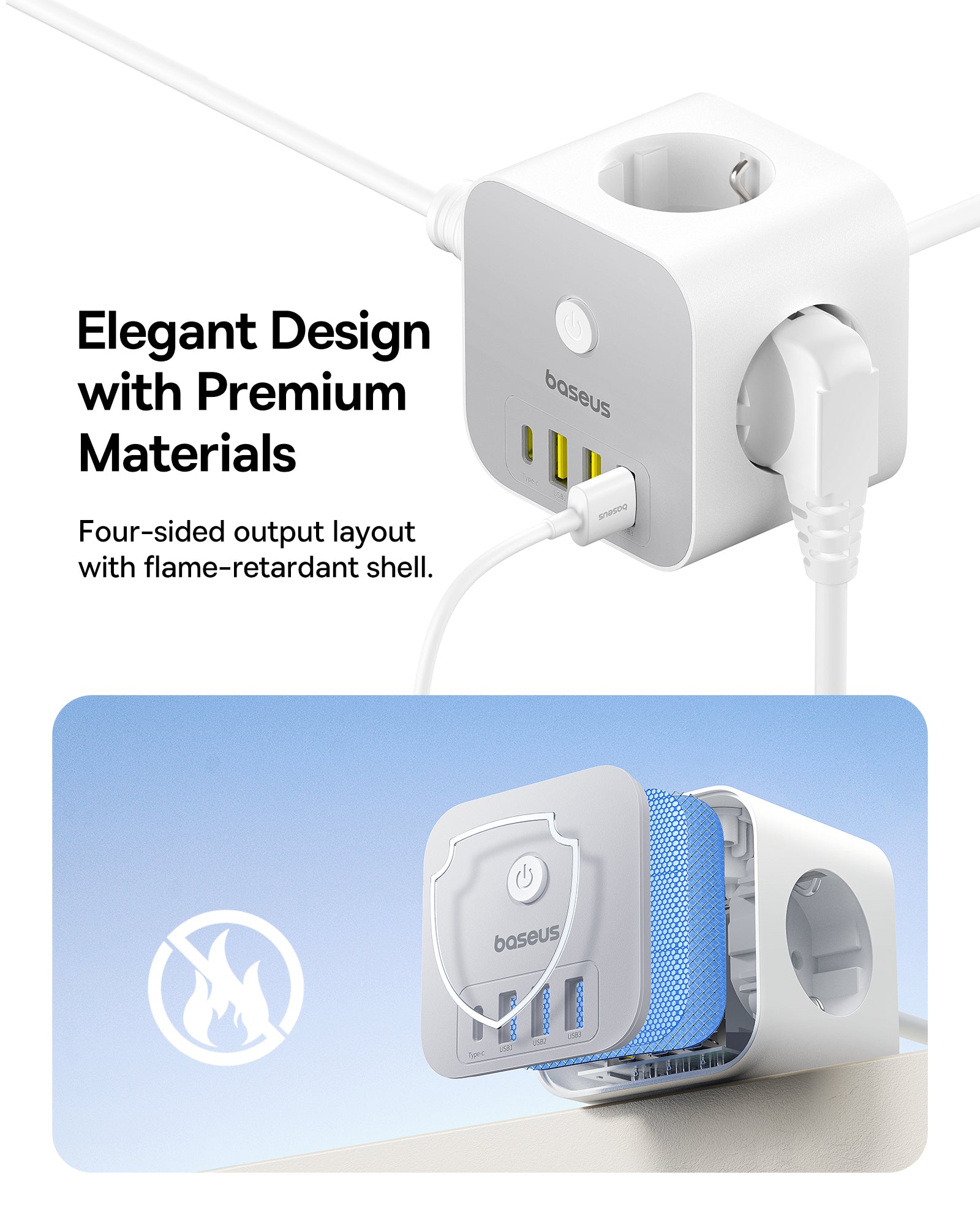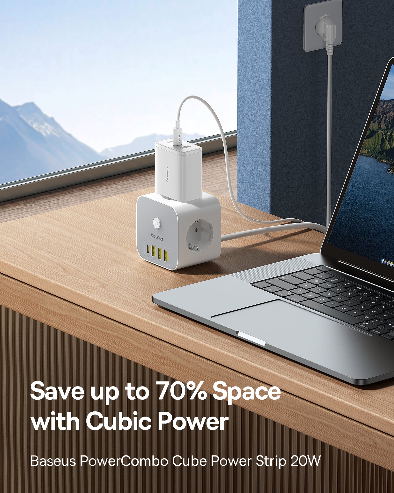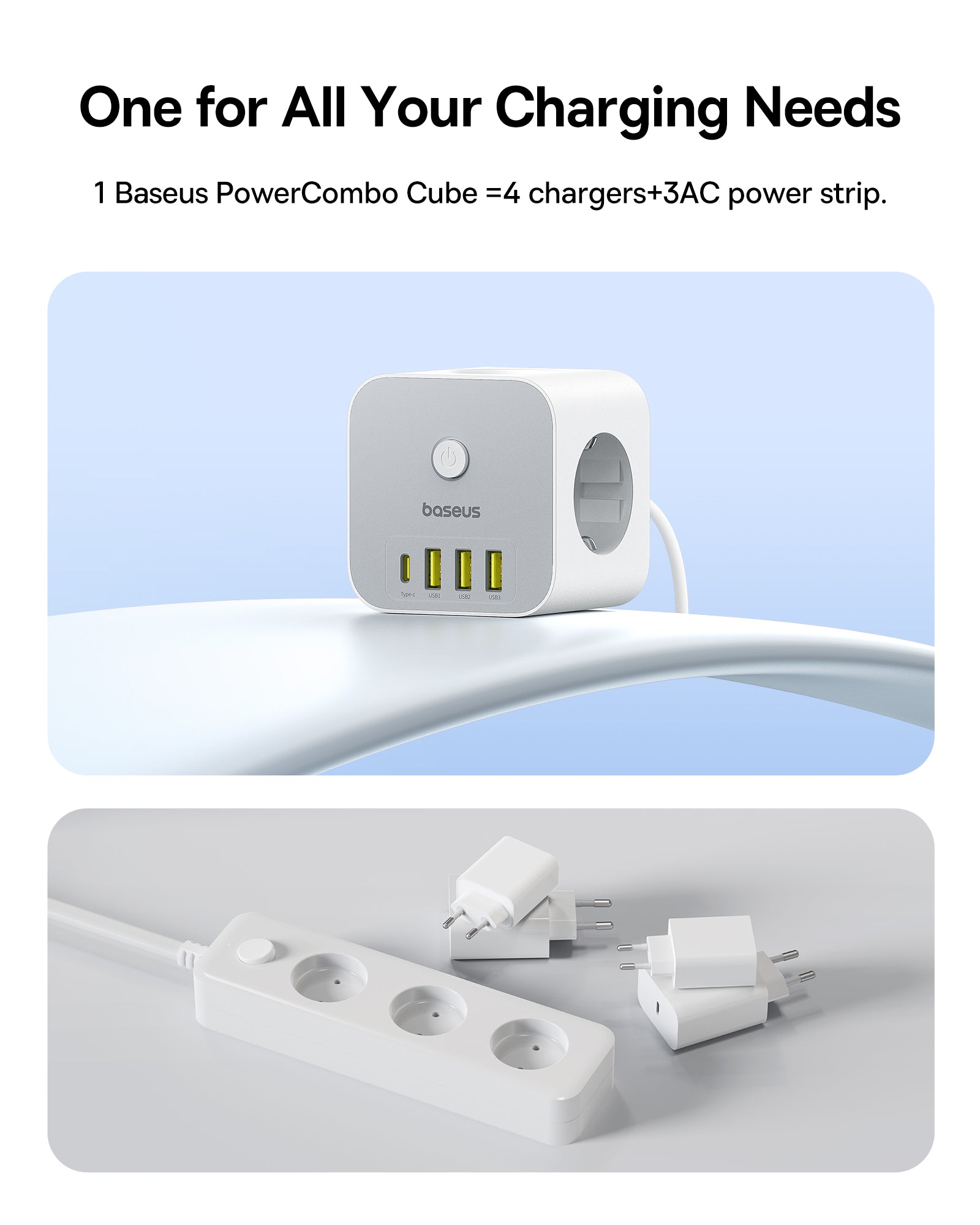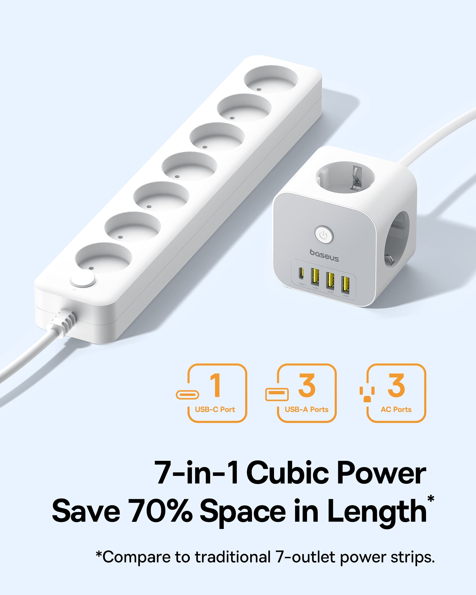 Baseus PowerCombo Cube je kompaktní prodlužovací kabel pro napájení více zařízení najednou. Disponuje 3 AC zásuvkami, 3 USB-A porty a 1 USB-C portem s výkonem až 20 W, což umožňuje současné nabíjení až sedm zařízení. Délka kabelu je 1,5 m, díky čemuž se snadno umístí na stůl či do cestovní tašky.
