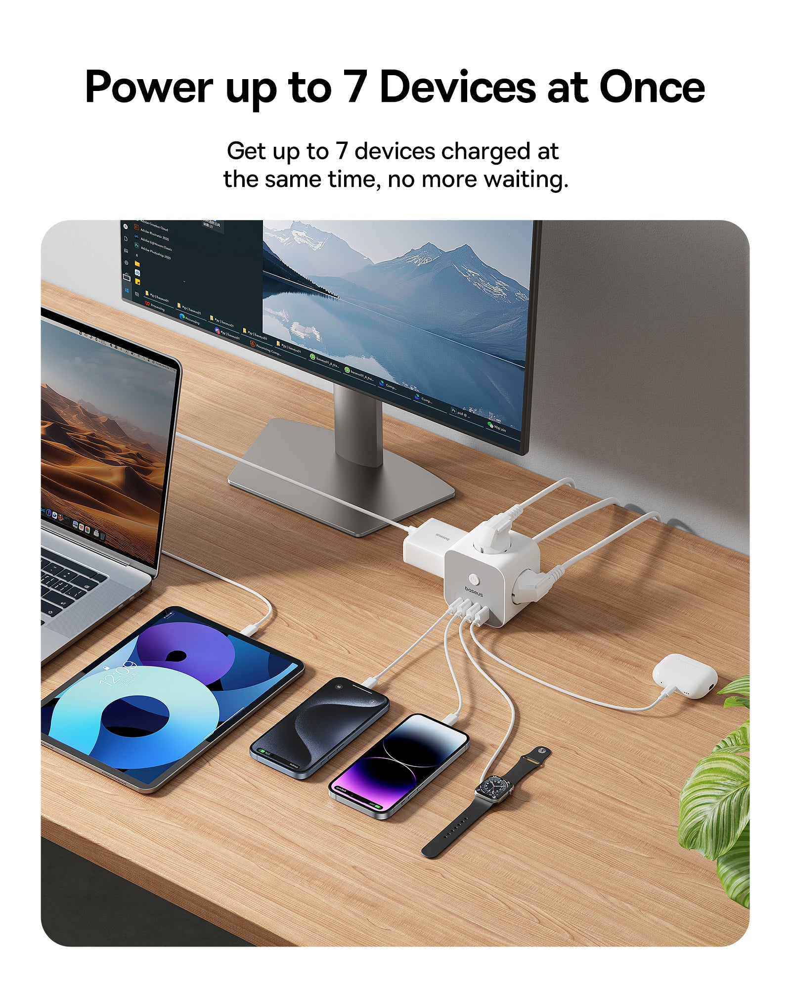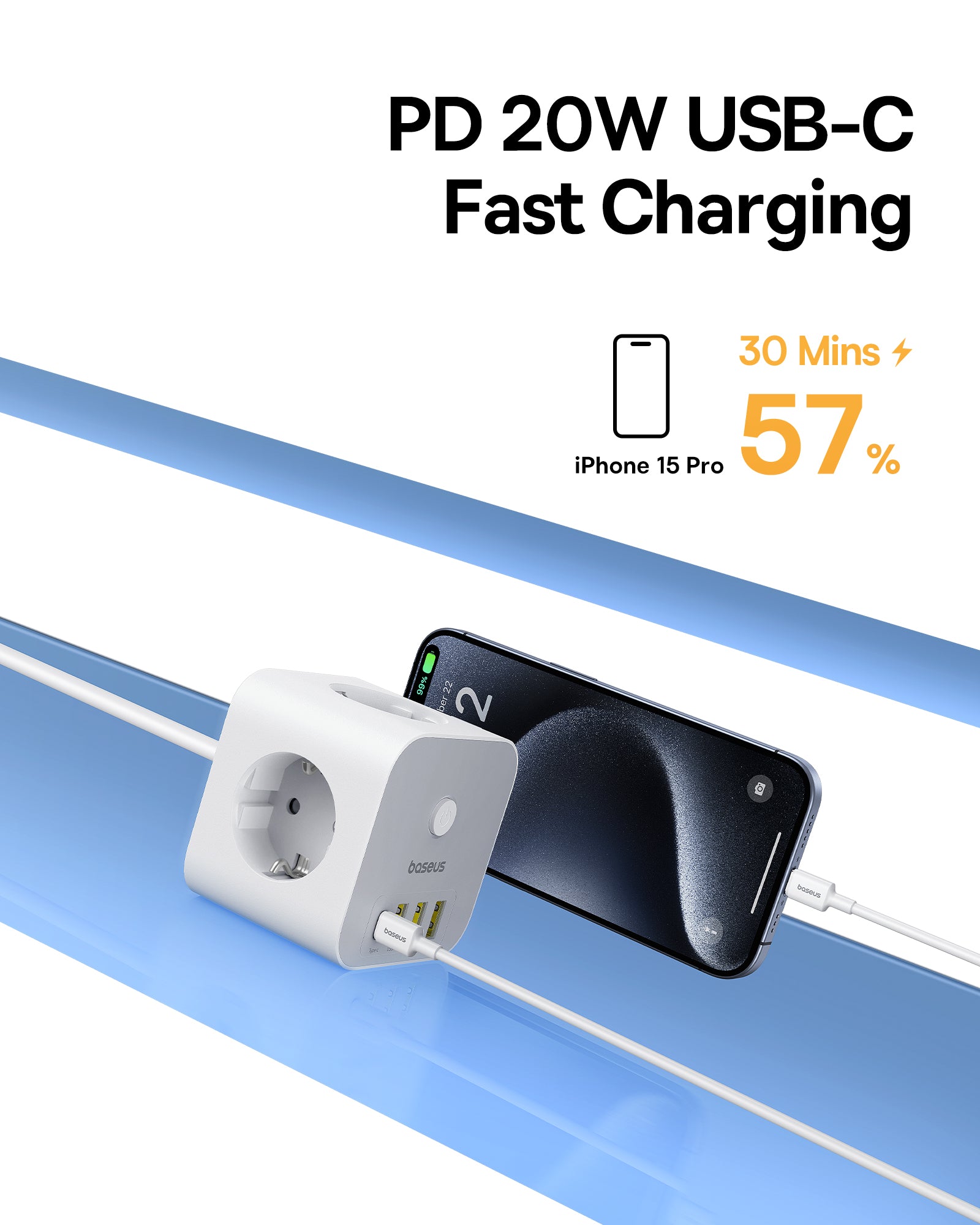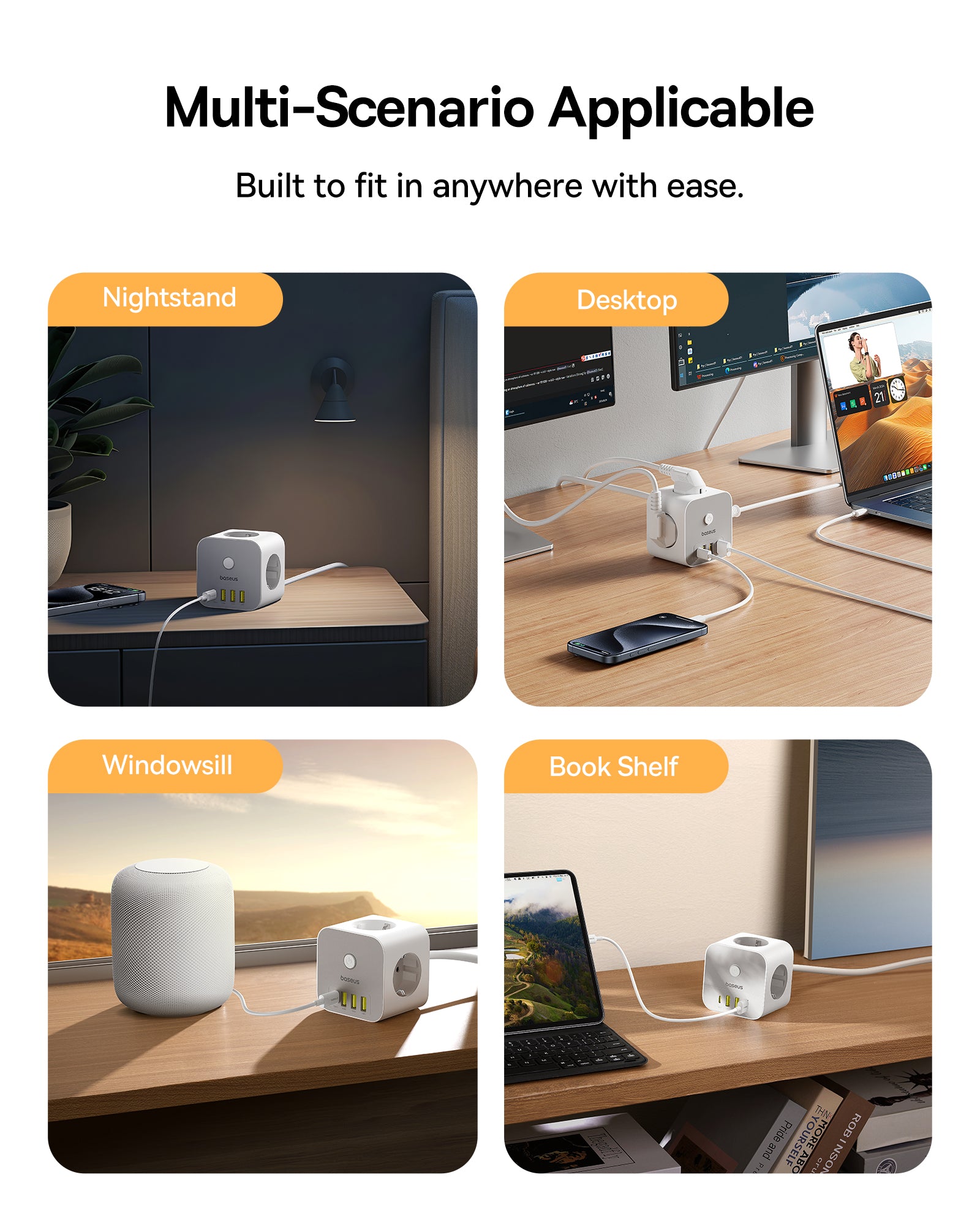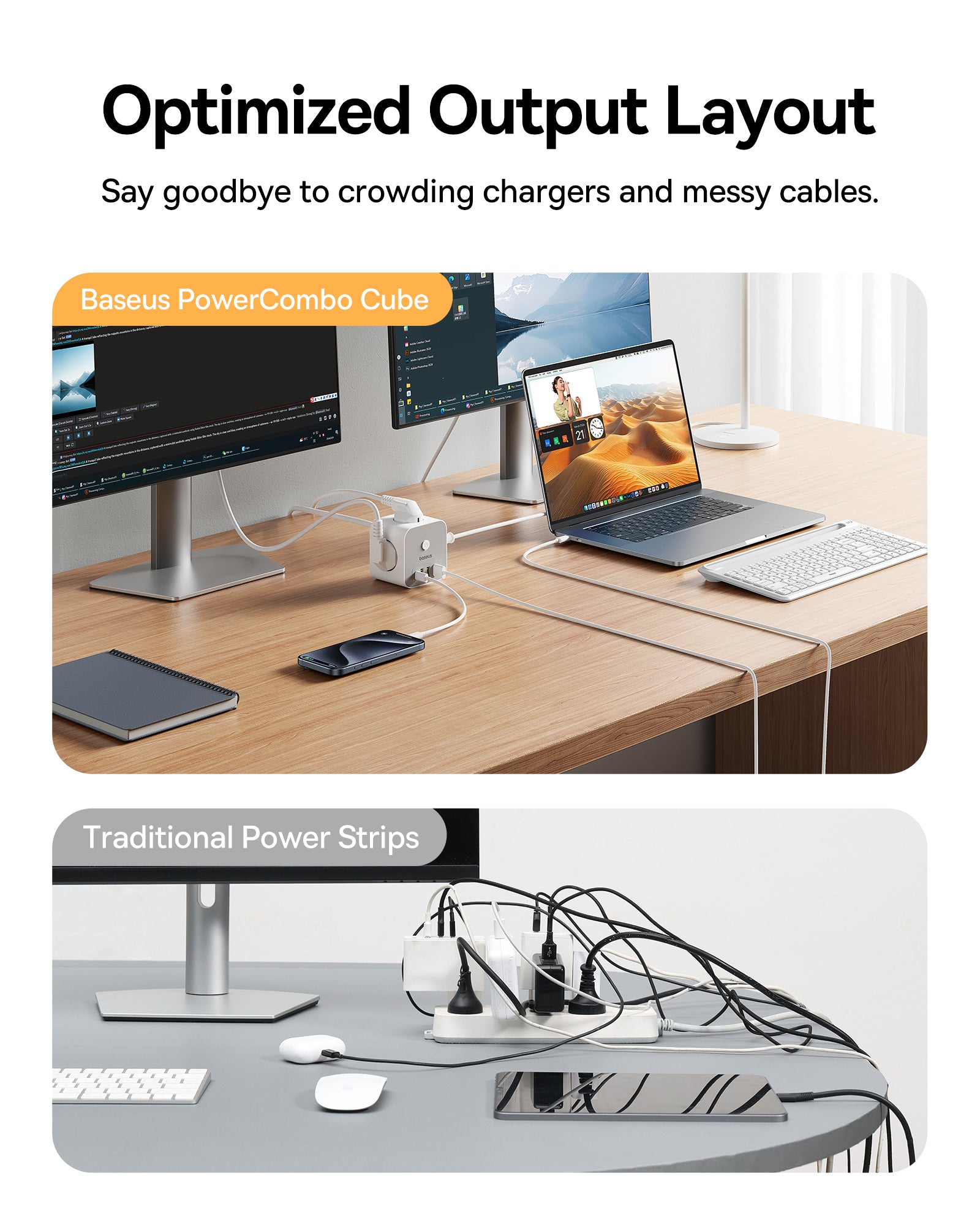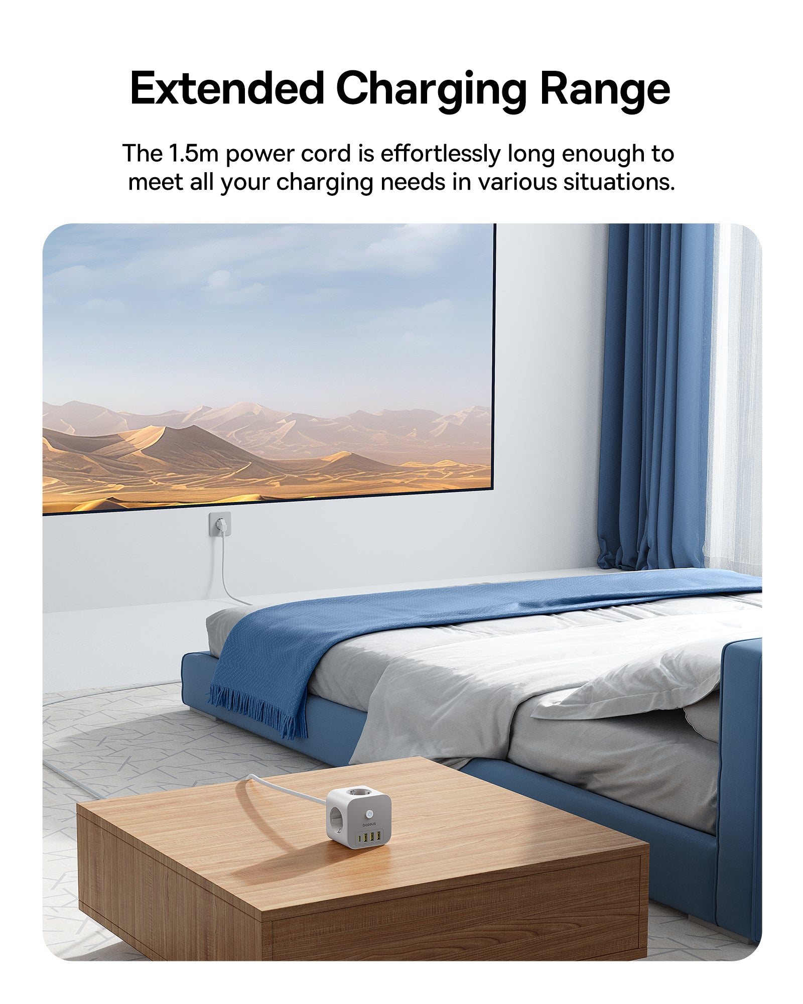 Baseus PowerCombo Cube je kompaktní prodlužovací kabel pro napájení více zařízení najednou. Disponuje 3 AC zásuvkami, 3 USB-A porty a 1 USB-C portem s výkonem až 20 W, což umožňuje současné nabíjení až sedm zařízení. Délka kabelu je 1,5 m, díky čemuž se snadno umístí na stůl či do cestovní tašky.