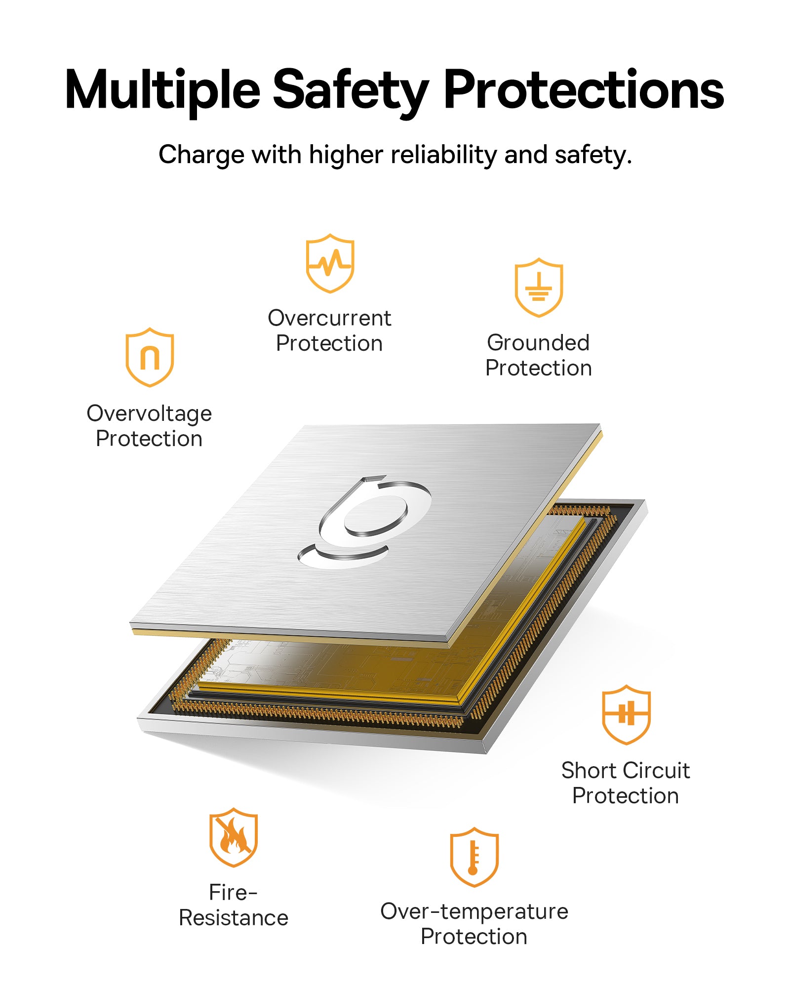 Bezpečnost zajišťuje vícevrstvá ochrana proti přepětí, přehřátí a zkratu. Konstrukce z pevných materiálů prodlužuje životnost a poskytuje spolehlivý výkon i při dlouhodobém použití. Je vhodný pro domácnosti, kanceláře i na cesty, díky kompaktním rozměrům a stylovému vzhledu se hodí do jakéhokoli prostředí.
