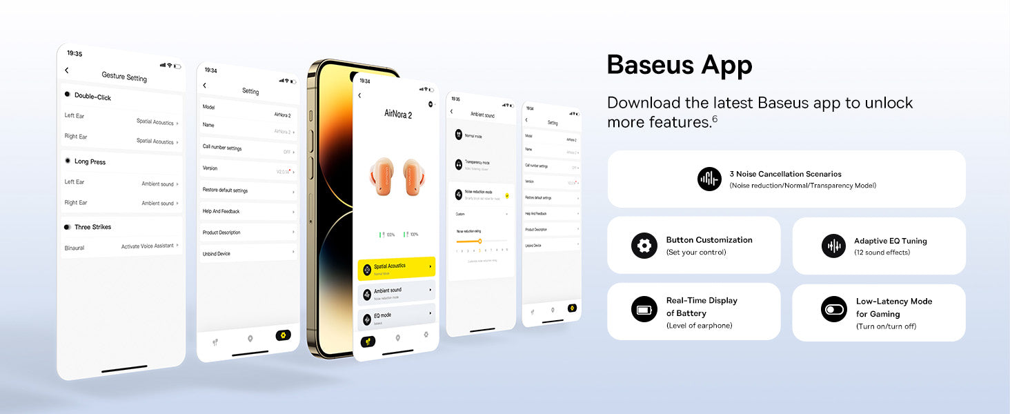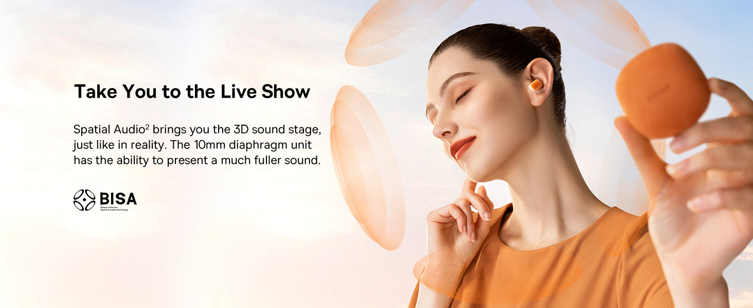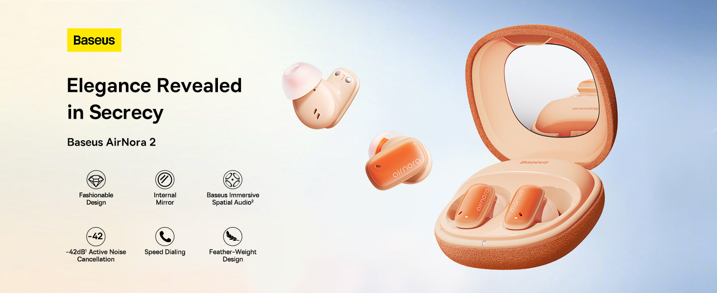 Baseus Air Nora 2 nabízí prostorový zvuk díky technologii BISA a 10 mm měničům, které zlepšují zvuk a potlačují okolní šum až o 42 dB. Lehký, ergonomický design zajišťuje pohodlné nošení a prostřednictvím aplikace Baseus lze přistupovat k užitečným funkcím.