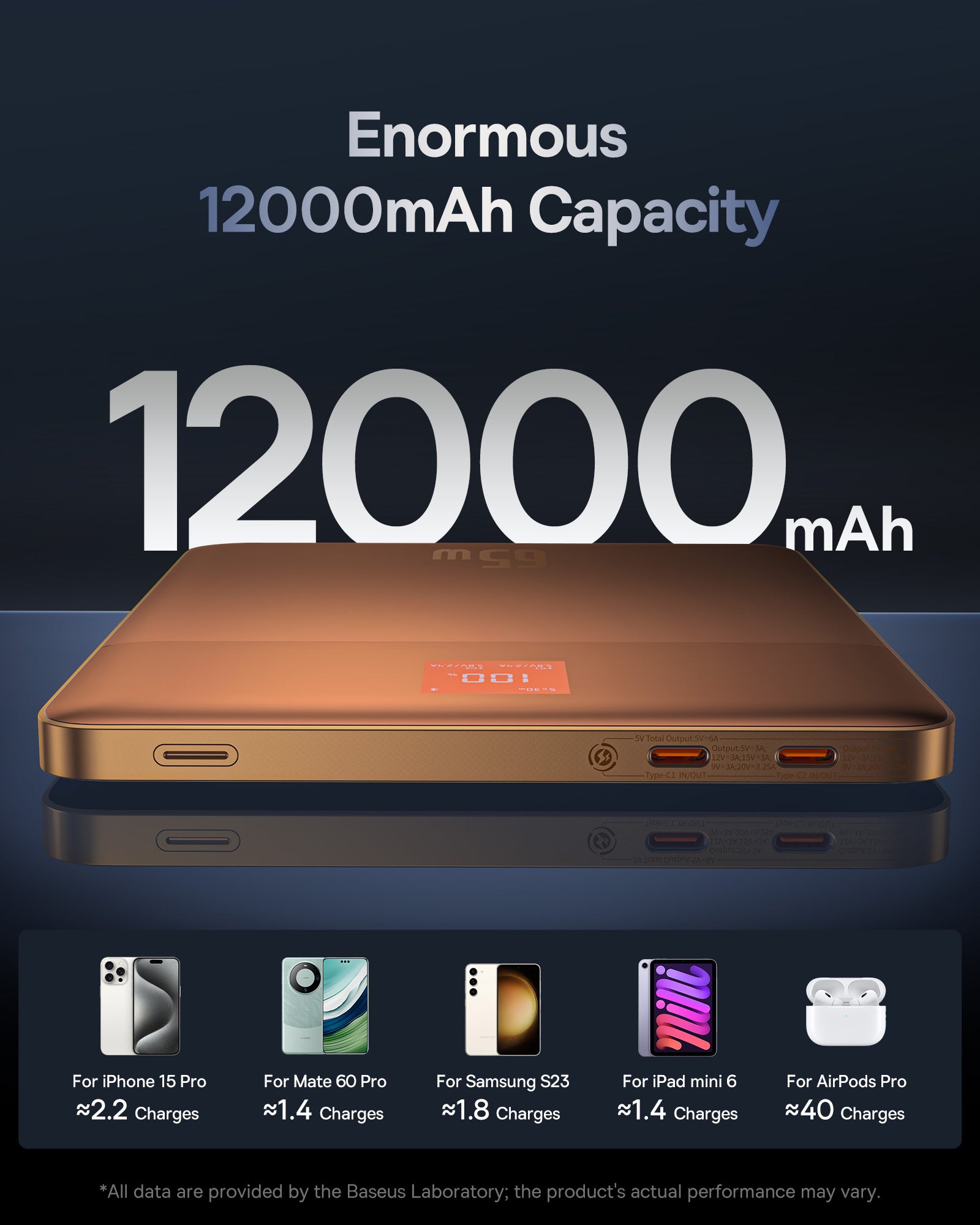 Powerbanka Baseus Blade2 s kapacitou 12000 mAh nabízí dostatečný výkon pro nabíjení chytrých telefonů, tabletů a notebooků, včetně MacBooku Pro a iPadu. Tenký profil 7,3 mm je vhodný pro ultrabooky a cestování; je schválena pro leteckou společnost. Umožňuje duální nabíjení dvou zařízení současně a podporuje rychlé nabíjení až 65 W, vstup až 60 W. Inteligentní aplikace umožňuje správu nabíjení a přijímání oznámení. Bezpečnostní systém chrání proti zkratu, nadměrnému vybití, teplotě, přebití, nadměrnému napájení, nadproudu a přepětí. Odolná konstrukce využívá SiC baterie a technologii Baseus Power Split 2.0 pro spolehlivost. Digitální displej zobrazuje stále, hrdé a napětí v reálném čase. Kompatibilita s více než 1000 zařízeními zajišťuje širokou kompatibilitu.