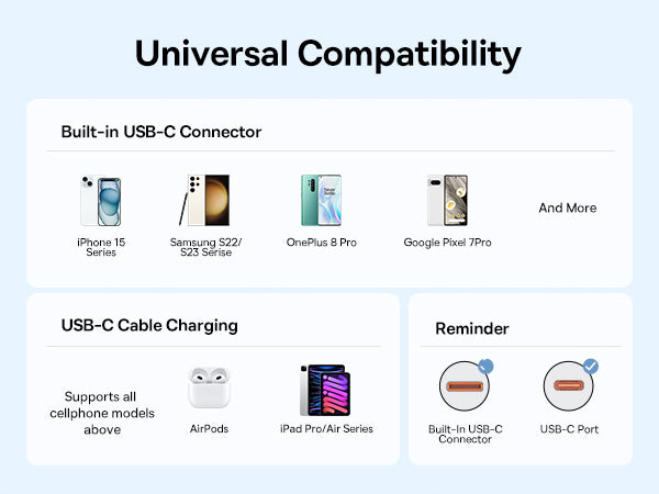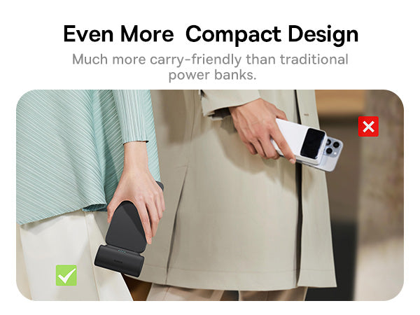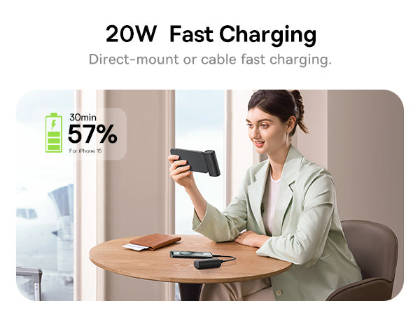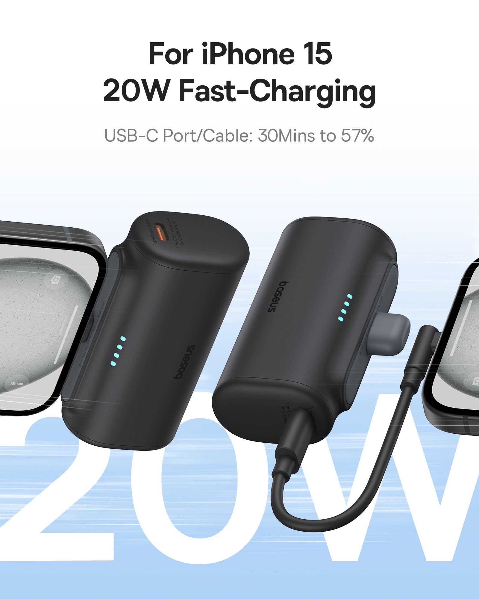 Nabíjejte bez kabelů díky integrovanému konektoru typu C a můžete ji připojit přímo k telefonu. Podporuje 20 W PD rychlé nabíjení a doplnění energie za cca 1 h 47 min. Kapacita 5000 mAh (18 Wh) poskytuje pohodlné doplnění energie pro běžná zařízení. Rozměry 80 × 40,2 × 25,6 mm, hmotnost cca 100 g, barva černá. Bezpečnostní systém: 8vrstvá ochrana. Model Compact Fast Charging Edition.