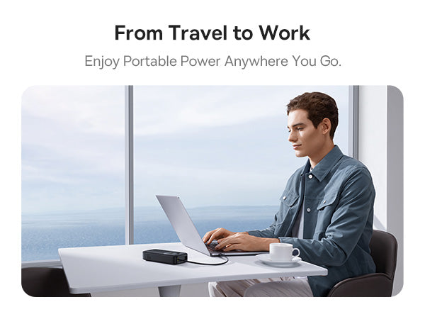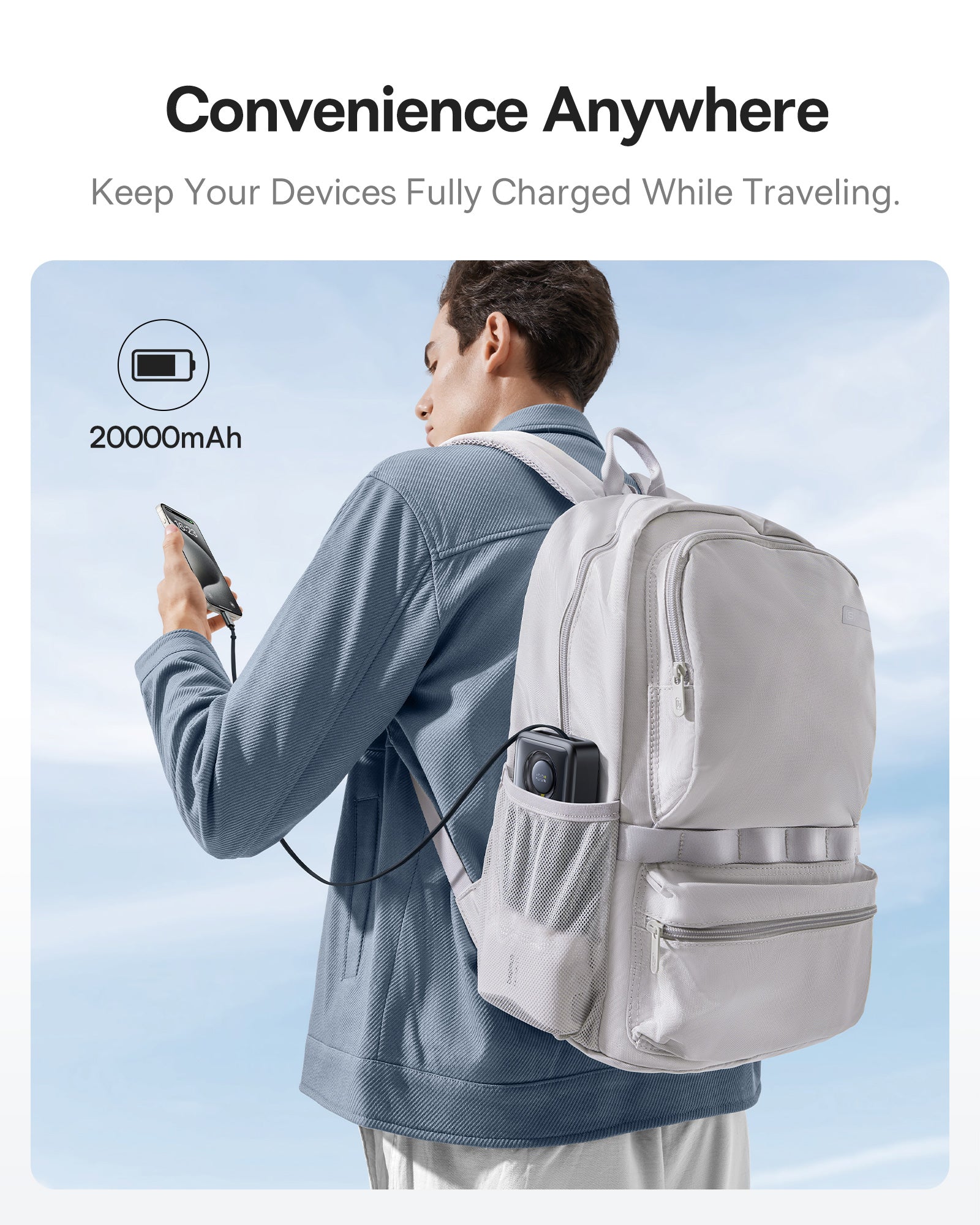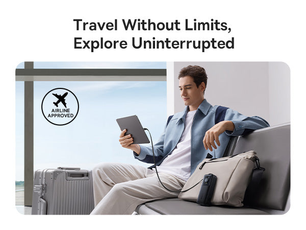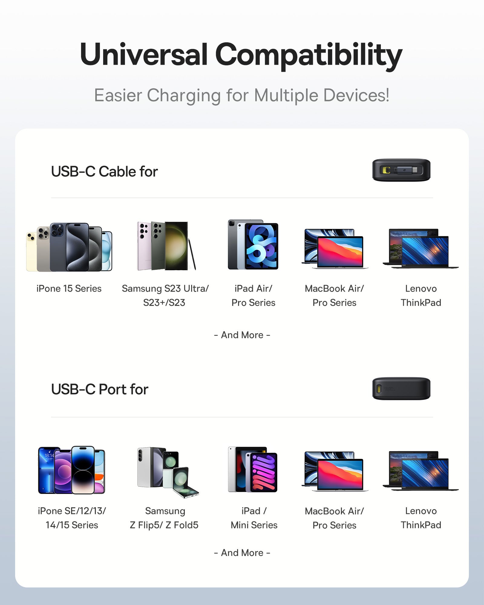 Díky dvěma portům USB-C a USB-A lze nabíjet více zařízení najednou; MacBook Pro 14-inch lze nabít až na 51 % za 30 minut. Kompatibilita zahrnuje iPhone, Samsung, Huawei, Xiaomi a další, a je vhodná pro herní zařízení jako Steam Deck a Nintendo Switch.