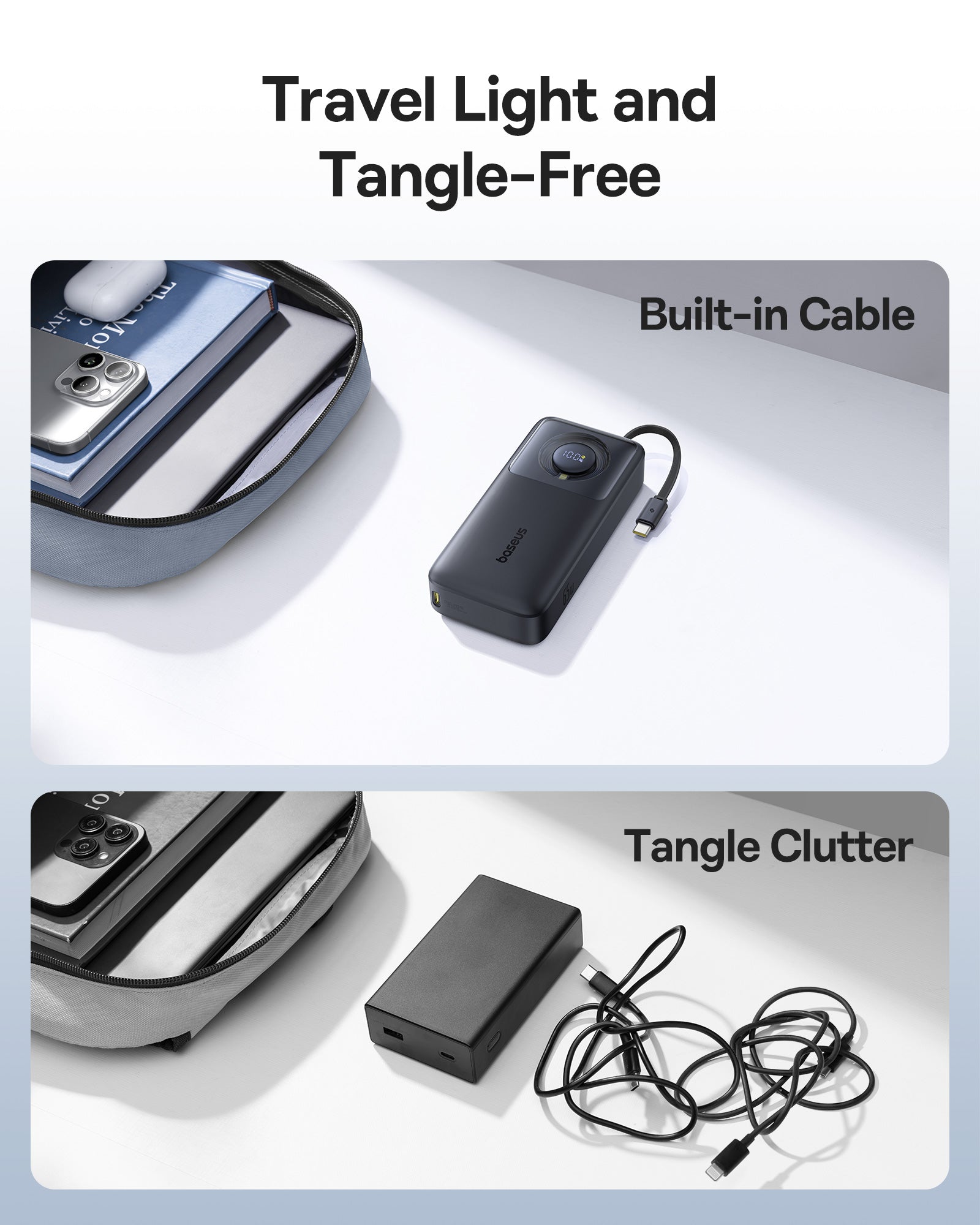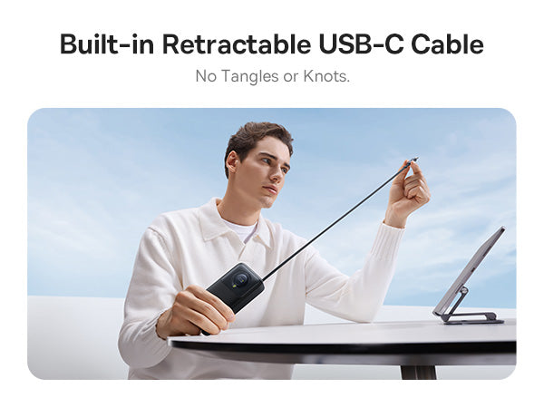 Vestavěný zatahovací kabel USB-C (0,7 m) zajišťuje pořádek a pohodlí bez zamotávání. LED displej zobrazuje zbývající energii, takže vždy víte, kolik nabití vás ještě čeká.