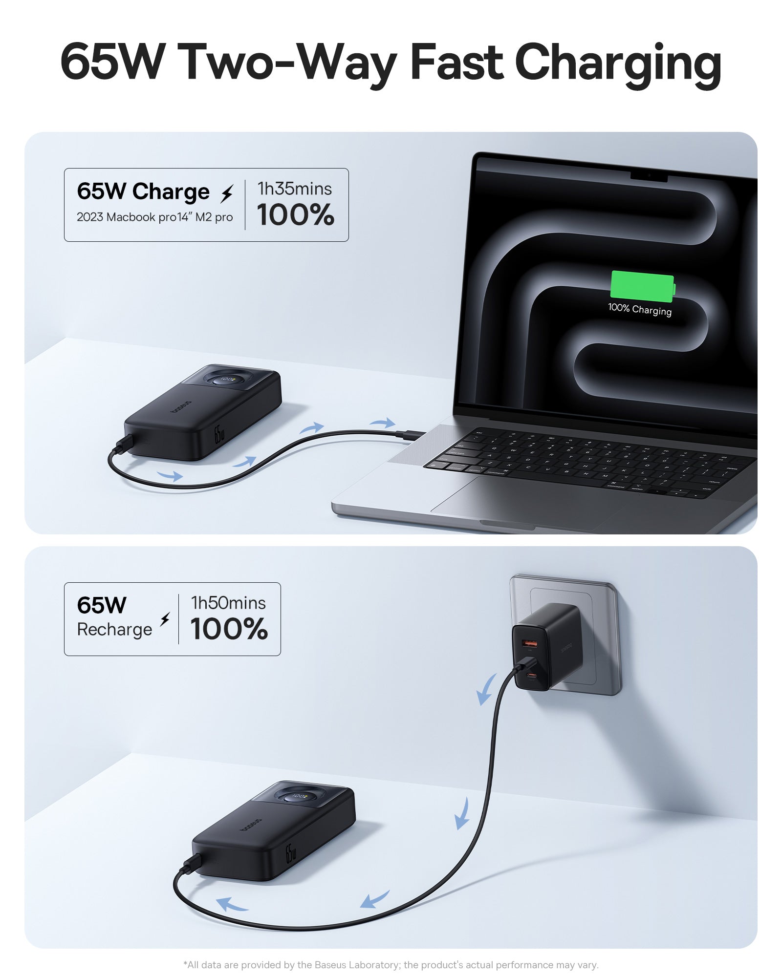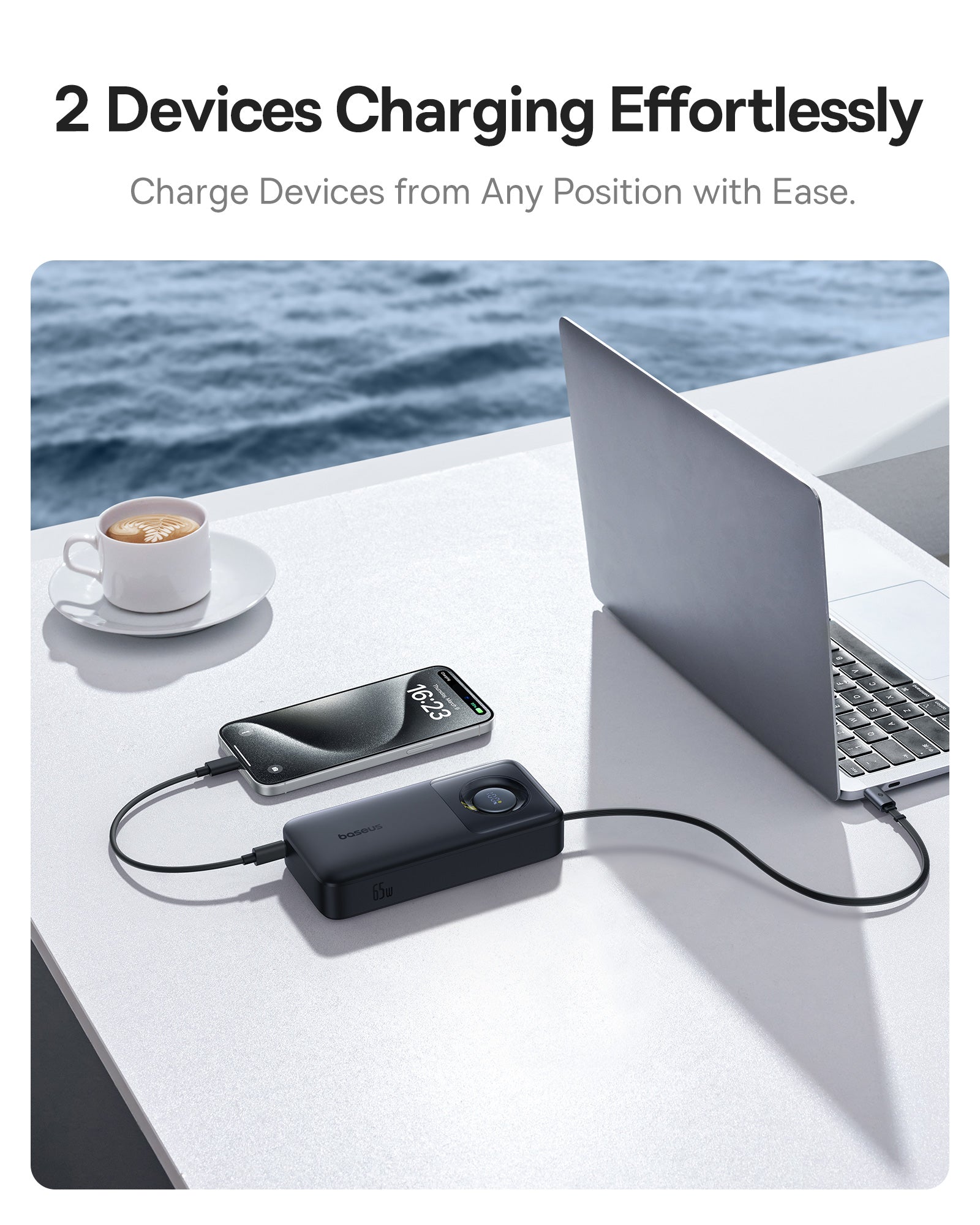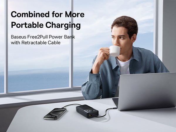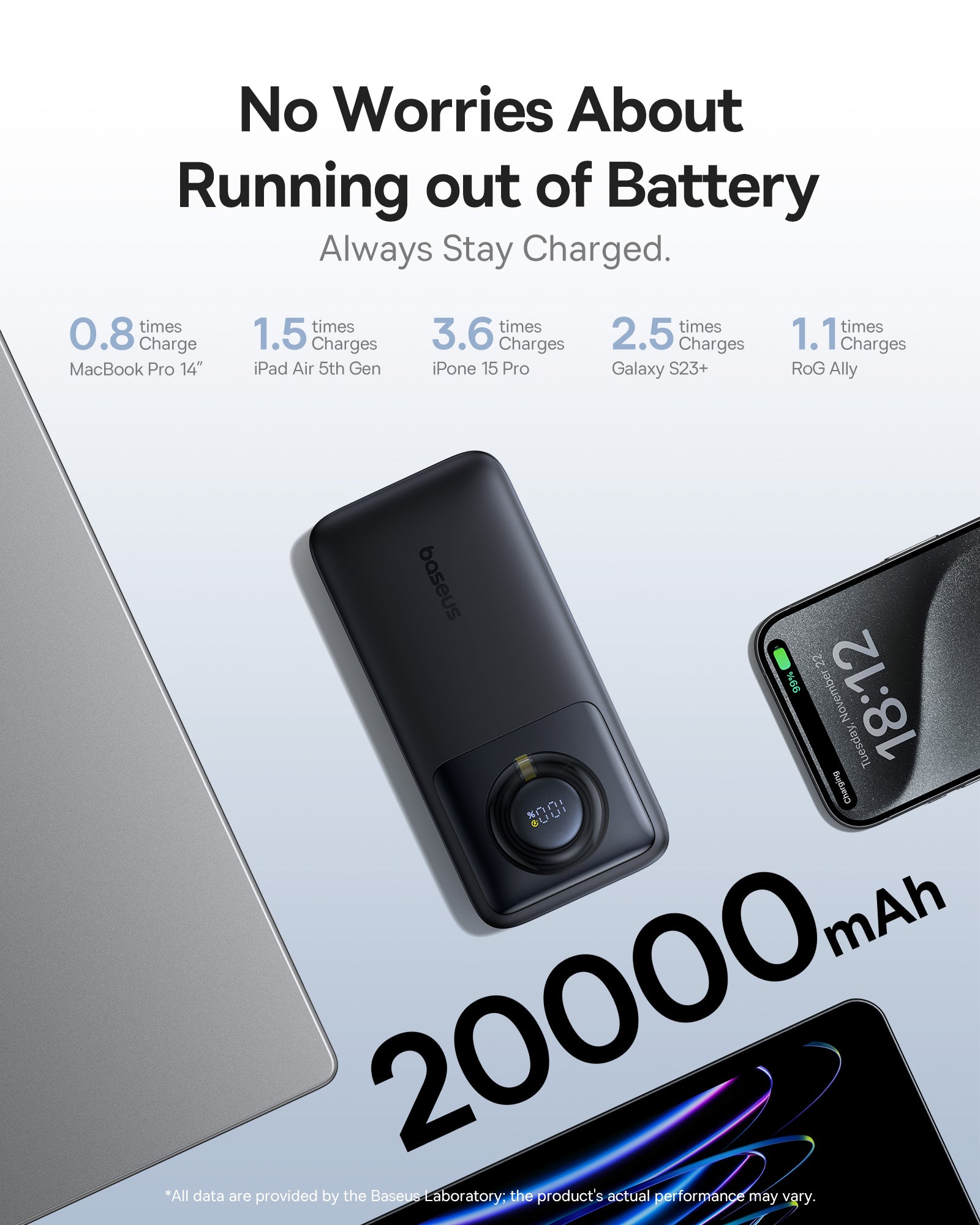 Power banka Baseus Free2Pull má kapacitu 20000 mAh a 65W rychlé nabíjení, které zvládne nabít notebook, telefon i bezdrátová sluchátka na cestách.