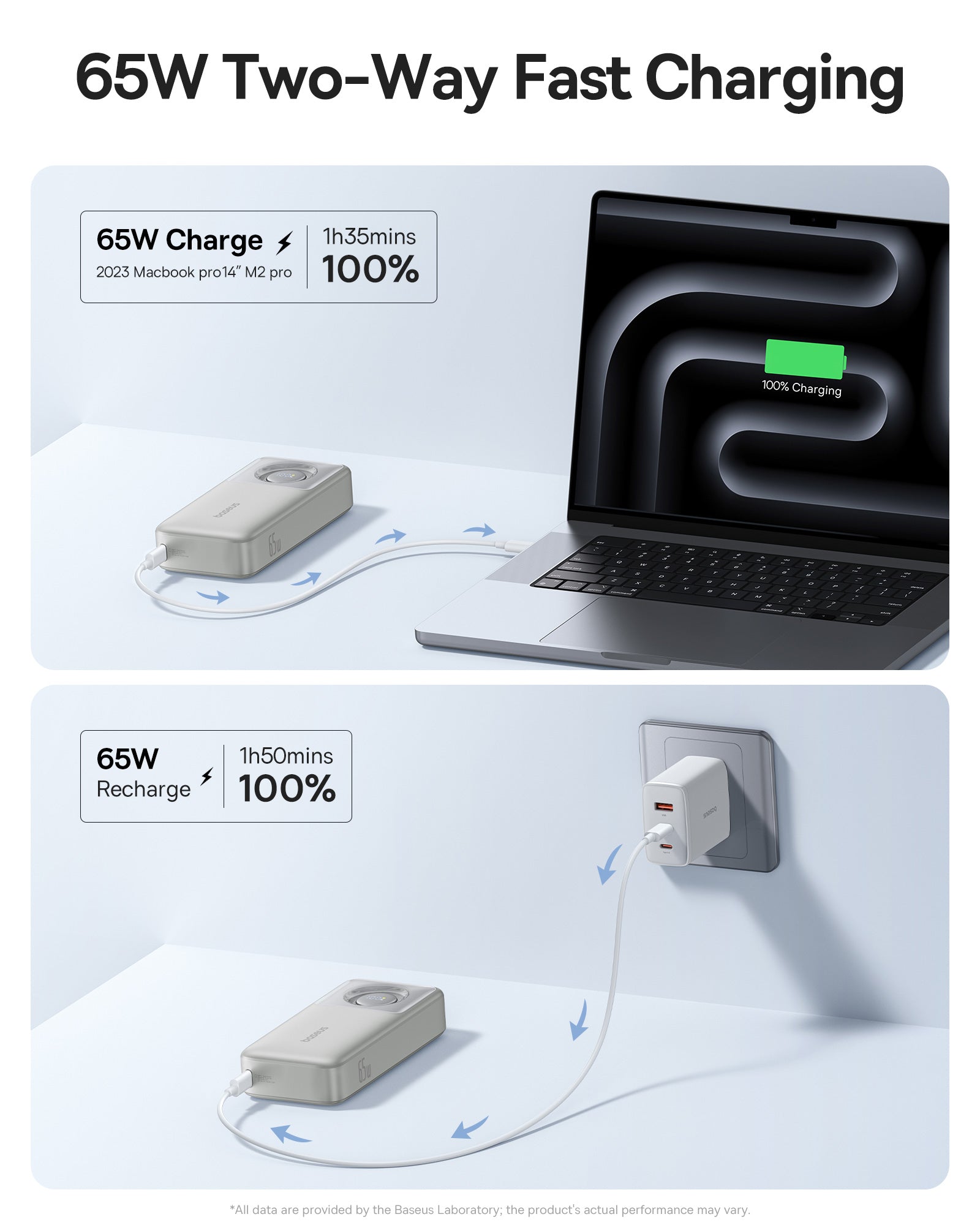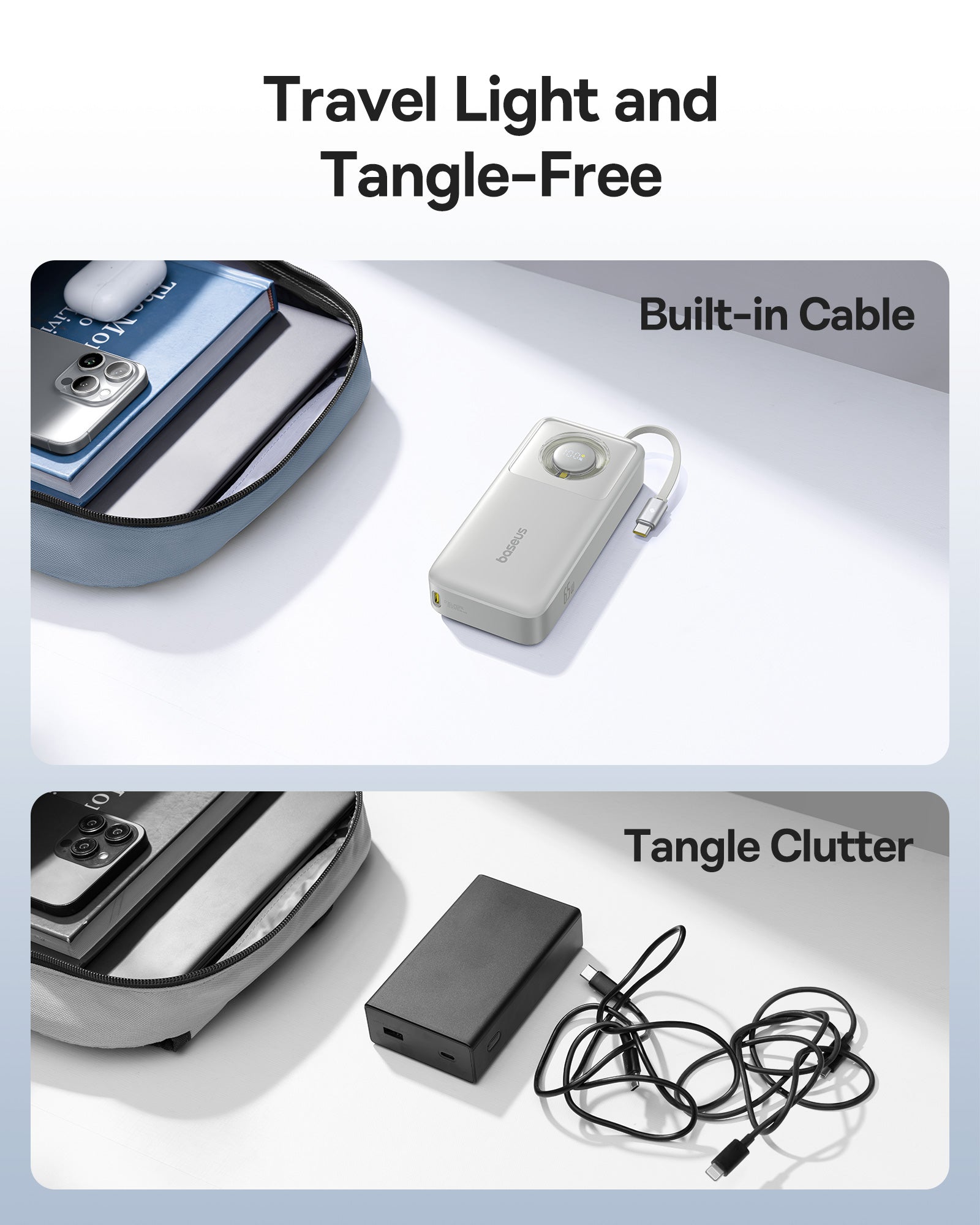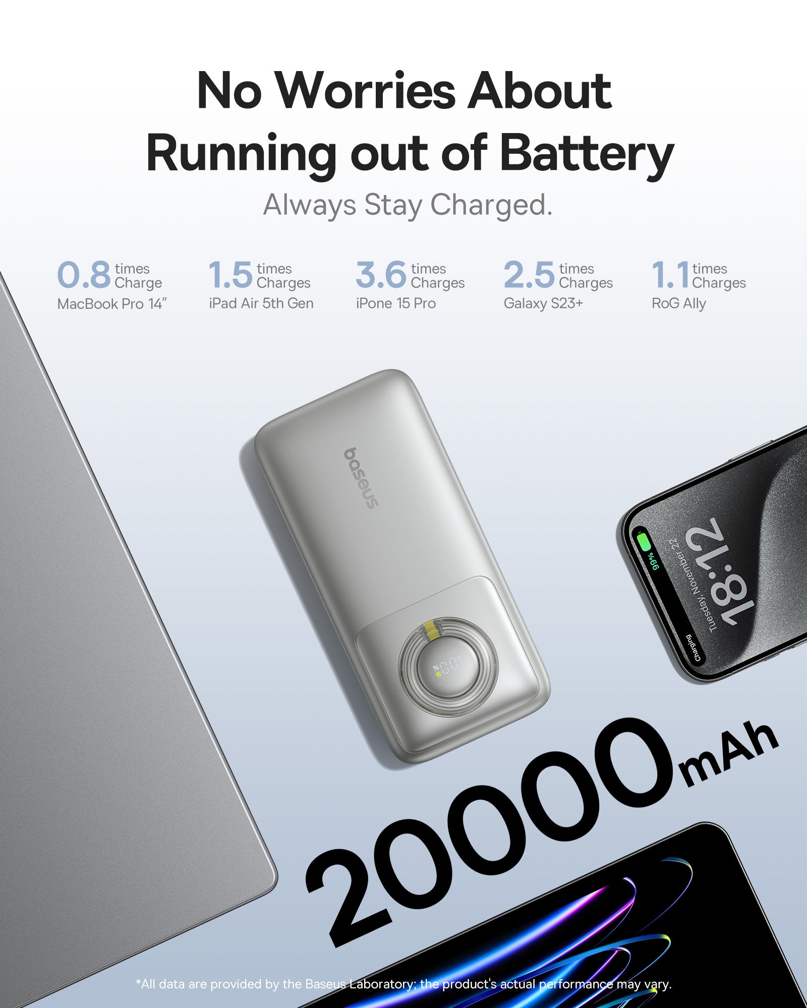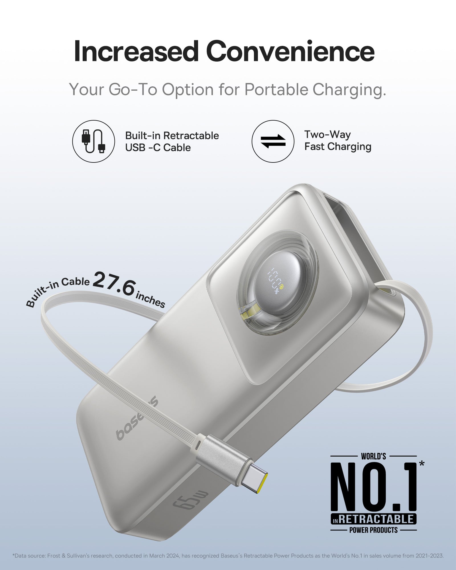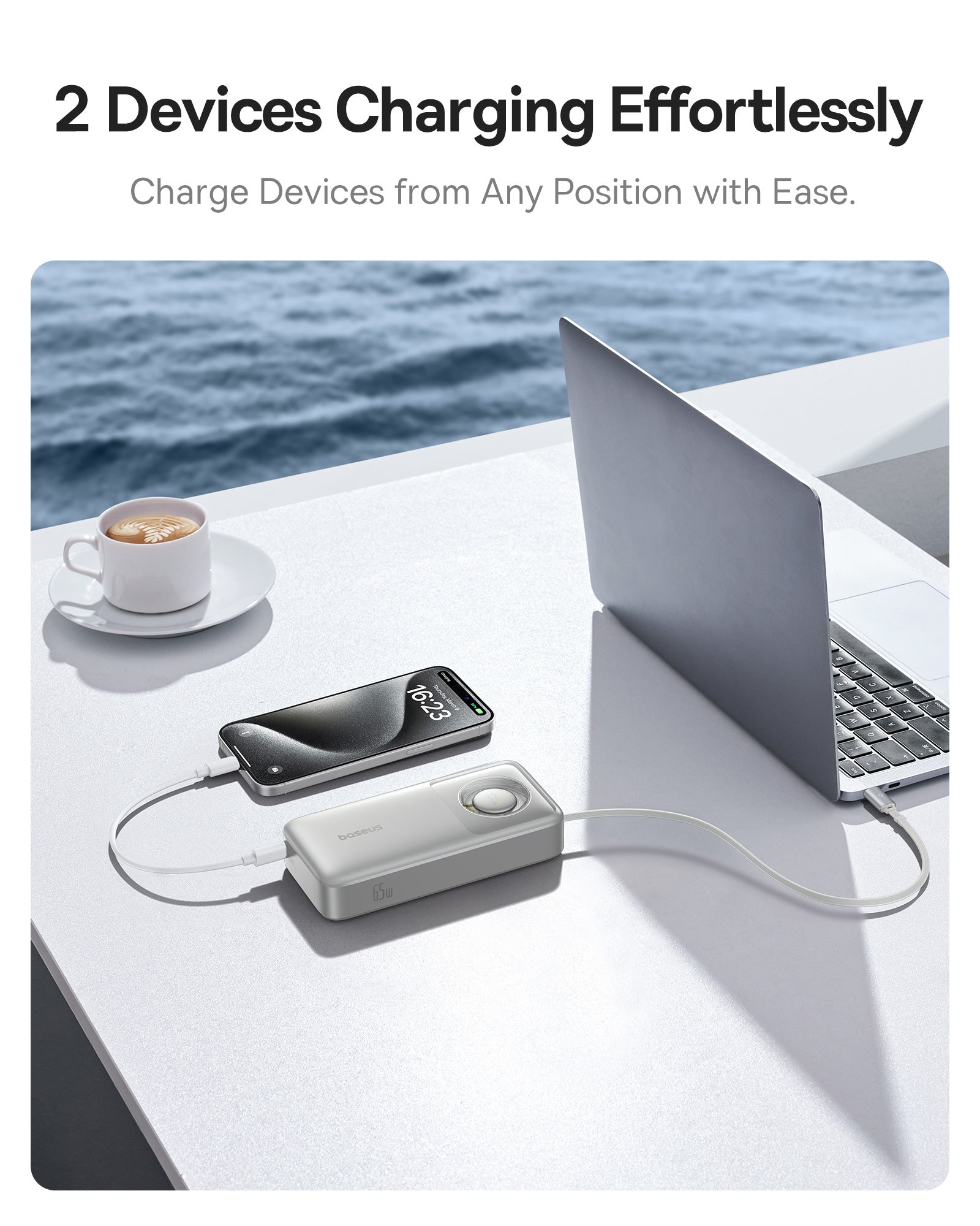Baseus Free2Pull power banka s kapacitou 20000 mAh a výkon 65 W, která udrží notebook, telefon i bezdrátová sluchátka v provozu. Vestavěný zatahovací kabel USB-C o délce 0,7 zajišťuje pořádek a pohodlné nabíjení bez zamotávání. LED displej zobrazuje zbývající energii. Díky portům USB-C a USB-A lze nabíjet více zařízení najednou. Kompatibilní se širokou škálou zařízení (iPhone, Samsung, Huawei, Xiaomi, Steam Deck, Nintendo Switch a další). Kompaktní a vhodná na cesty. Bezpečnostní ochrany proti přebití, zkratu, nadproudu a teplotě teploty a certifikace FCC, UL, IEC zajišťují spolehlivé používání.