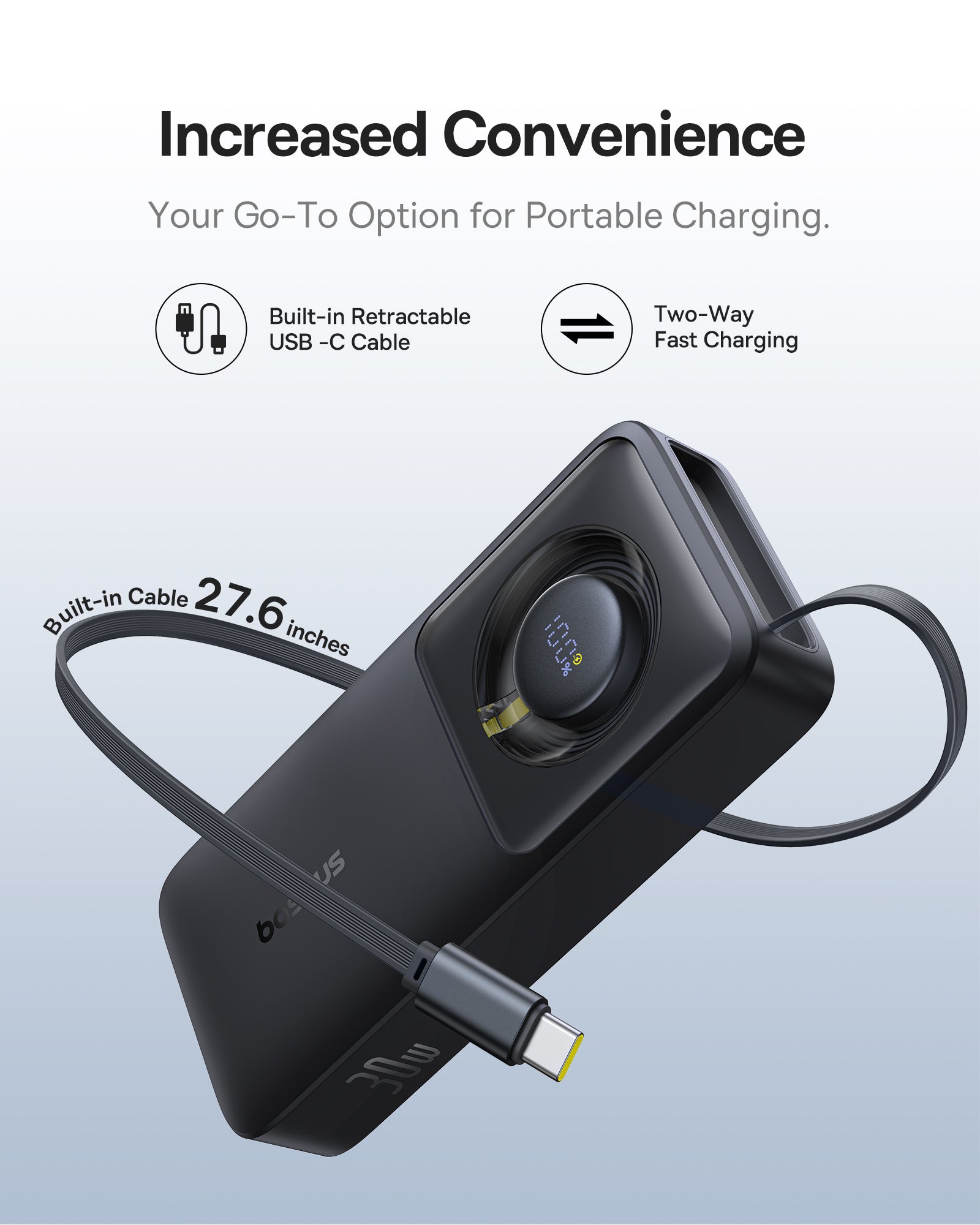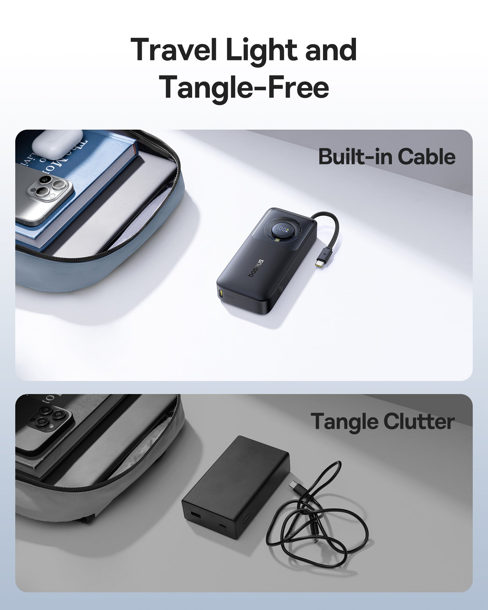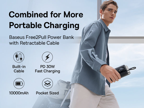 Powerbanka Baseus Free2Pull má kapacitu 10 000 mAh, která poskytuje dlouhou výdrž a umožňuje téměř dvakrát nabít iPhone 15 Pro. Díky dvěma výstupům (USB-C port a vestavěný kabel v těle) lze nabíjet dvě zařízení současně. Integrovaný 70 cm kabel vhodný zamotané kabely a snadno se ukládá do pouzdra. Powerbanka podporuje rychlé nabíjení až 30 W na výstupu a až 18 W samotné nabíjecí kapacity, takže nabíjení je rychlé pro telefon i tablet. Maximální proud na výstupu dosahuje 3 A. Bezpečnost zajišťující ochranu proti přehřátí, přetížení, přebití, zkratu a vybití. Podporuje PD (Power Delivery). Ideální pro cestovatele, obchodníky i outdoorové aktivity díky dlouhé výdrži a dvěma výstupům. Je kompaktní a snadno se ukládá do batohu.