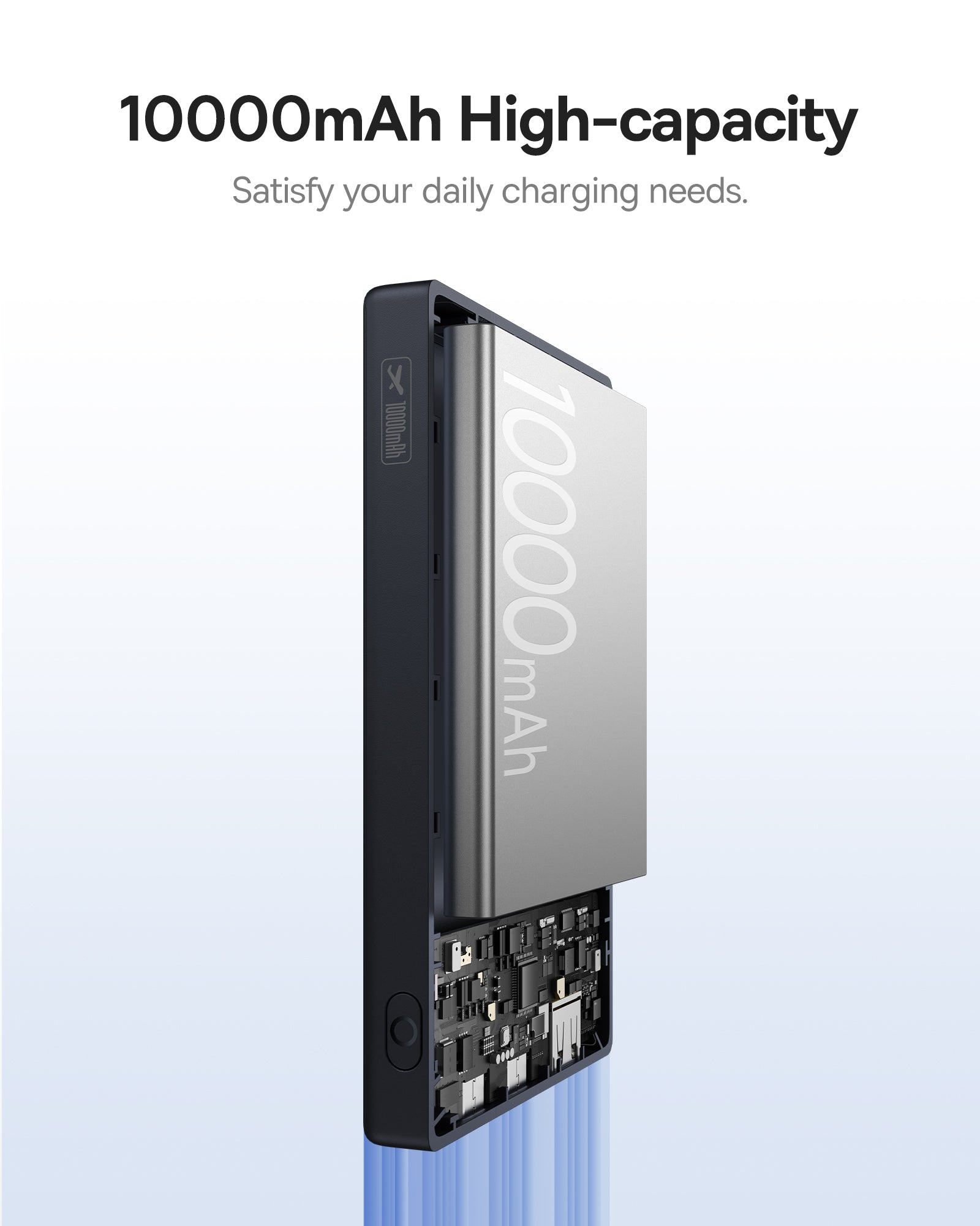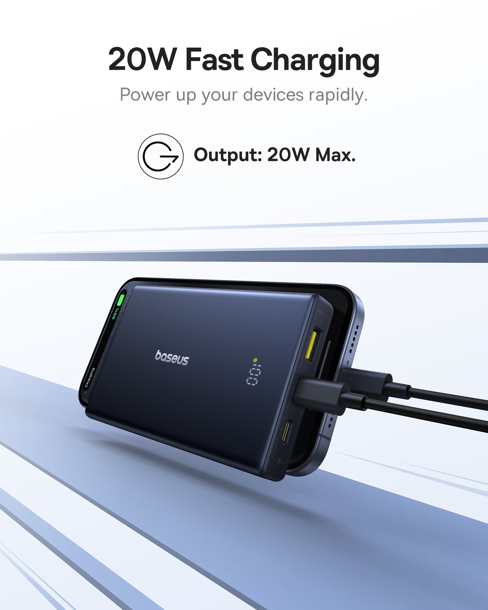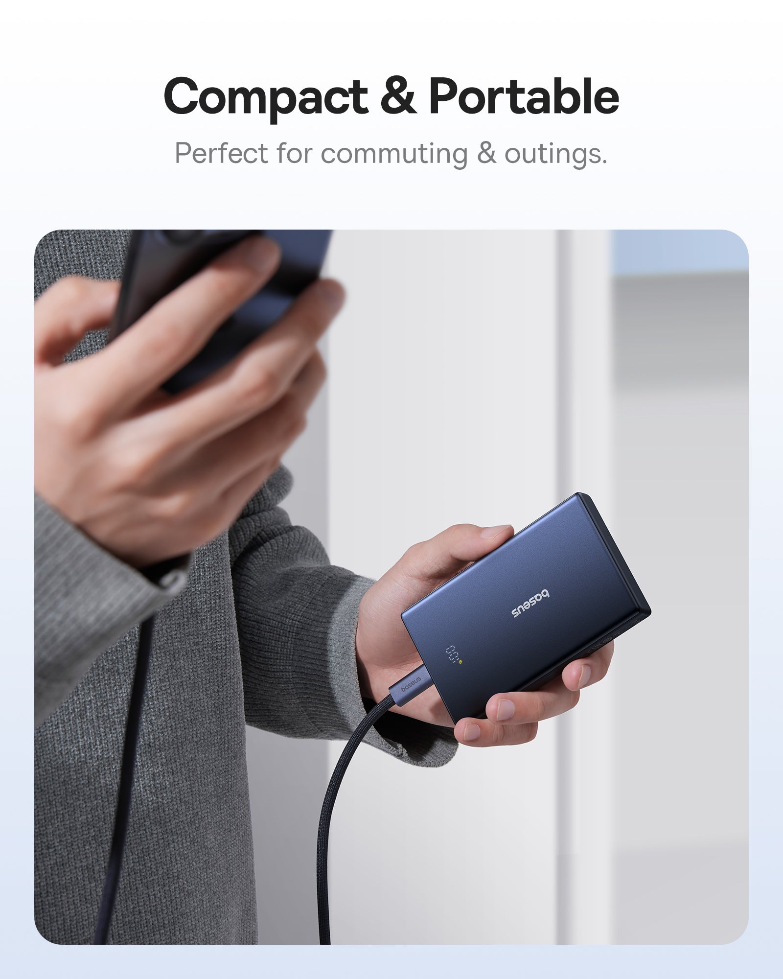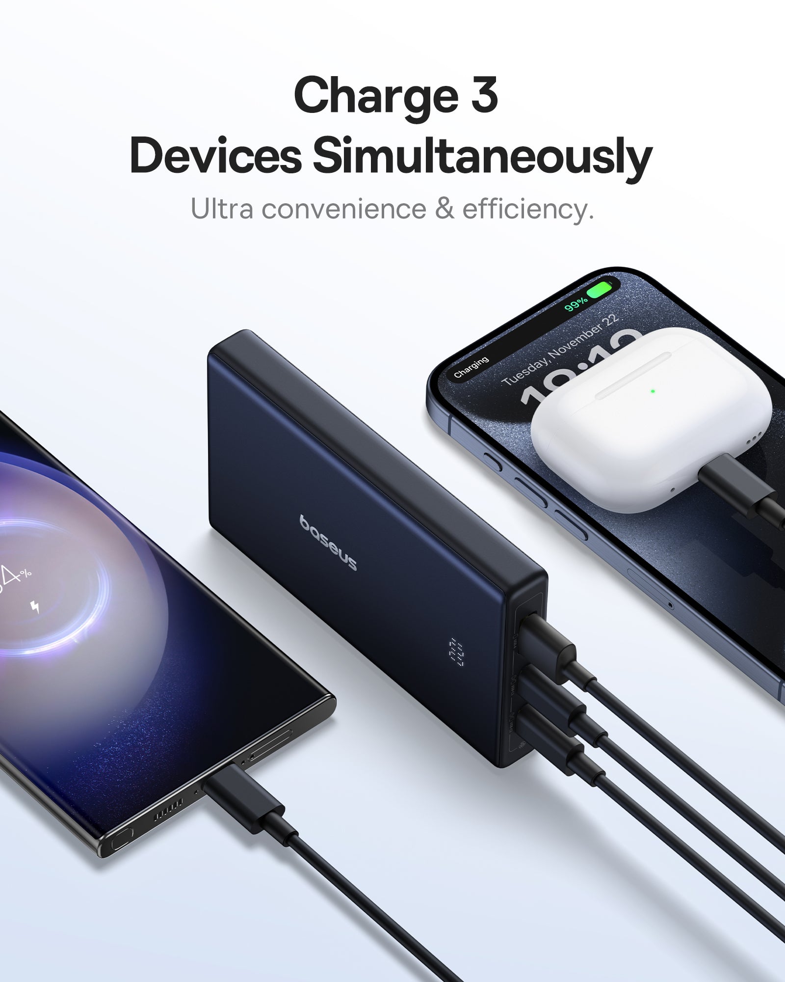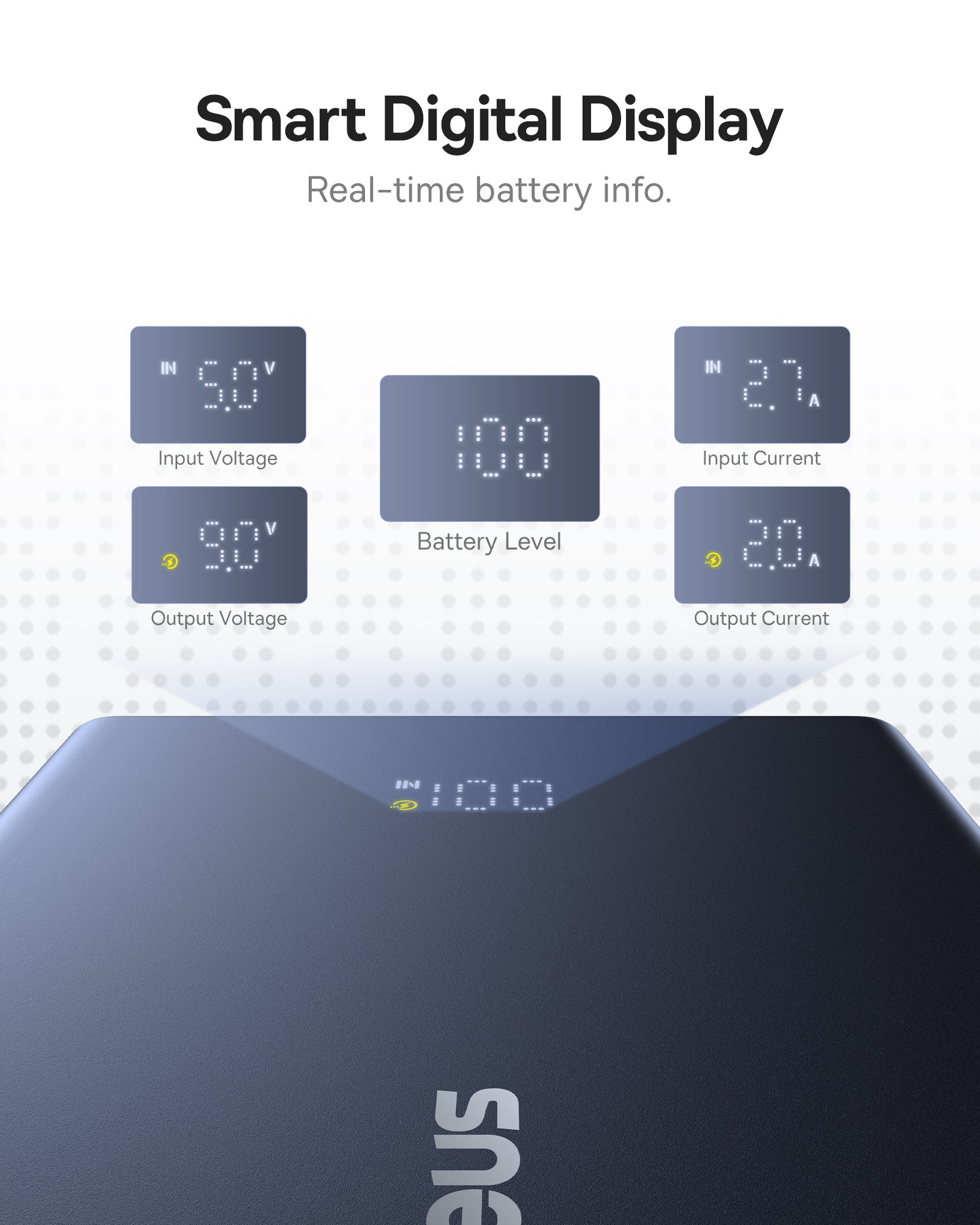 Integrovaný LED displej zobrazuje aktuální množství zbývající energie v reálném čase, abyste vždy věděli, kdy doplnit. Powerbanka má 1× USB-A a 2× USB-C port a umožňuje současné nabíjení až tří zařízení. V balení je 60 W kabel USB-C to USB-C o délce 30 cm, který díky PD podporuje rychlé nabíjení až do 60 W, což zajišťuje rychlý a spolehlivý přenos energie pro široké zařízení a nabíječku.