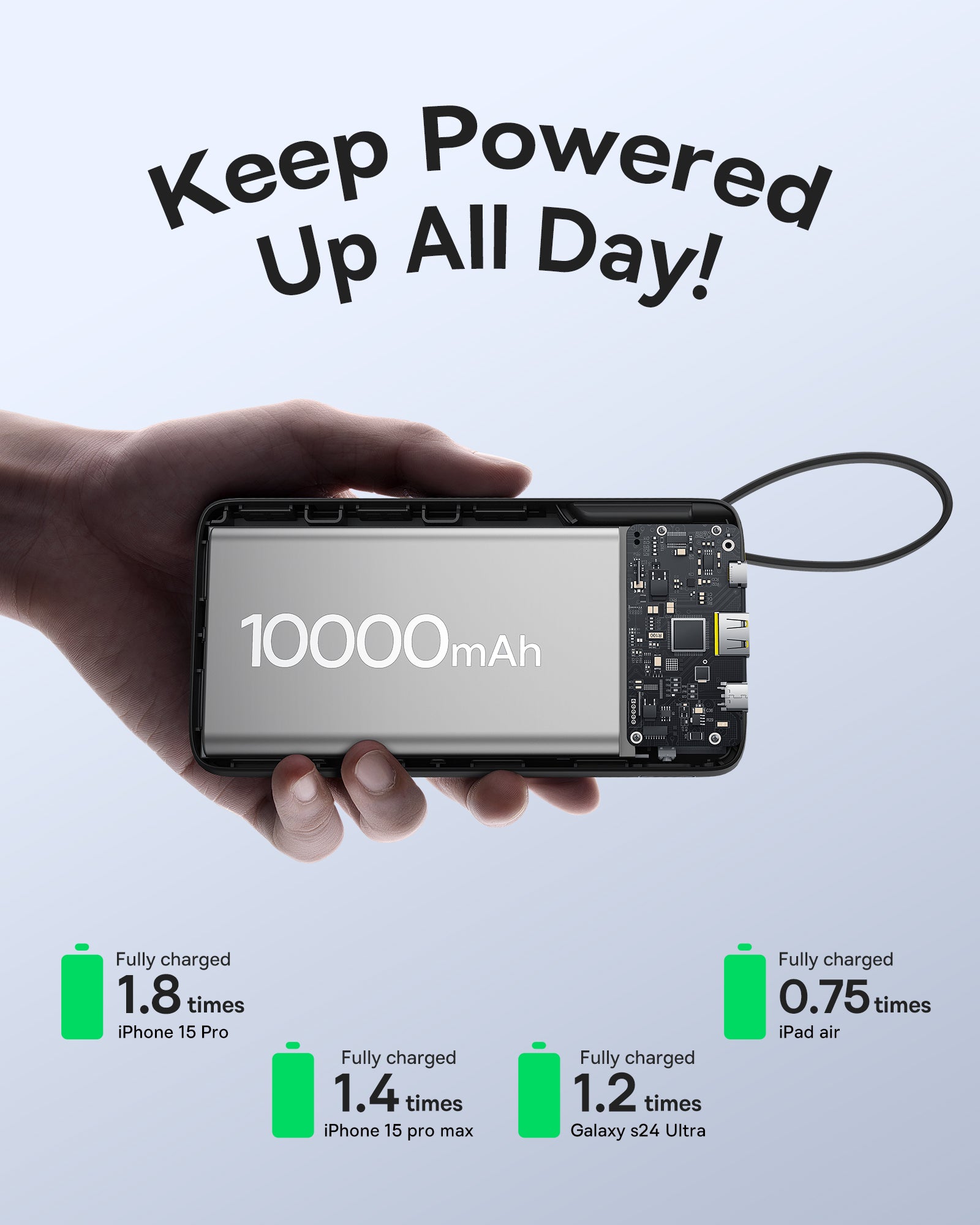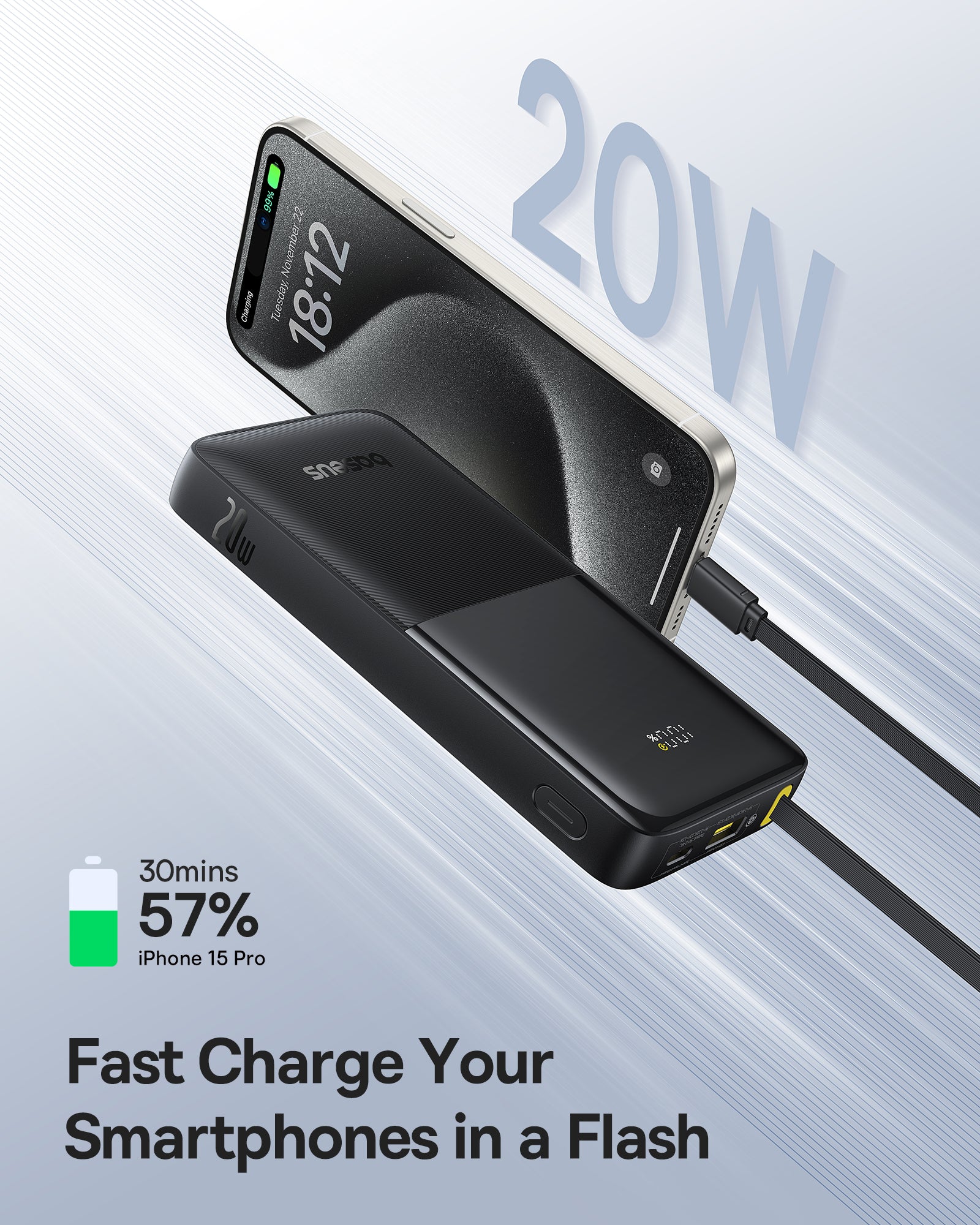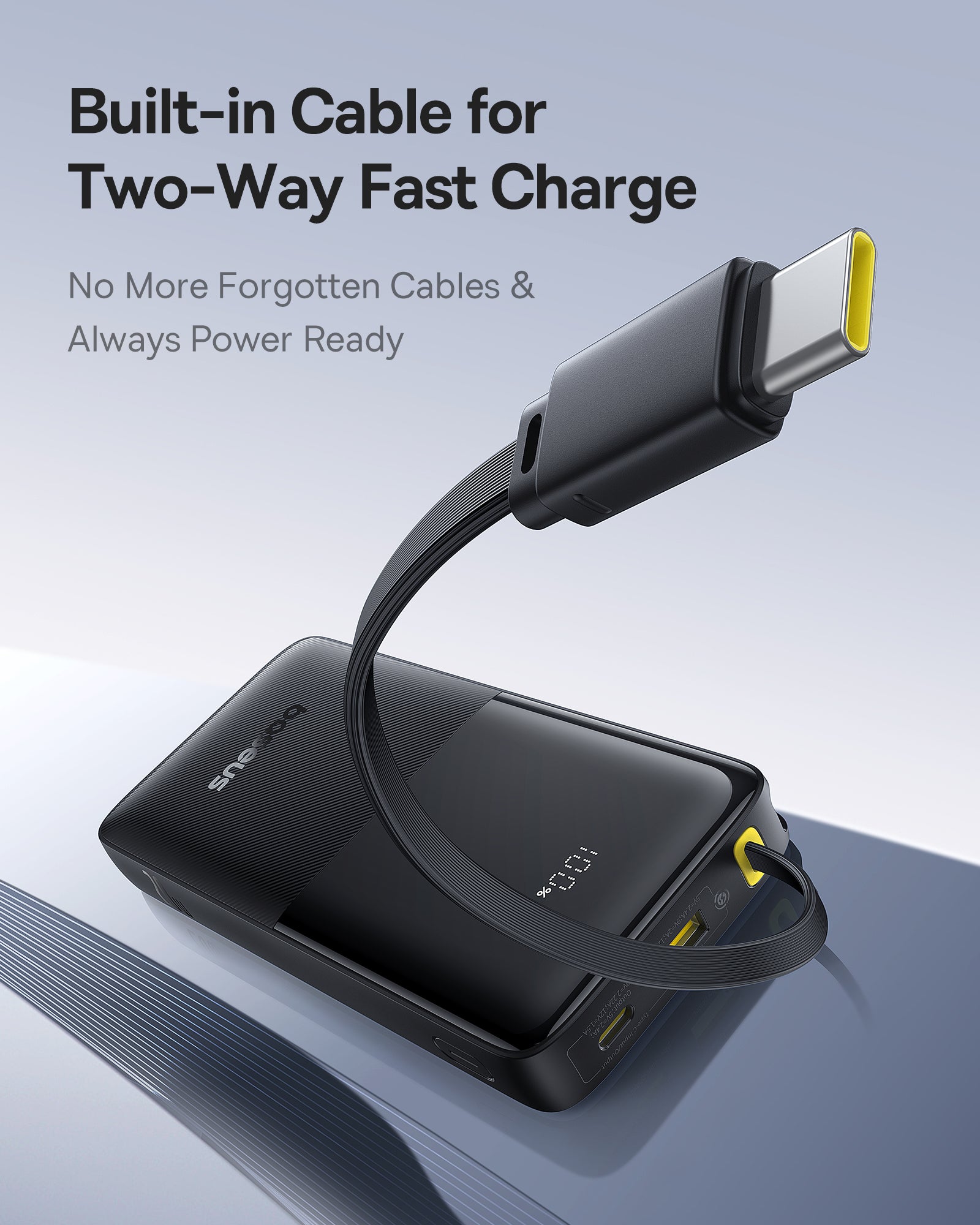 Baseus Bipow Power Bank 10 000 mAh, 20 W je kompaktní a vysoce kapacitní powerbanka určená pro použití na cestách. Disponuje rychlým nabíjením a vestavěným USB-C kabelem, což umožňuje nabíjet chytré telefony, tablety a další zařízení i bez vyhledávání kabelů. S kapacitou 10 000 mAh poskytuje dostatek energie pro opakované nabití většiny smartphonů. Výstupní výkon až 20 W zajišťuje rychlé nabíjení. K dispozici jsou USB-A a USB-C porty a integrovaný kabel typu C, takže lze nabíjet více zařízení současně.