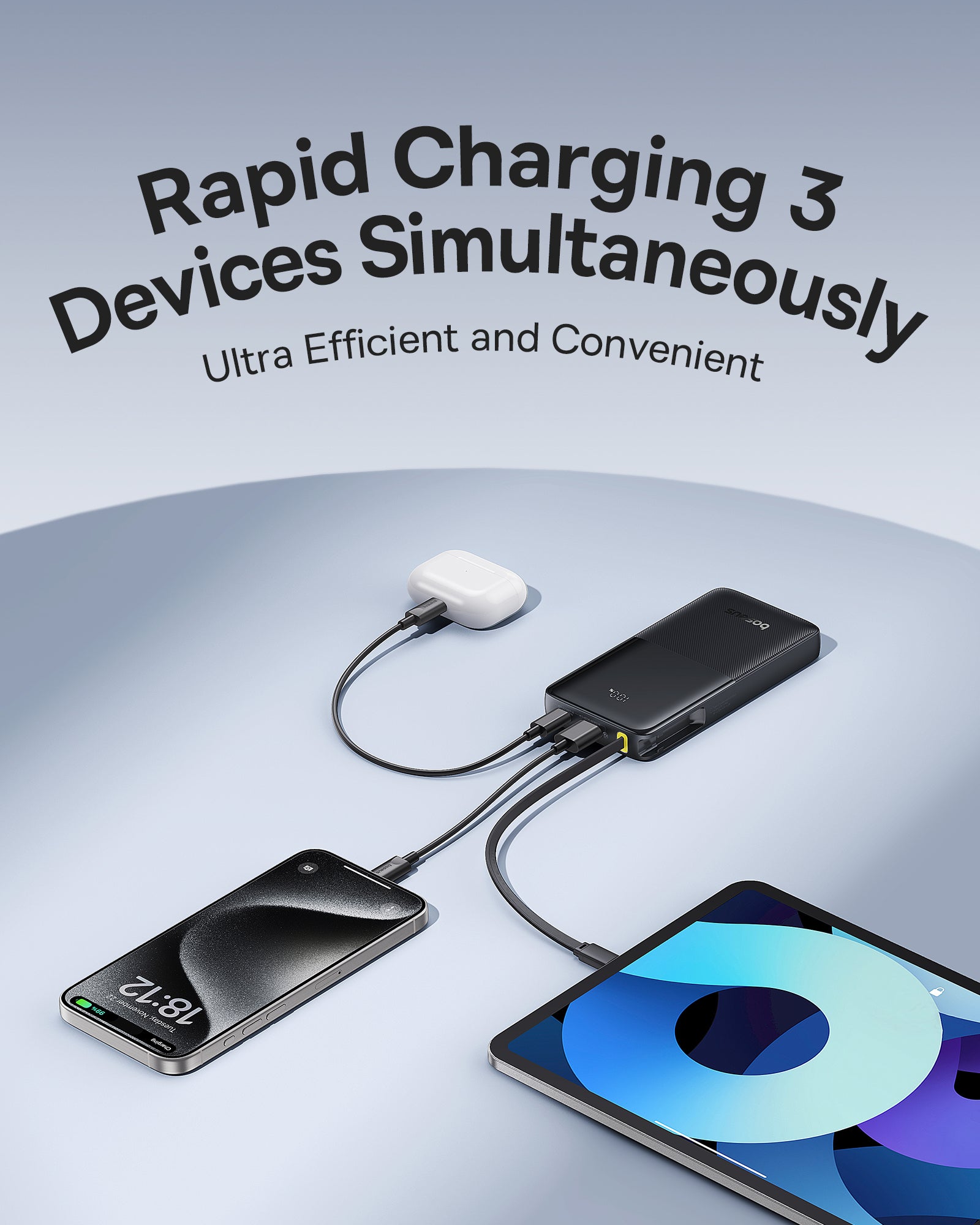 Digitální displej ukazuje zbývající energii a stav nabíjení v reálném čase. Kompaktní a lehký design (hmotnost 271 g) poskytuje přenášení a vejde se do kapsy nebo tašky. Zabezpečení zahrnuje ochranu proti přebití, nadměrnému vybití a zkratu, které chrání jak powerbanku, tak vaše zařízení.