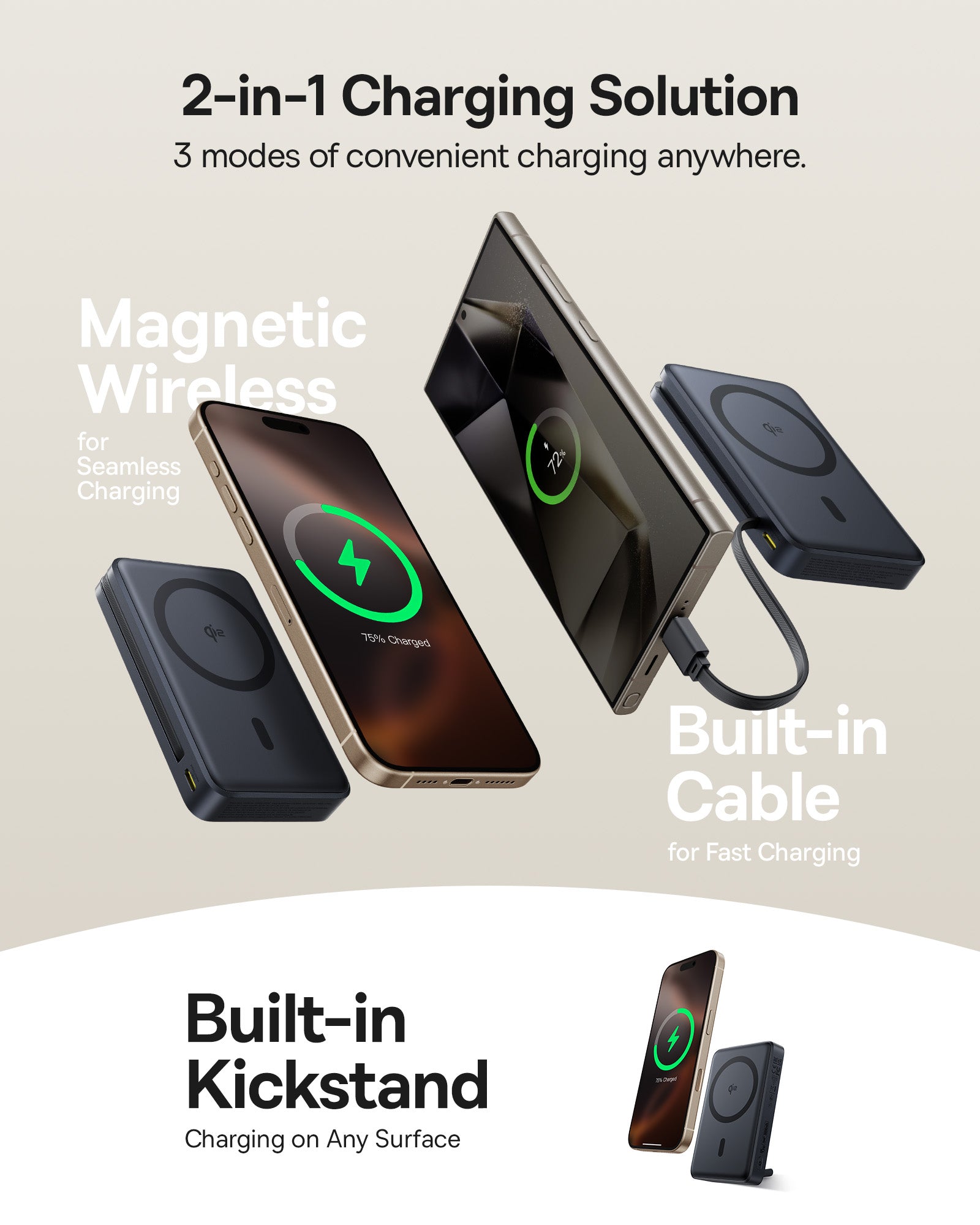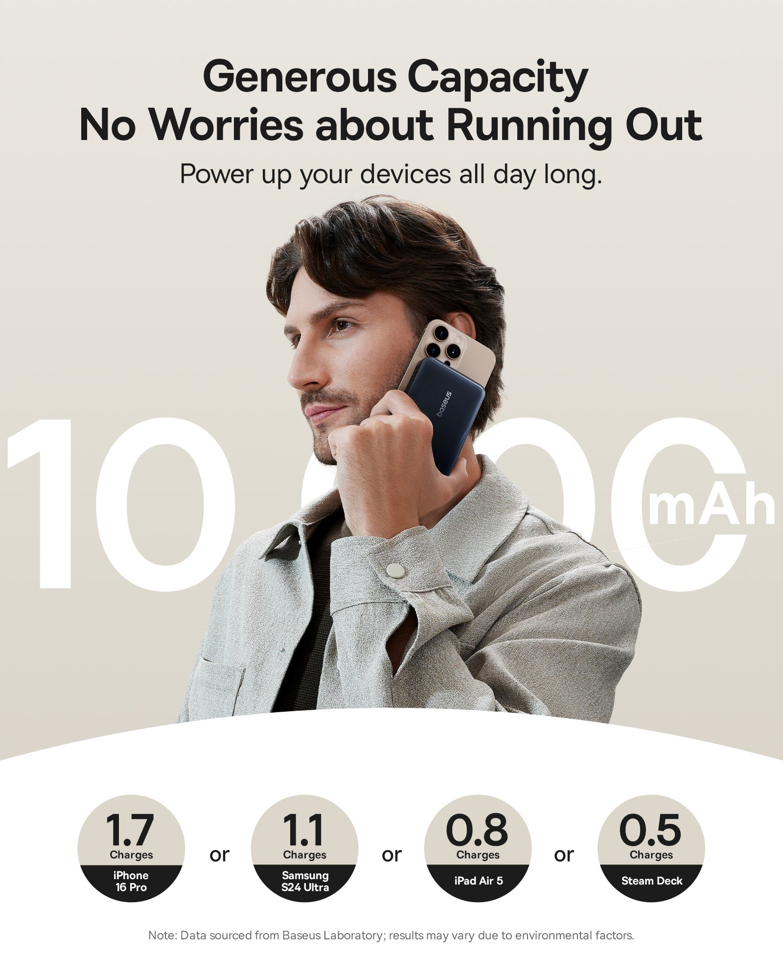 Baseus Nomos Qi2 je kompaktní powerbanka 3v1, která kombinuje Qi2 bezdrátové nabíjení, MagSafe kompatibilitu a rychlé USB-C nabíjení. S kapacitou 10000 mAh nabízí až 15 W bezdrátového nabíjení pro telefony kompatibilní s Qi/MagSafe a umožňuje současné nabíjení až tři zařízení – dvě USB-C a bezdrátová plocha. Integrovaný 45W USB-C kabel podporuje 45W výstup a 30W vstup, takže nepotřebujete další kabely. Konstrukce se sklápěcím stojánkem nabízí použití na stole, a díky nízké hmotnosti 230 ga rozměrům 10,6 x 6,78 x 1,96 cm je snadno přenosná. Vestavěný chytrý displej zobrazuje průběh nabíjení v reálném čase a odvod tepla chrání vaše zařízení i samotnou powerbanku. Ideální pro cestování, kancelář i domácnost.
