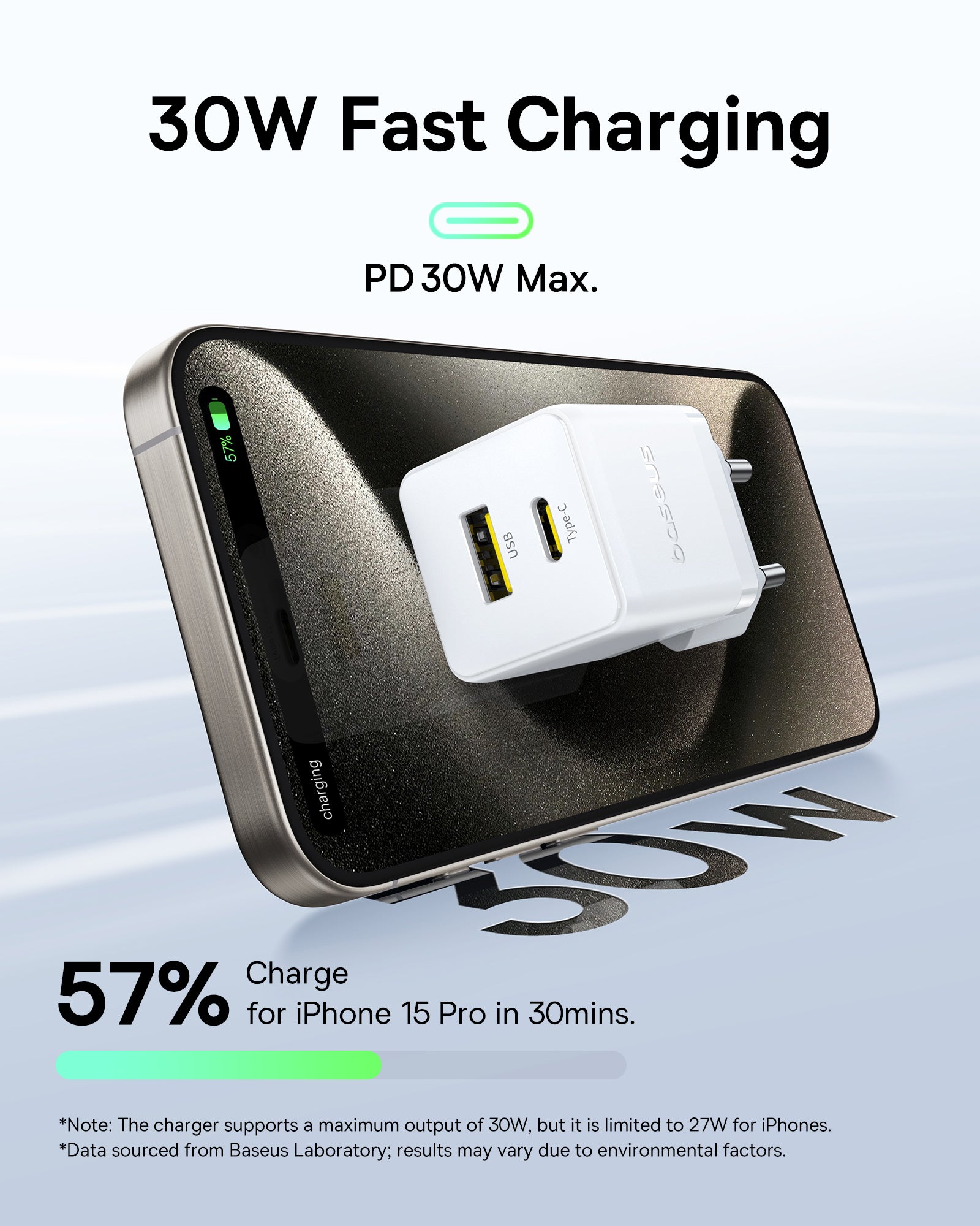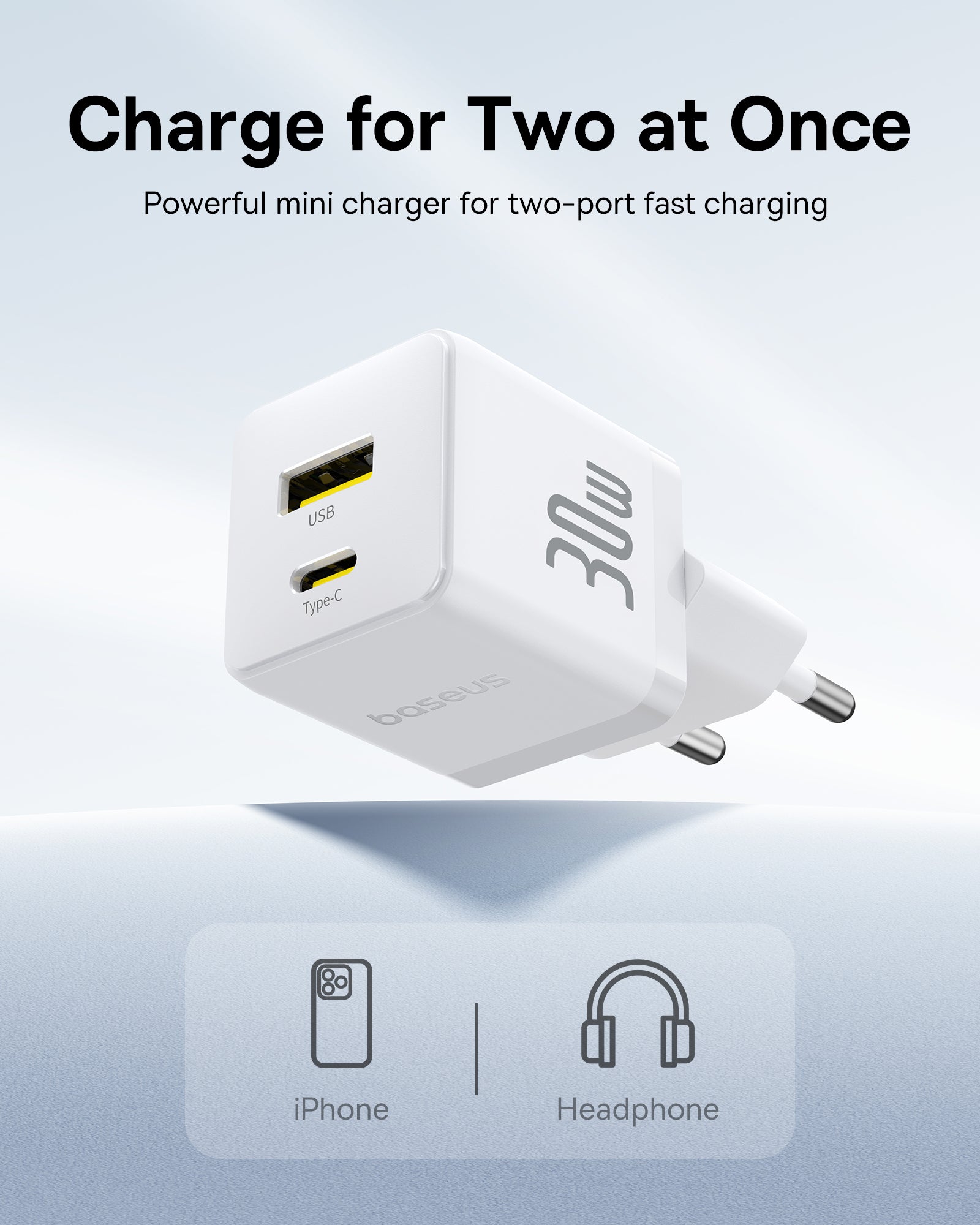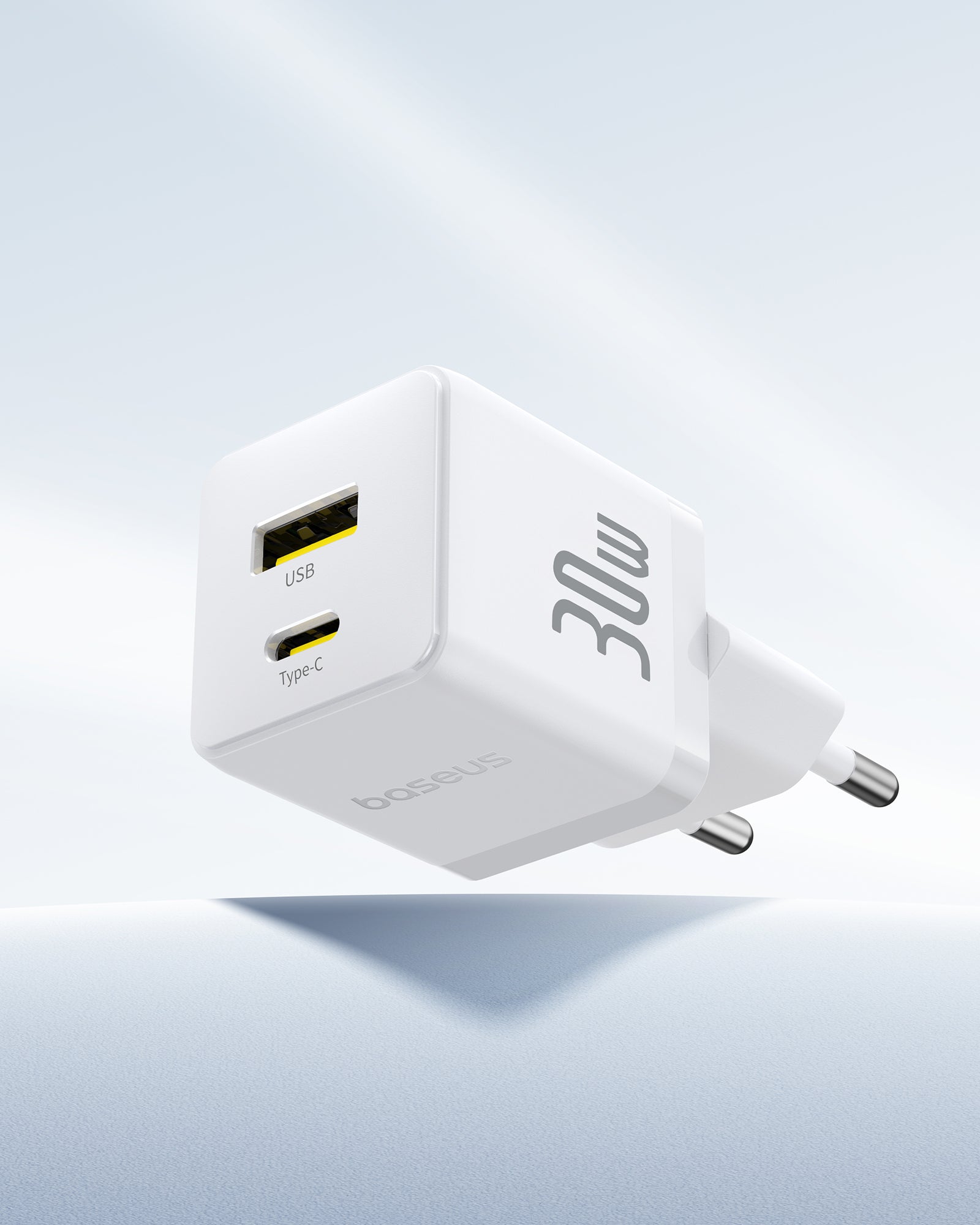Kompatní 30W rychlá nabíječka s podporou PD3.0 a QC3.0 pro nabíjení zařízení s USB‑C i USB‑A. Technologie Baseus BCT zajišťuje chytré řízení teploty pro optimální odvod tepla i při náročném nabíjení a poskytuje ochranu proti podpětí, rušení, přepětí, nadproudu, nadměrnému napájení, zkratu, teplotě a antistatické ochraně. Kompaktní rozměry a nízká hmotnost (cca 53,6 g) usnadňují přenos a skladování. Vstup je AC100-240V~, 50/60Hz, 0,8A Max. Výstupy: Type-C až 30 W (5,0V=3,0A; 9,0V=3,0A; 12,0V–2,5A; 15,0V=2,0A; 20,0V=1,5A); USB-A až 30 W (5,0V=3,0A; 9,0V=3,0A; 12,0V–2,5A; 20,0V=1,5A); kombinace Type-C+USB-A 30 W.