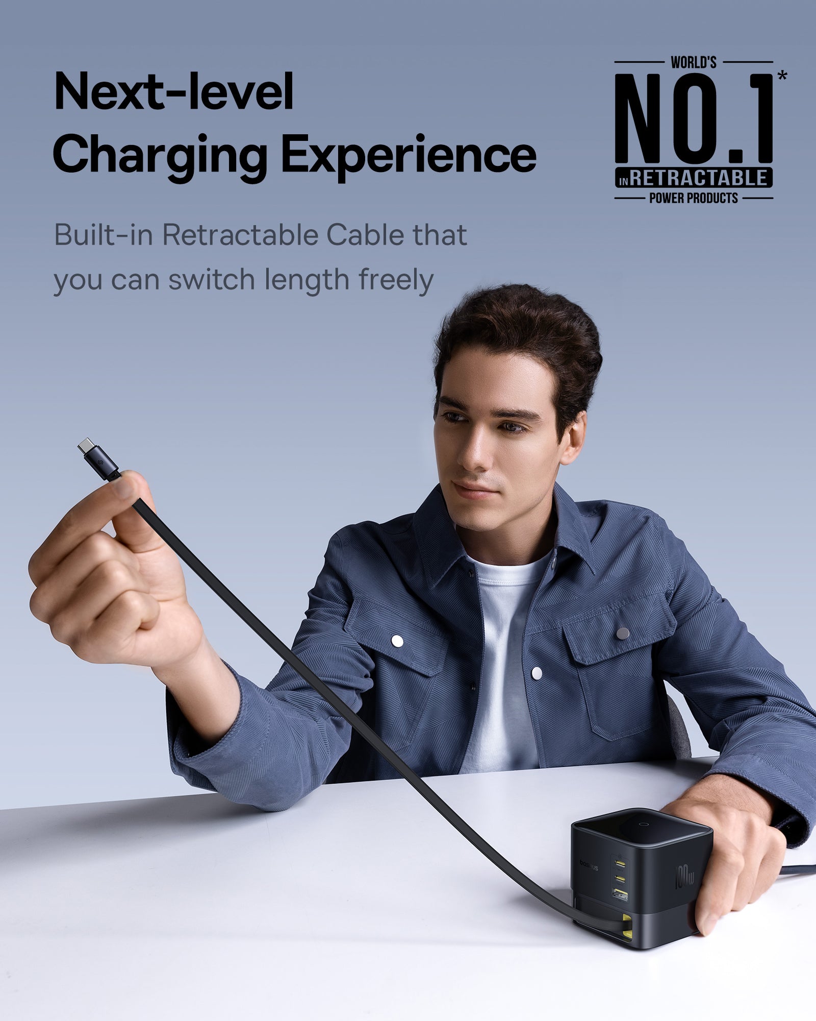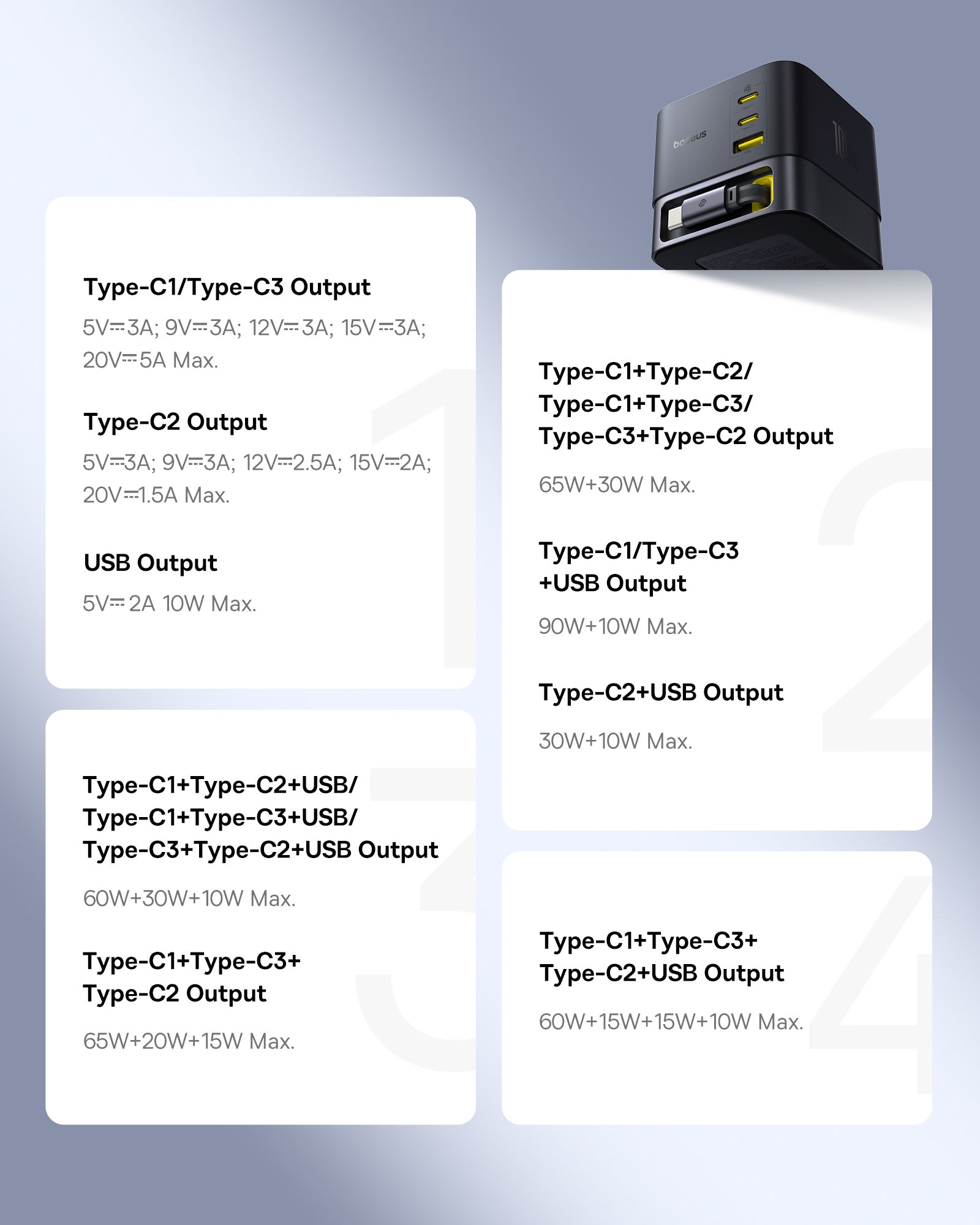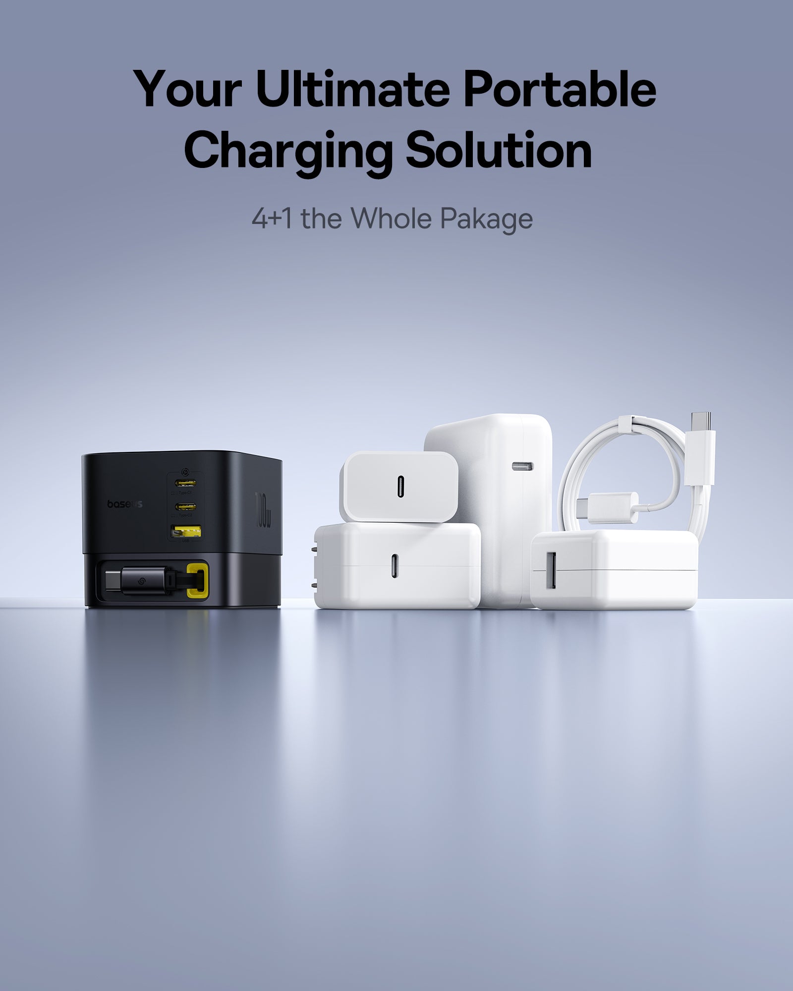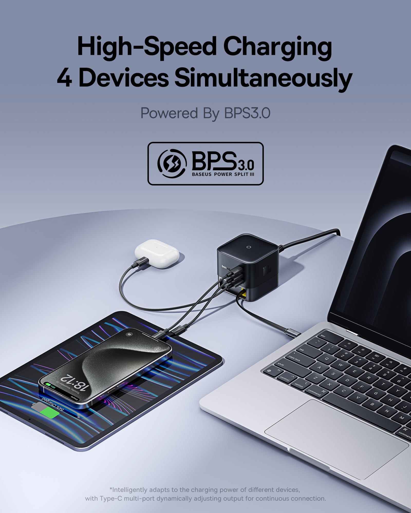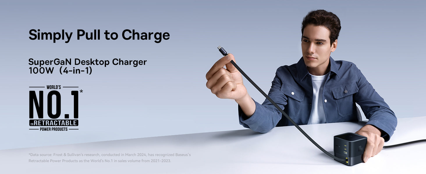 Baseus Super GaN Charger 100W je kompaktní nabíječka s technologiemi GaN6, která poskytuje až 100 W a umožňuje nabíjet až čtyři zařízení současně díky třem USB‑C portům a jednomu USB‑A portu. Podporuje rychlé protokoly Power Delivery (PD) a Quick Charge (QC). Integrovaný zatahovací kabel‑C dlouhý 82 cm USB cestujete a skladování, zatímco protiskluzová základna zajišťuje stabilitu na stole.