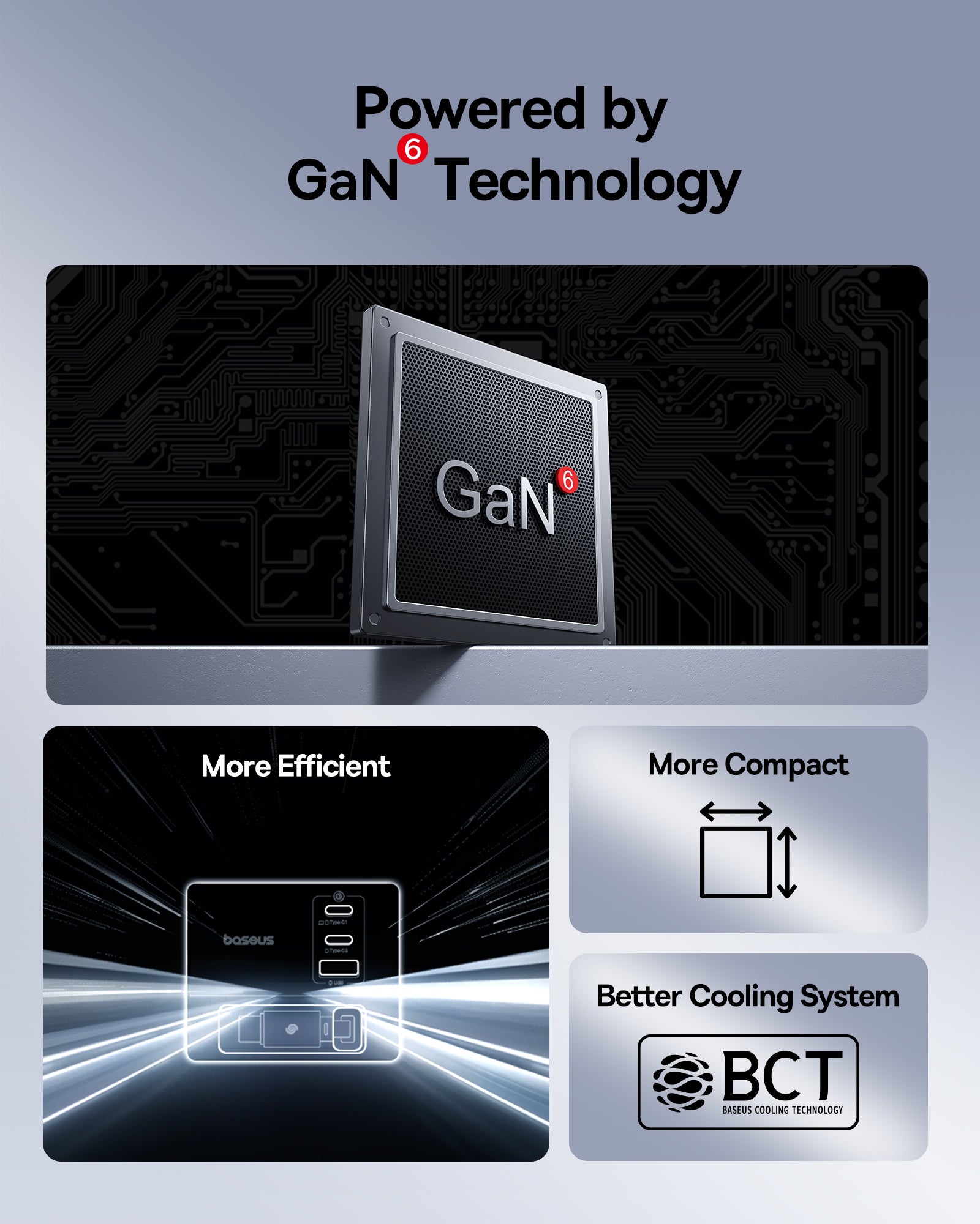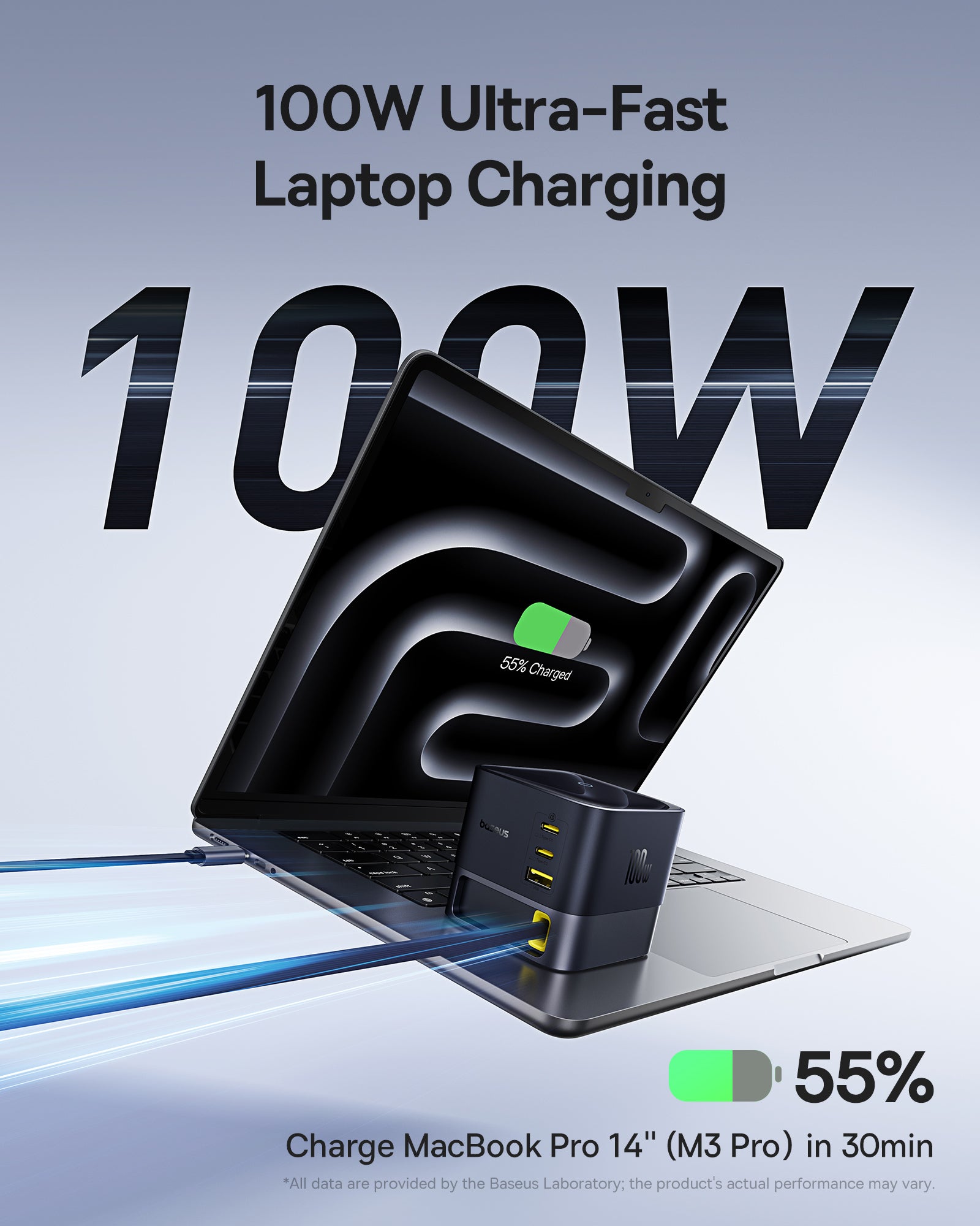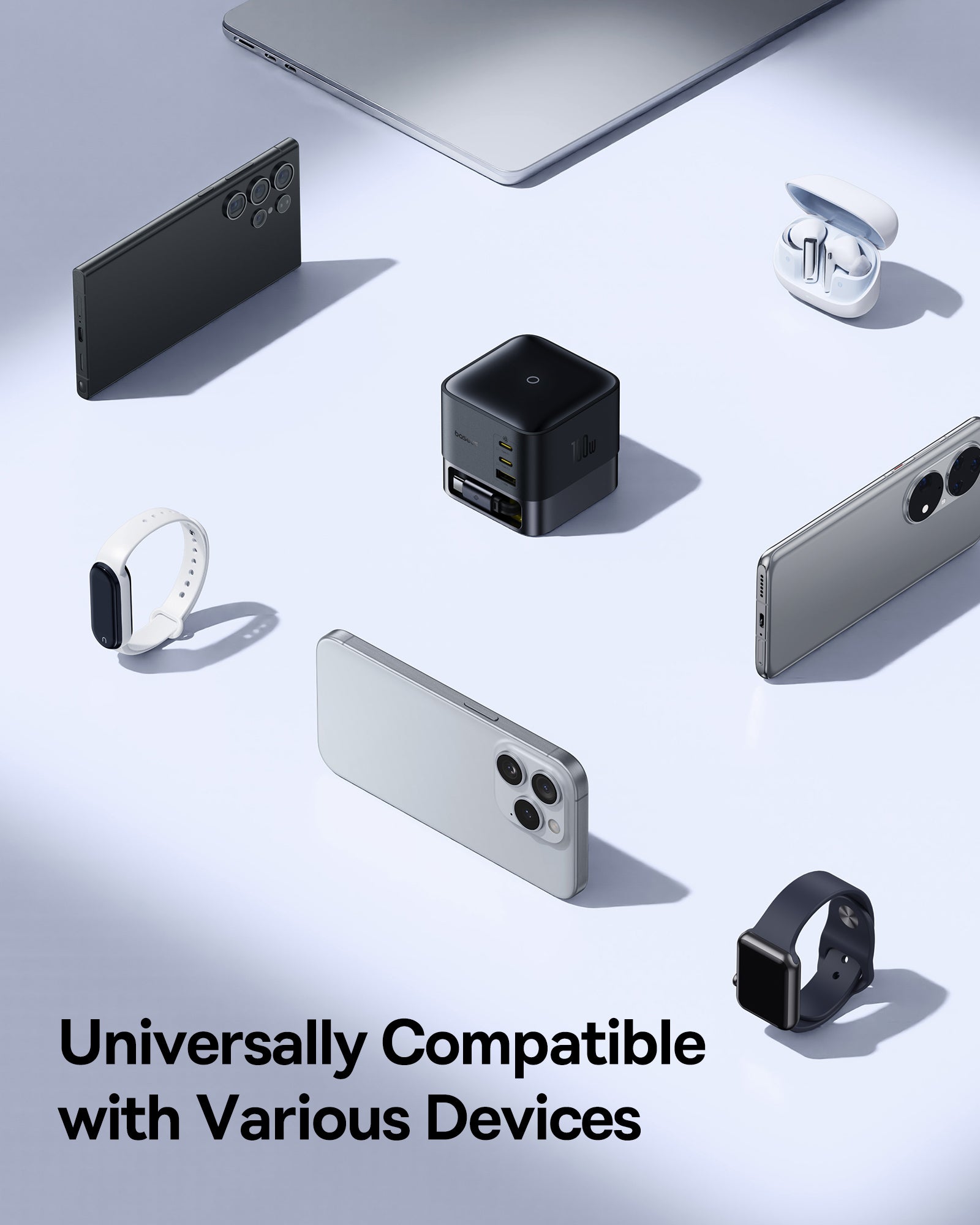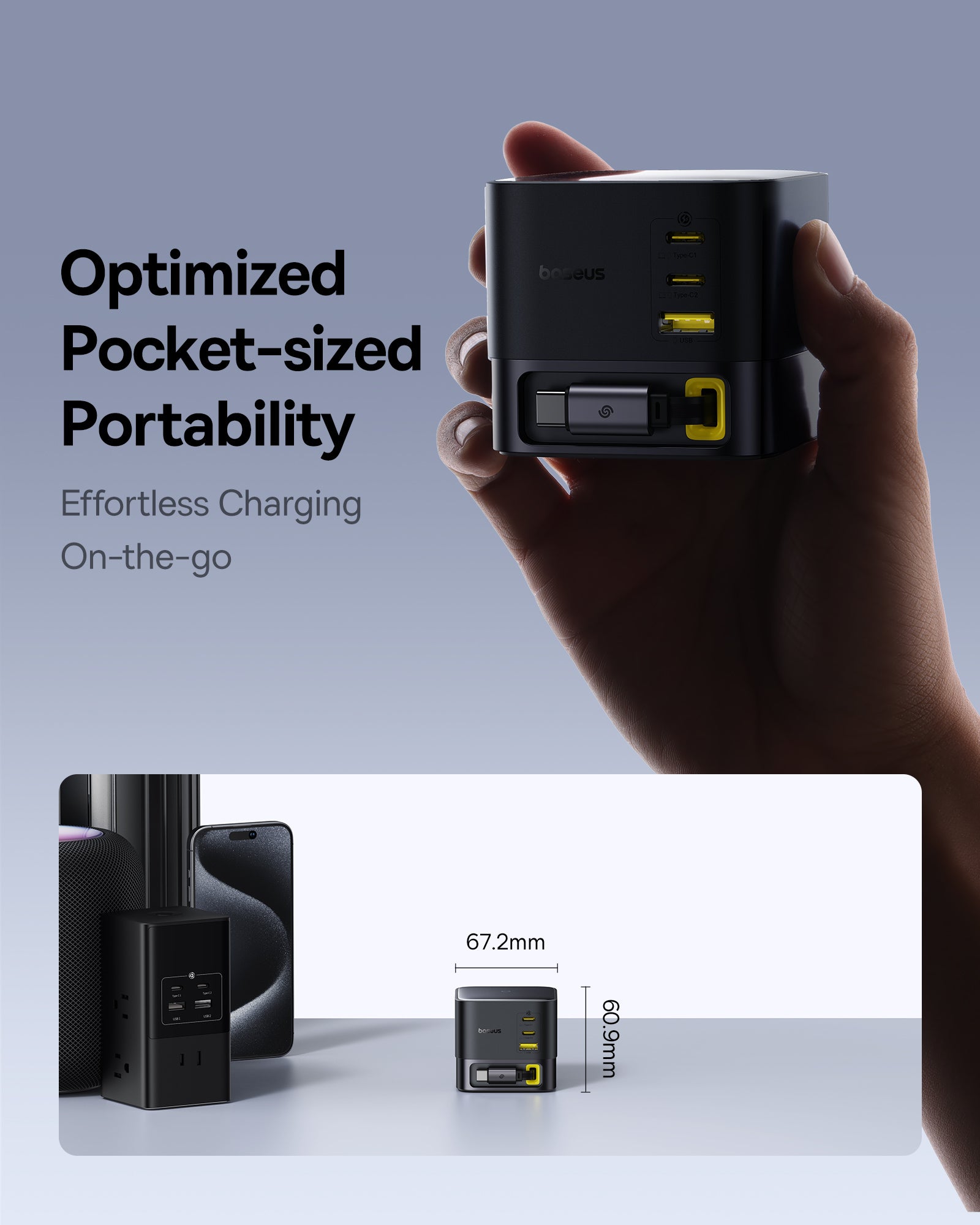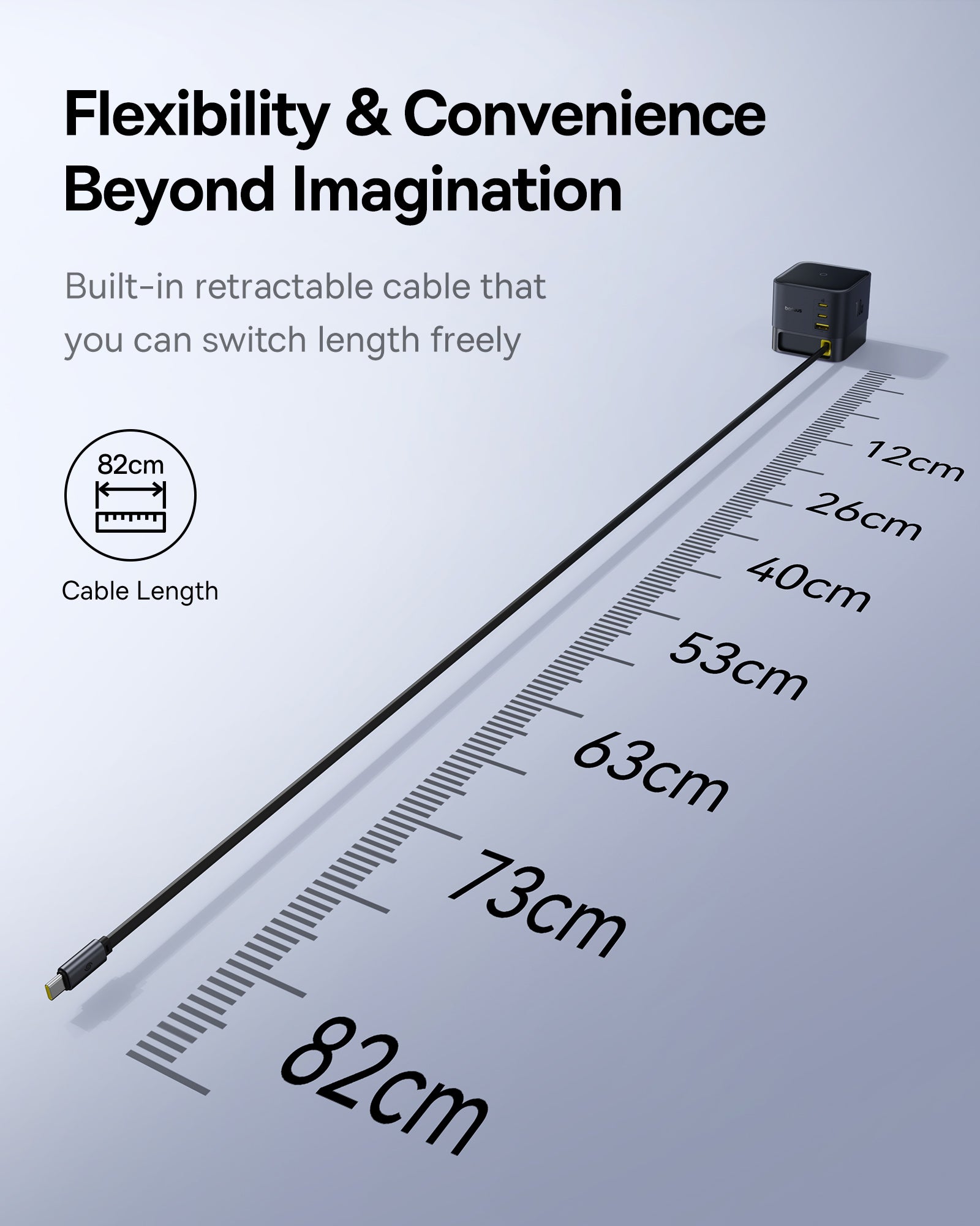 Baseus Super GaN Charger 100W je kompaktní nabíječka s technologiemi GaN6, která poskytuje až 100 W a umožňuje nabíjet až čtyři zařízení současně díky třem USB‑C portům a jednomu USB‑A portu. Podporuje rychlé protokoly Power Delivery (PD) a Quick Charge (QC). Integrovaný zatahovací kabel‑C dlouhý 82 cm USB cestujete a skladování, zatímco protiskluzová základna zajišťuje stabilitu na stole.