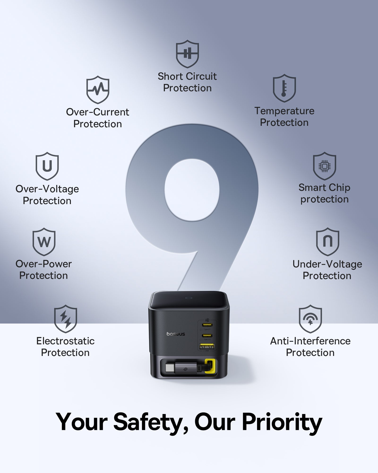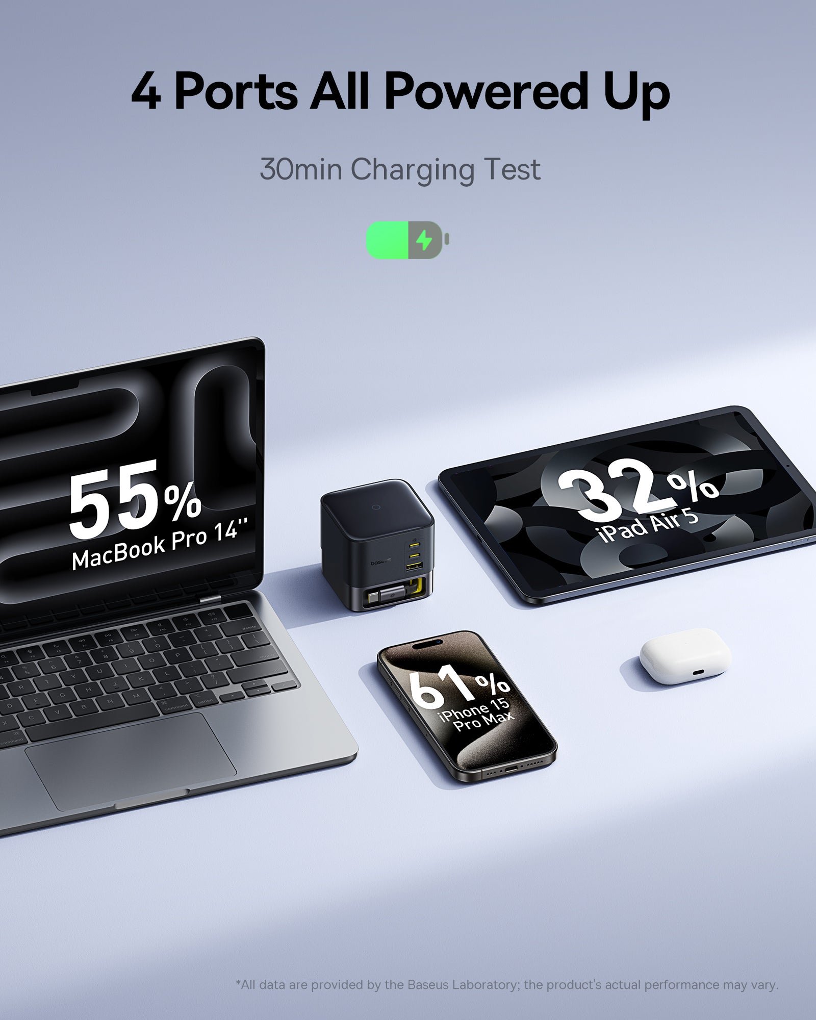 Díky širokému vstupnímu napětí 100–240 V je nabíječka vhodná pro použití po celém světě. Celkový výkon umožňuje rychlé nabití i energeticky náročná zařízení, například 16" MacBook Pro lze plně nabít za cca 1,8 hodiny. 9vrstvá bezpečnostní ochrana chrání zařízení před přepětím, přehřátím a zkratem. Kompatibilní je s širokou škálou zařízení od Apple, Samsung, Huawei, Xiaomi a škál dalších.