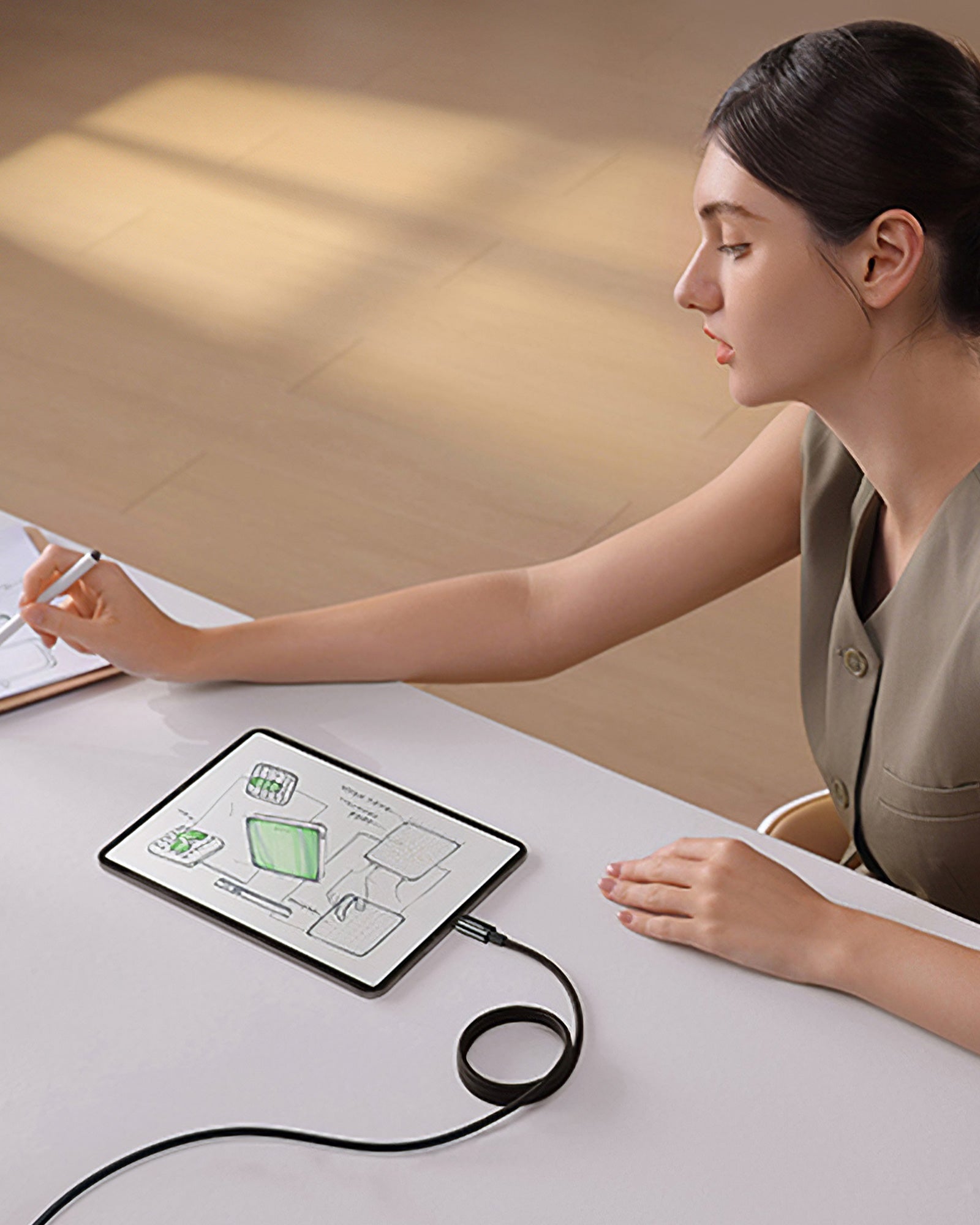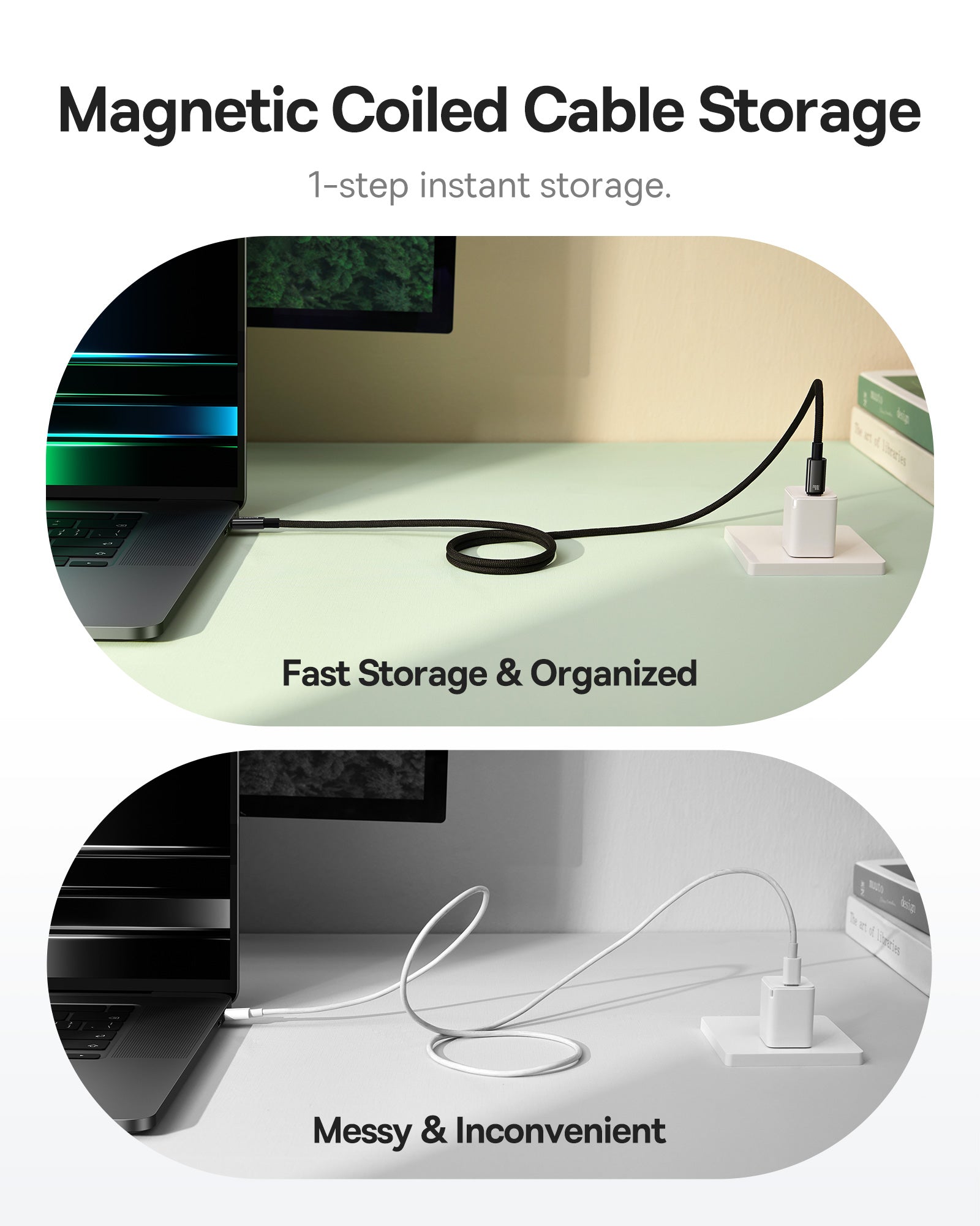 Kabel má vestavěné magnety, které nadnášejí přepravu, skladování a udržování pořádku. Kabel se sám sroluje a stabilně drží, což pomáhá optimalizovat pořádek na pracovišti.