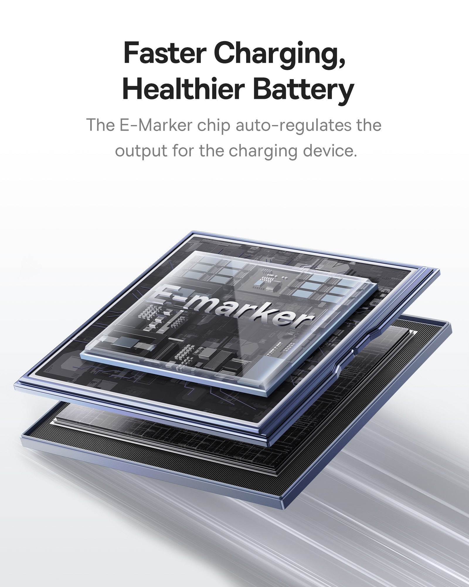Vybaven čipem E-Marker, který automaticky upravuje výstupní proud podle požadavků připojeného zařízení. Tím je zajištěno bezpečné nabíjení a ochrana baterie pro prodloužení její životnosti.