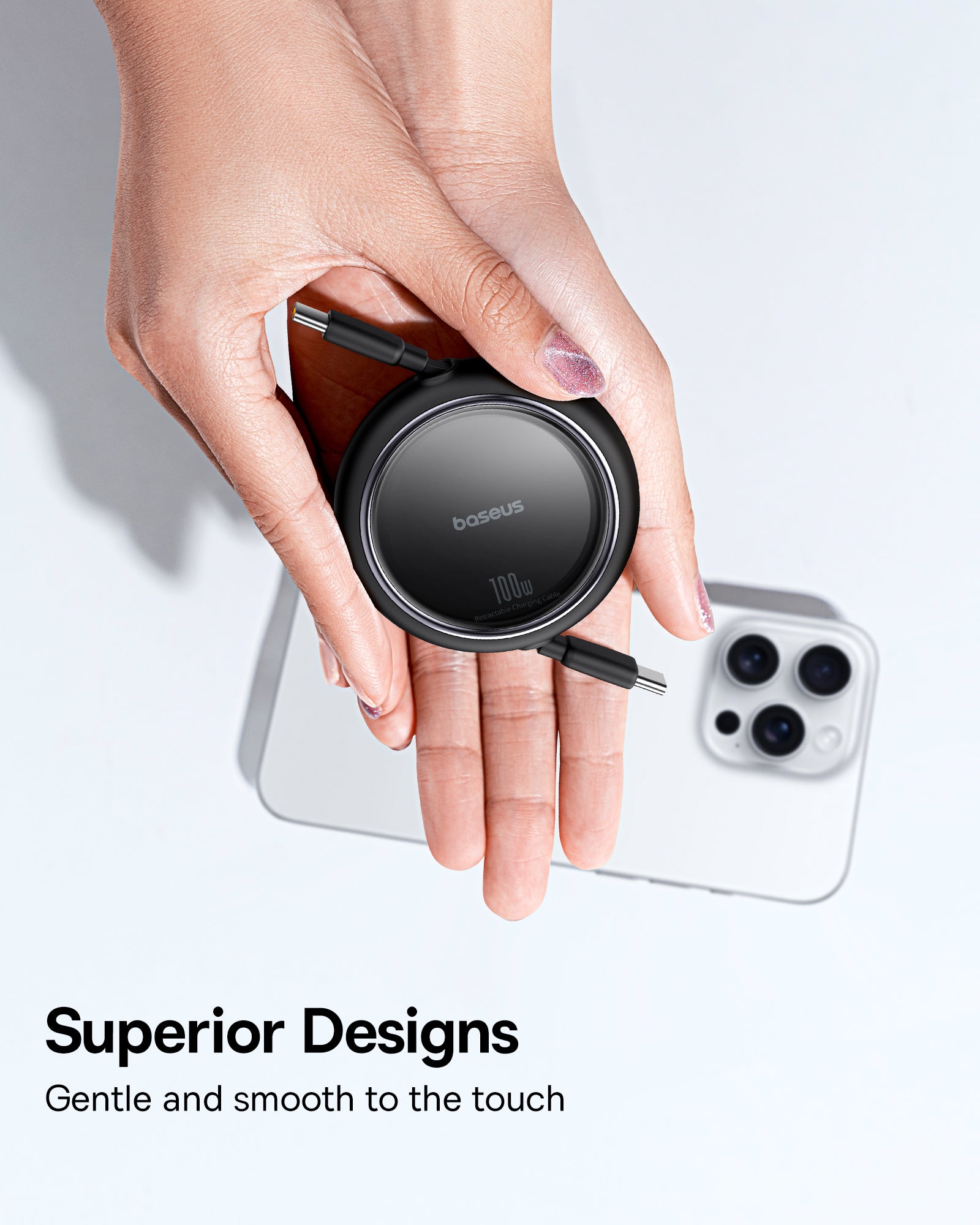 Baseus Free2Draw je 1 m dlouhý kabel se dvěma konektory USB-C, uložený v praktickém výsuvném pouzdru, které zajišťuje zamotání a dodává přenášení.