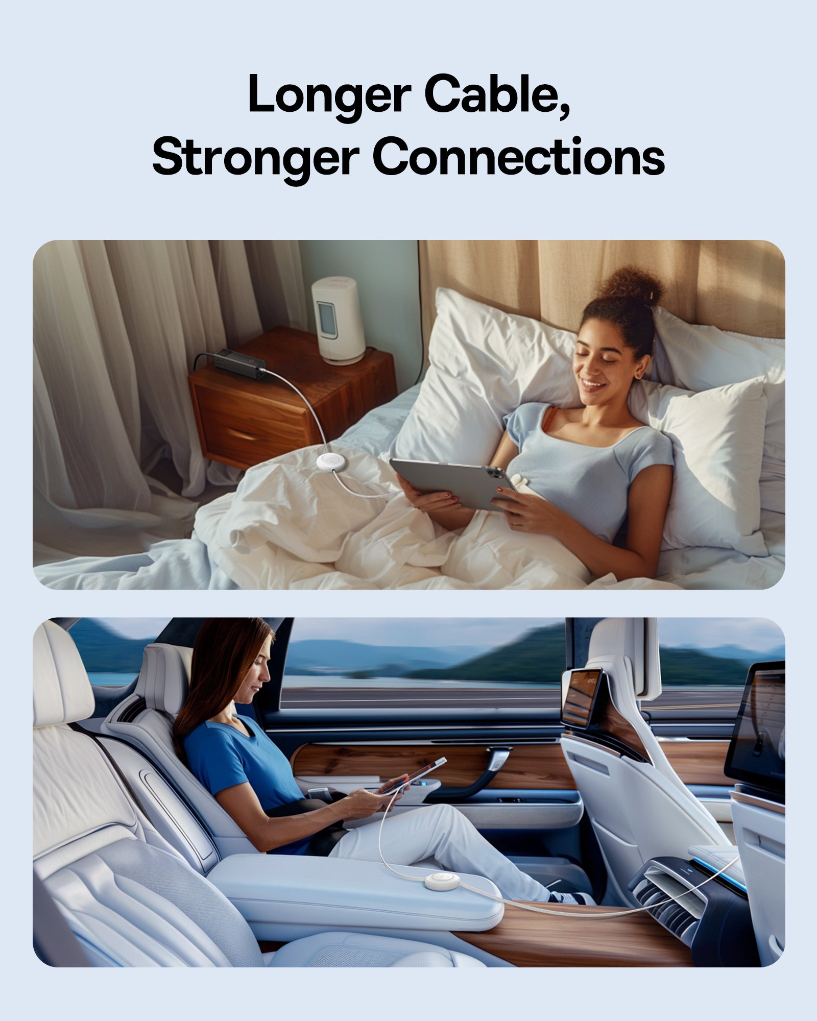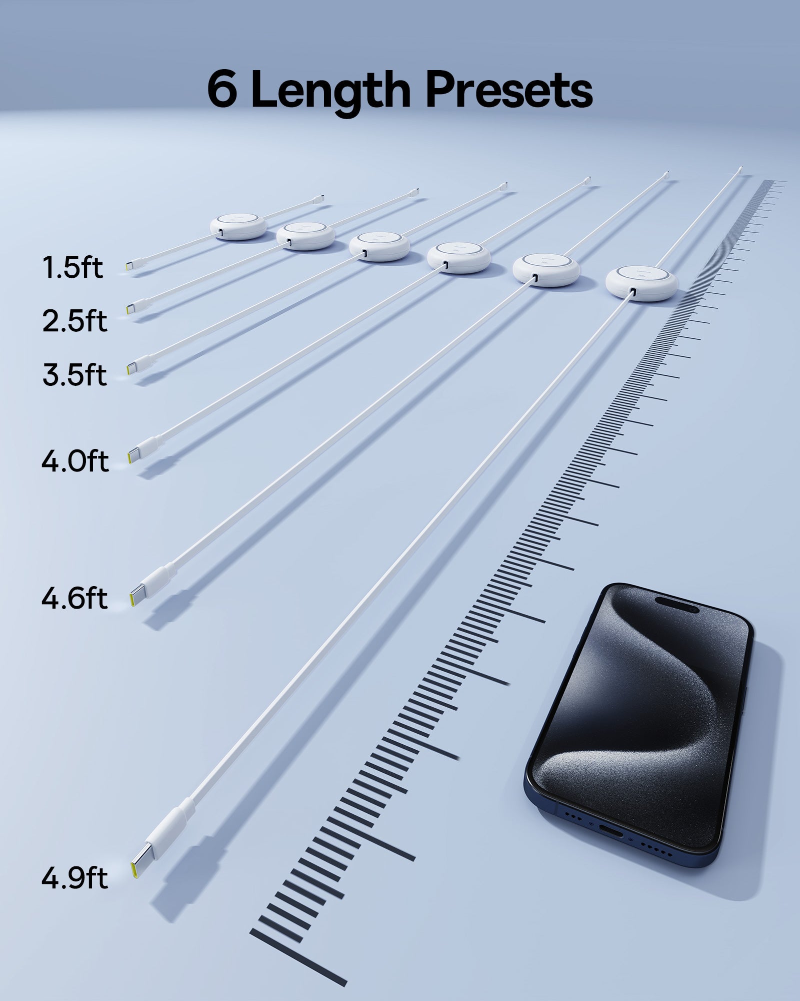 Rozšiřitelný kabel USB-C – USB-C s max. délkou 100 cm. Podporuje rychlé nabíjení Power Delivery až do 100 W a datový přenos 480 Mb/s. Kabel má vestavěný organizátor, díky kterému lze délku nastavit na libovolnou délku, a po vytažení z obou stran se rozvine na délku. Je navržen pro dlouhodobé používání a umožňuje používat telefon během nabíjení bez obav z přehřátí konektorů. Povrchová úprava PC + TPE a odolné konektory Typ-C – Typ-C zajišťují dlouhou životnost a spolehlivé zapojení i po mnoha připojeních. Inteligentní řídicí obvod reguluje podle parametrů zařízení a poskytuje víceúrovňovou ochranu proti přebíjení, přepětí, přehřátí, nadproudu, zkratu a EMI. Kabel kombinuje kompaktní, stylový design s praktickou funkcí organizace pro snadné nastavení délky.