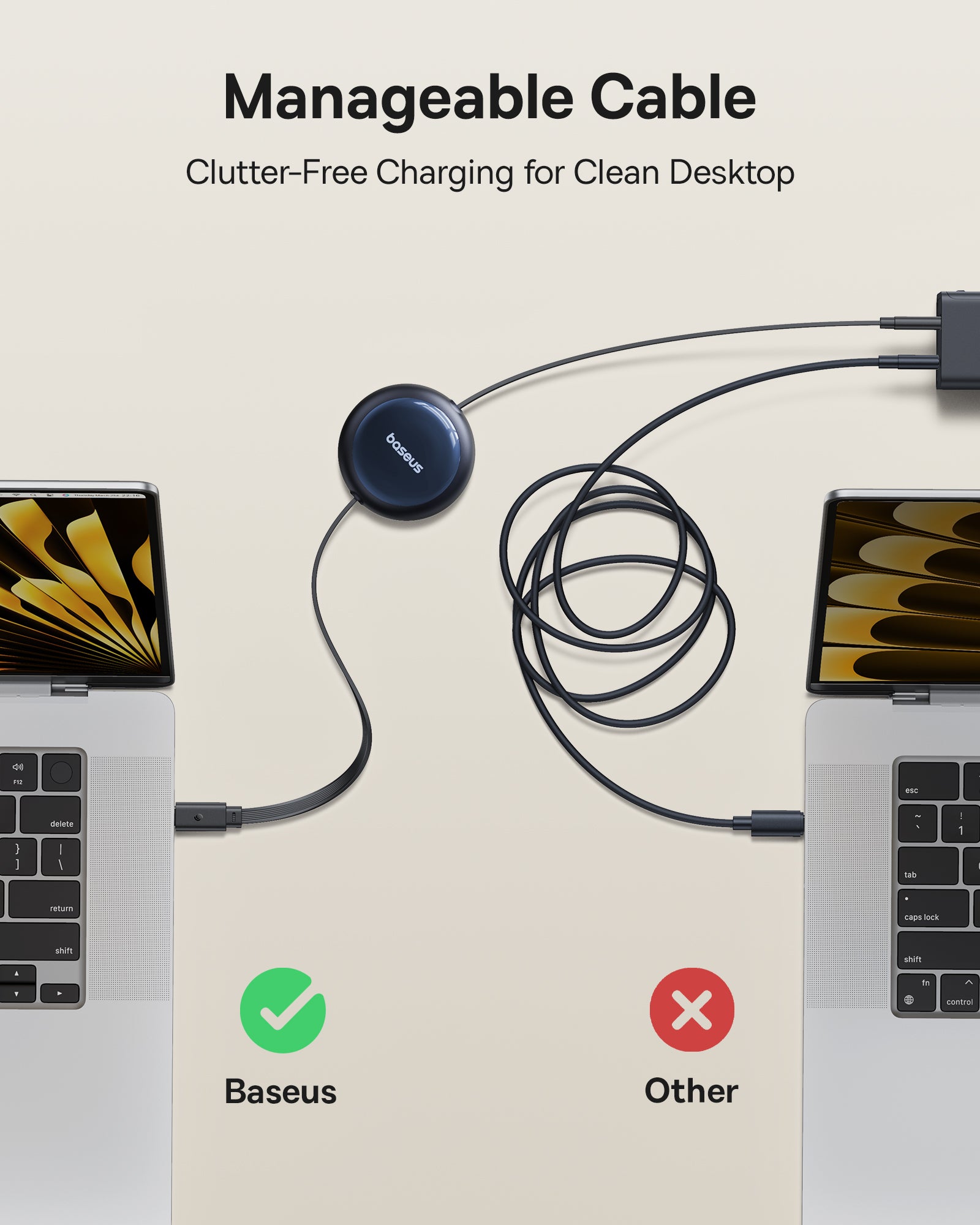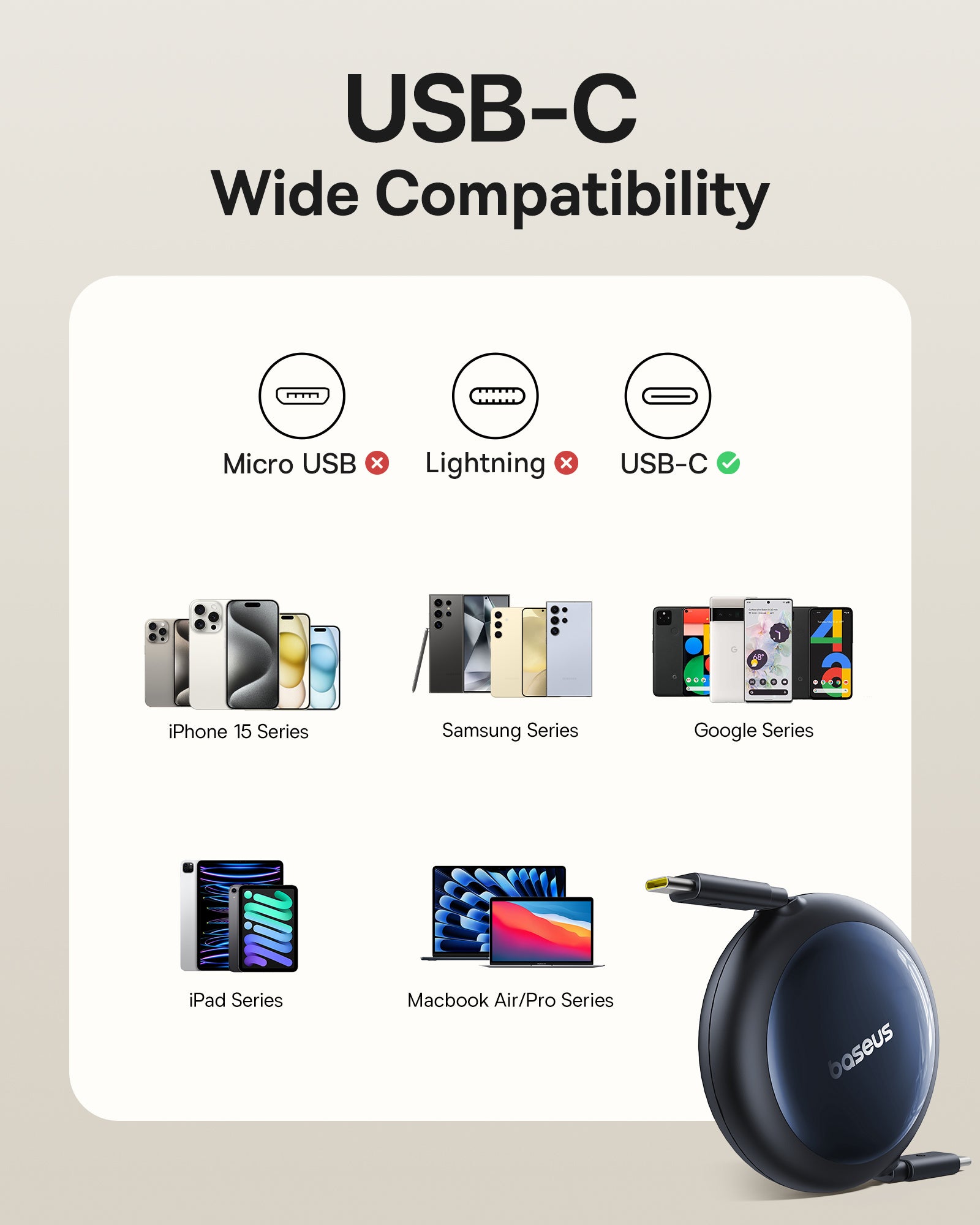 Tento 100 W zatahovací USB-C kabel nabízí až 100 W nabíjení a rychlý přenos dat pro všechna USB-C zařízení. Umožňuje rychlé nabíjení a okamžitý datový přenos. Kabel s výkonem 100 W je kompatibilní s většinou USB-C zařízení, jako jsou mobily, tablety i notebooky. Délka 1,5 metru poskytuje pohodlné použití a snadné uspořádání kabelu v domácnosti či kanceláři. Zatahovací konstrukce snižují a minimalizuje nepořádek.