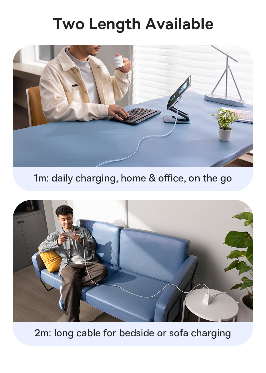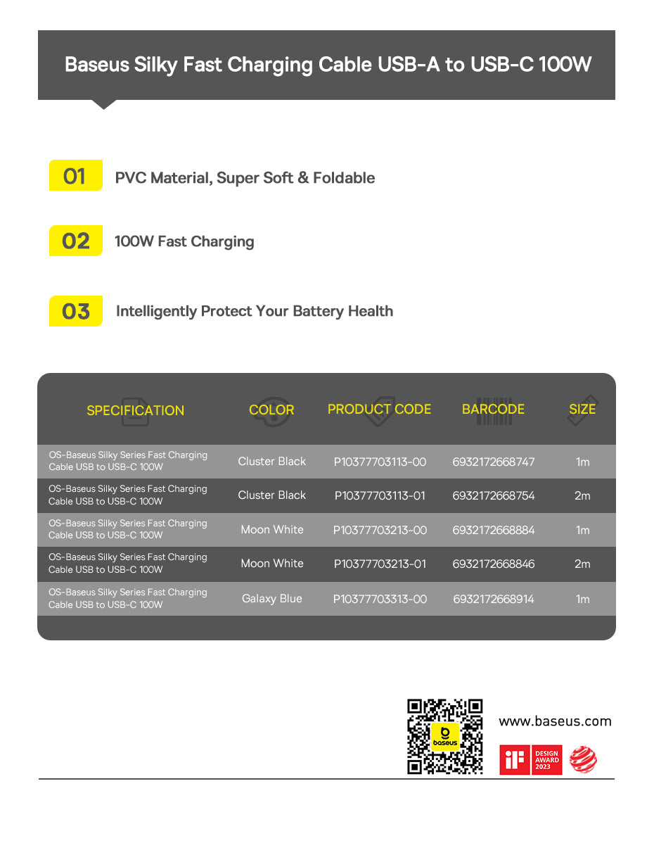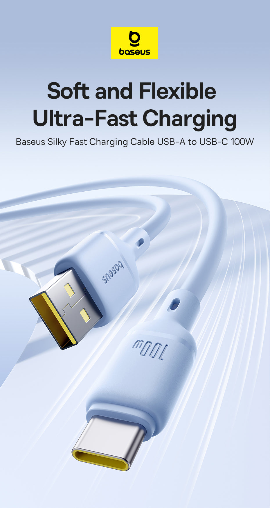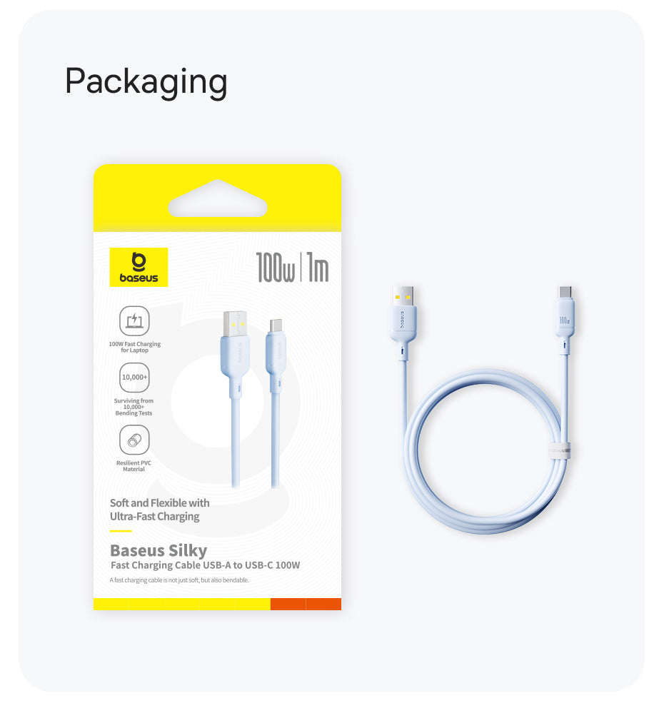 Baseus Silky je měkký a odolný nabíjecí kabel s podporou 100 W Power Delivery (PD). Je vhodný pro rychlé nabíjení iPhonu a dalších kompatibilních zařízení. Vyráběný z pružného PVC materiálu, odolný vůči ohýbání a lámání, což prodlužuje životnost. Díky inteligentnímu čipu automaticky rozpozná připojené zařízení a optimalizuje proud i napětí pro bezpečné a efektivní nabíjení bez přehřívání. Podporuje datový přenos rychlostí až 480 Mb/s (USB 3.0) pro rychlou synchronizaci souborů.
